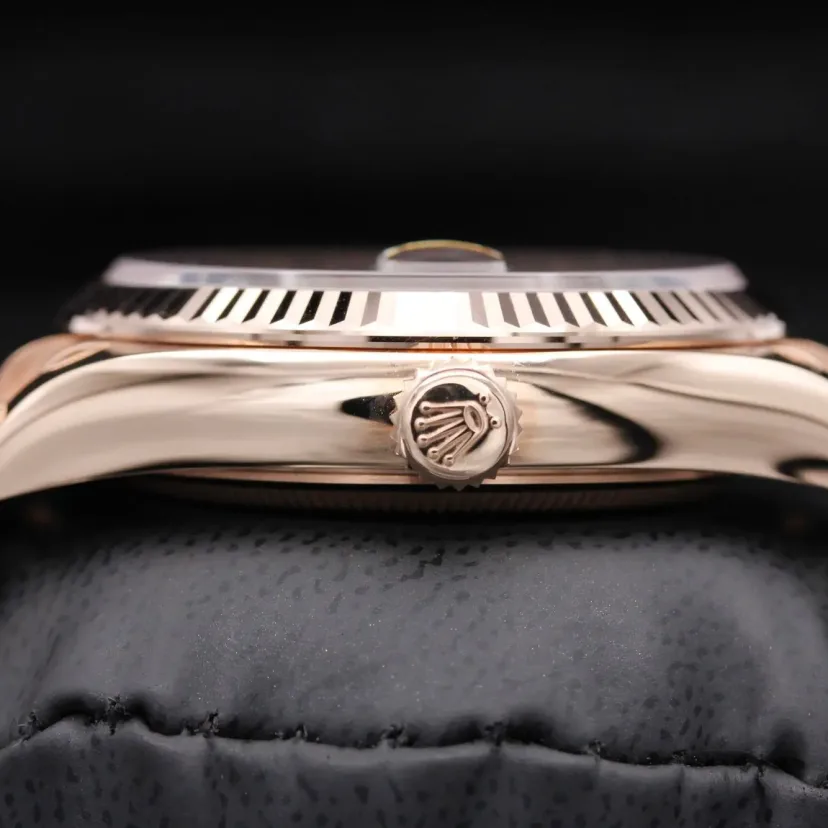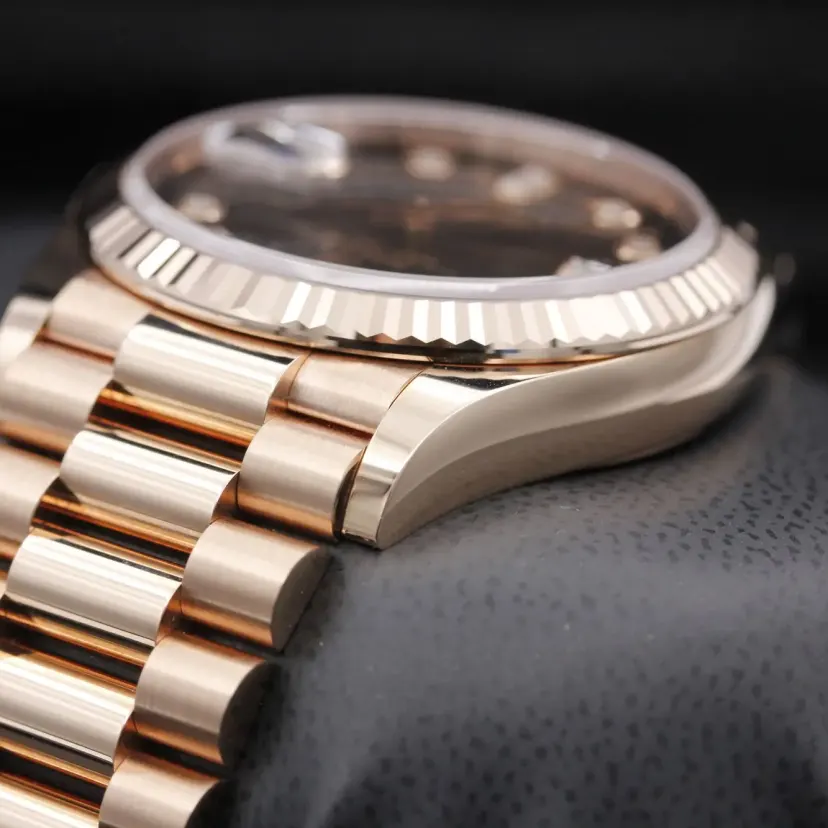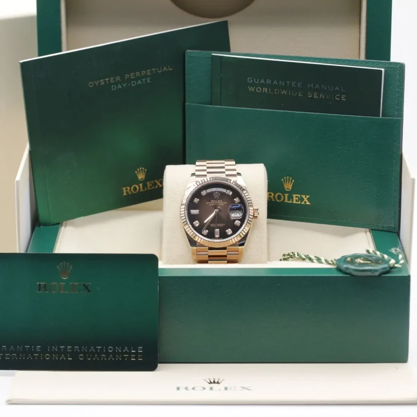 Rolex Perpetual Day-Date 36 Watch of 18k Everose Gold. Brown ombré dial set with diamonds. The 18k Everose Gold fluted bezel. The 18k Everose Gold President bracelet, 128235-0037. Rolex Perpetual Day-Date 36 Watch of 18k Everose Gold. Brown ombré dial set with diamonds. Hour markers are Diamonds in 18 ct gold settings and baguette-cut diamonds at 6 and 9 o'clock. Screw-down solid crown with twin lock double waterproofness system. Scratch-resistant sapphire crystal with cyclops lens over the date. The watch has central hour, minute, and second hands. Instantaneous day and date in apertures, unrestricted rapid setting. Stop-seconds for precise time setting. The 18k Everose Gold fluted bezel. The Watch comes with Mechanical Self-winding Movement & 3255 Caliber w/ 31 jewels & 70 hours power reserve. The 18k Everose Gold President with concealed folding Crownclasp. The Watch is with a Rolex Watch box, Rolex Warranty Card. Covered with Rolex Warranty.