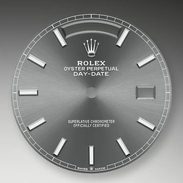 Rolex Perpetual Day-Date 40 Watch of 18k White Gold, and diamonds. A black dial with hour markers is a stick. The 18k White Gold set with diamonds bezel. The President bracelet of 18k White Gold, 228349rbr-0002