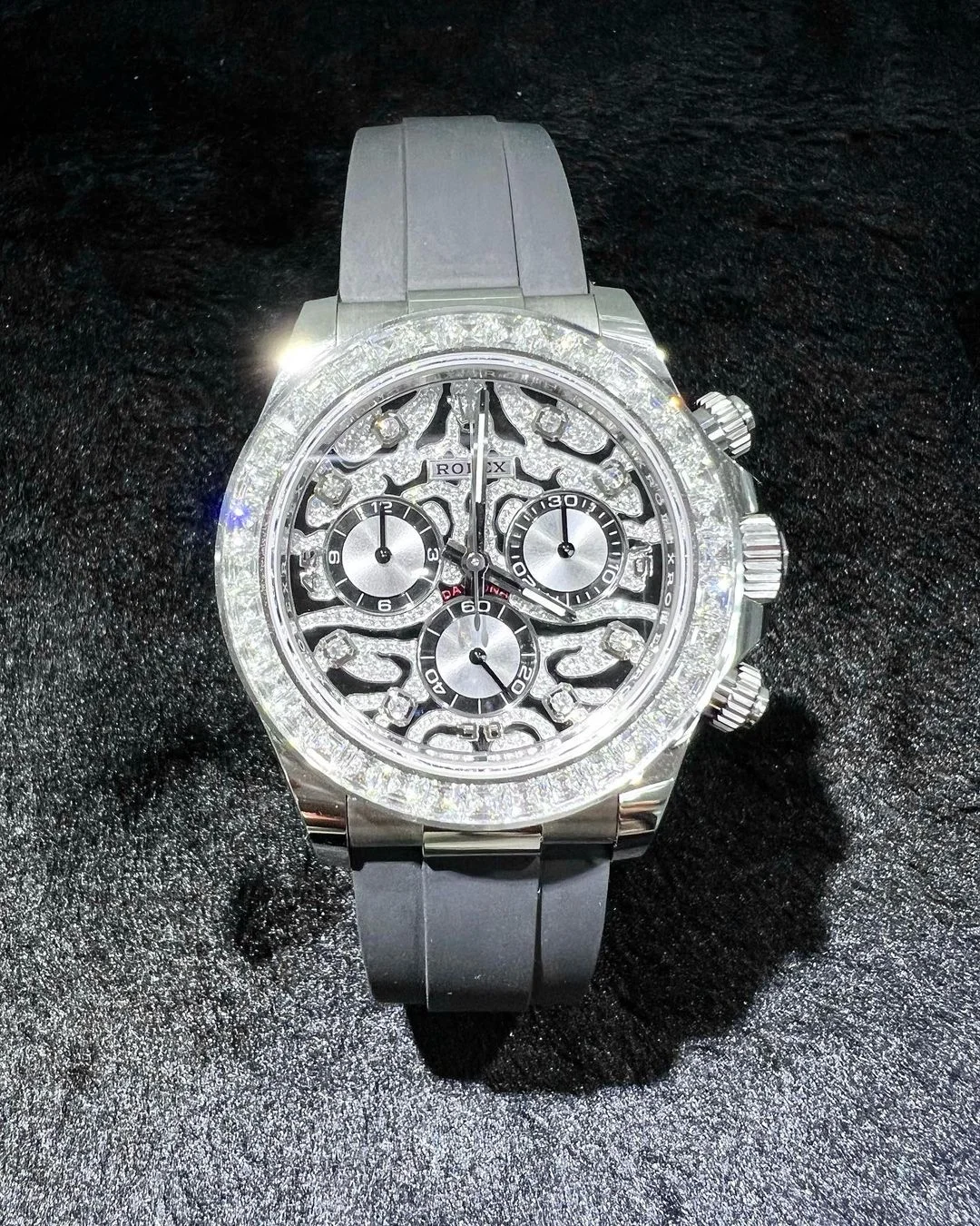 A Rolex Daytona with diamonds is not something new but one with a dial like the 116588TBR sure is! The black-lacquered dial has an applied 18k yellow-gold and diamond-set, wavy structure on the surface, which can remind you of a tiger's fur.