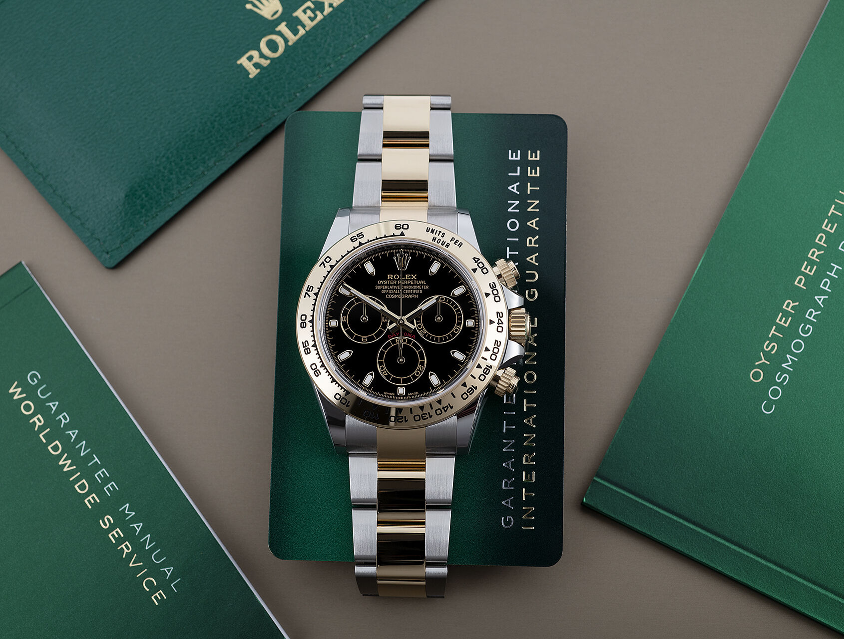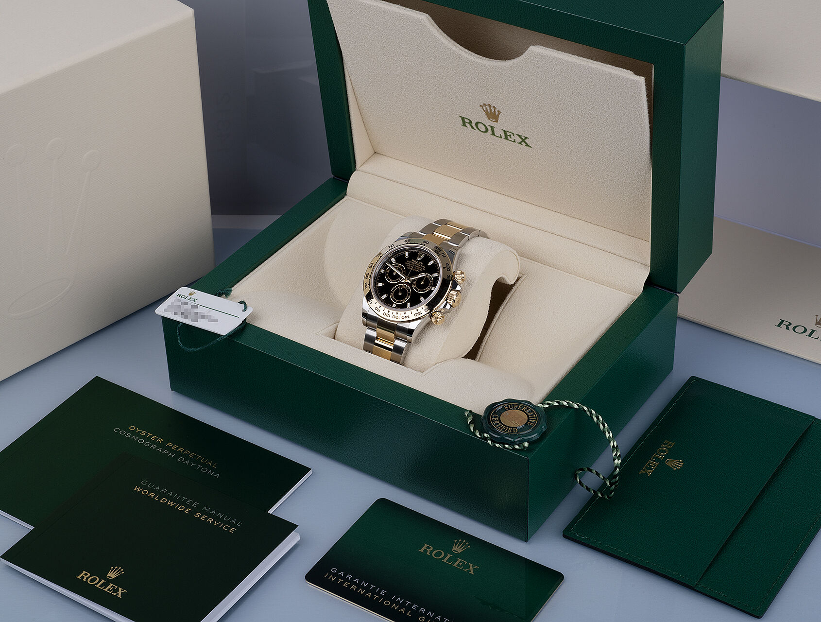 The new Rolex Cosmograph Daytona 116503-0004 has a dial diameter of 40 mm. The watch has a black dial. The case is a yellow gold steel case - a combination of oyster steel and 18 karat gold and houses the 4130 movement with a 72 hour power reserve. Yellow Gold Steel Bracelet - A combination of oyster steel and 18 karat gold with folding Oyster Lock safety clasp. Water resistant up to 100 m. When you order this watch, we will provide it with a Rolex certificate and packaging box, and enjoy a 3-year warranty.