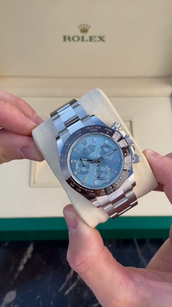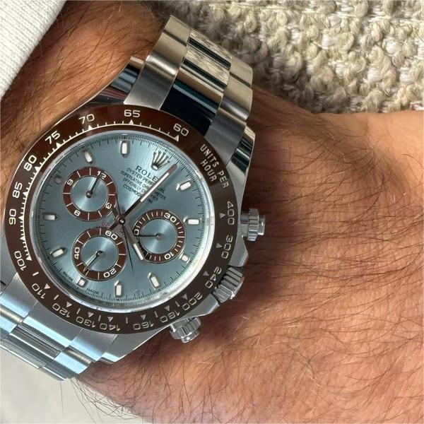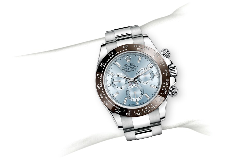 This Oyster Perpetual Cosmograph Daytona in platinum with an ice blue dial and Oyster bracelet, features a chestnut brown Cerachrom bezel with tachymeter scale.