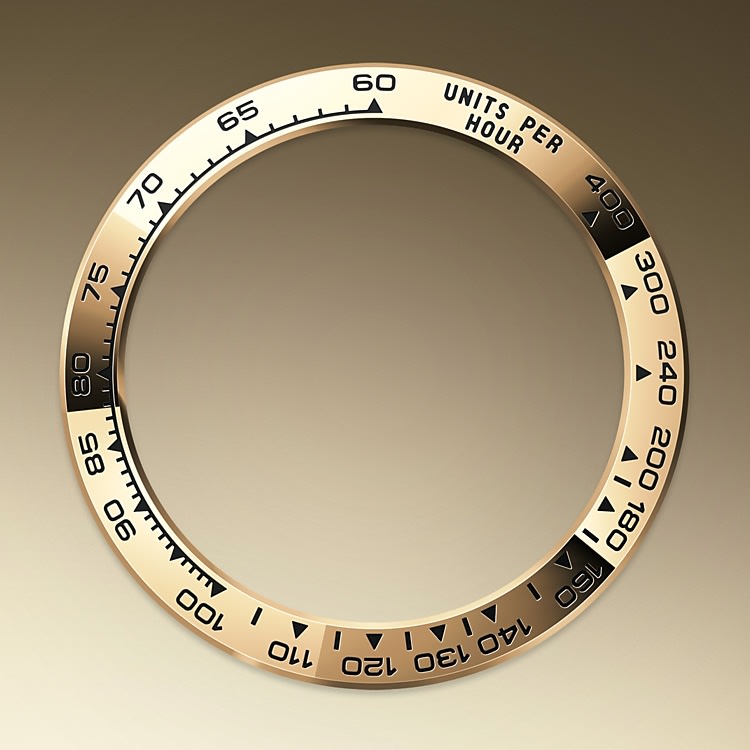 BEZEL: Fixed, with engraved tachymetric scale, in 18 ct yellow gold