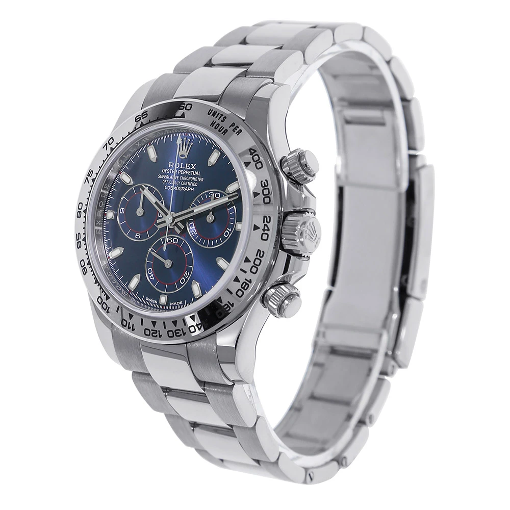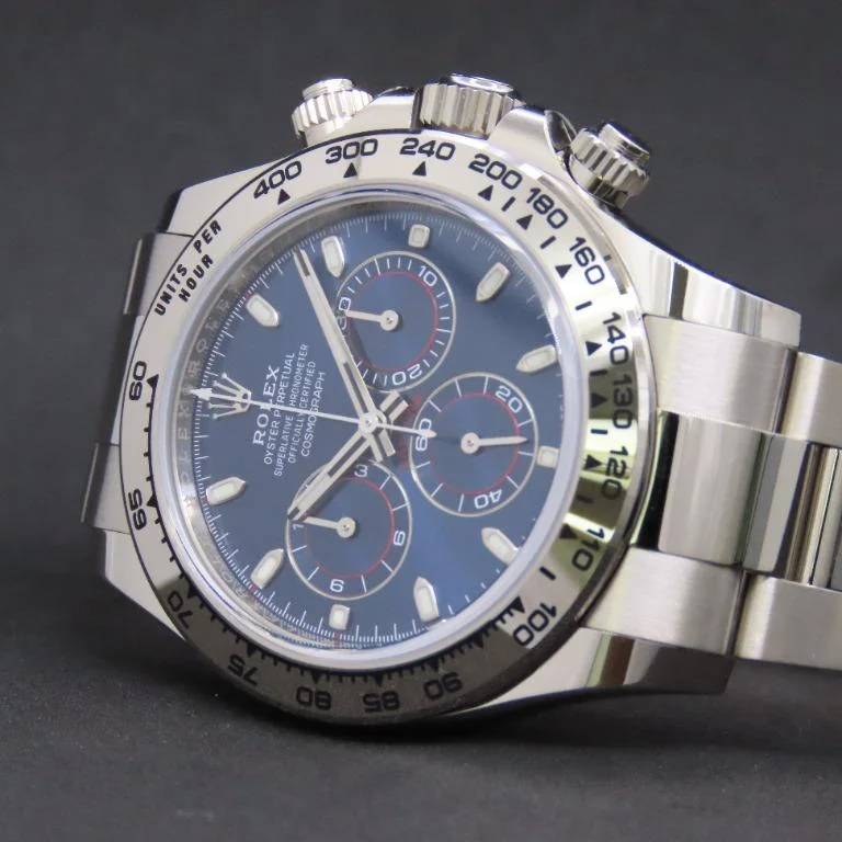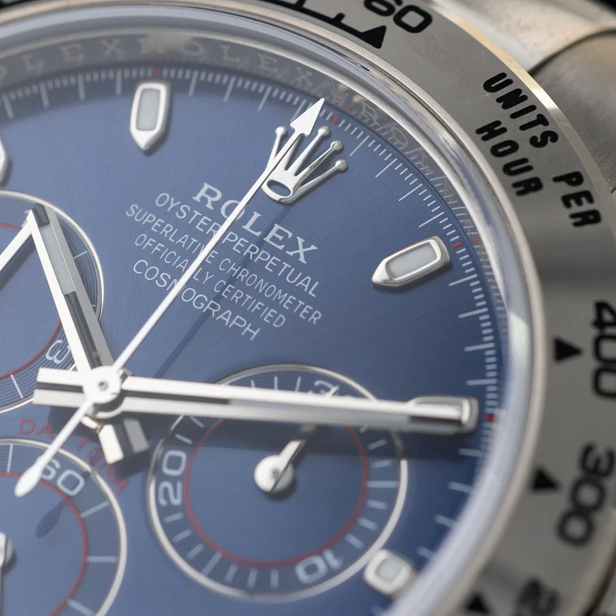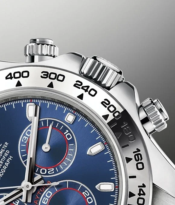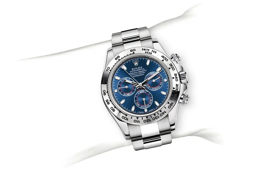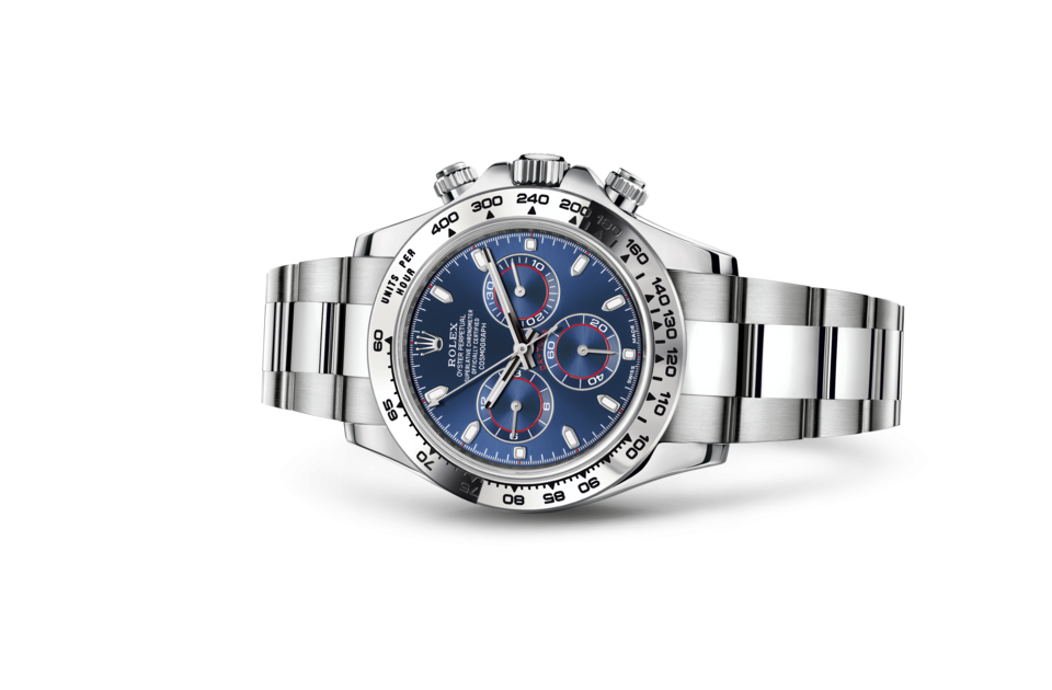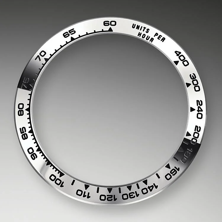 BEZEL : Fixed, with engraved tachymetric scale, in 18 ct white gold