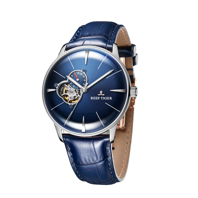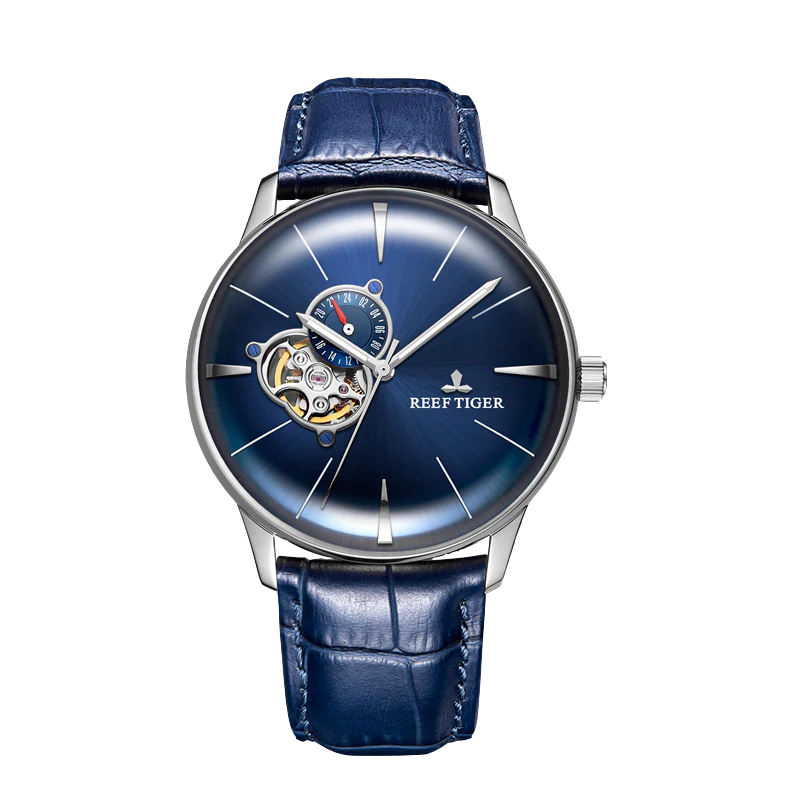 Reef Tiger Classic RGA8239 Fashion Mens Automatic Mechanical Watch with Design Blue Tourbillon Style Dial Display Wrist Watches