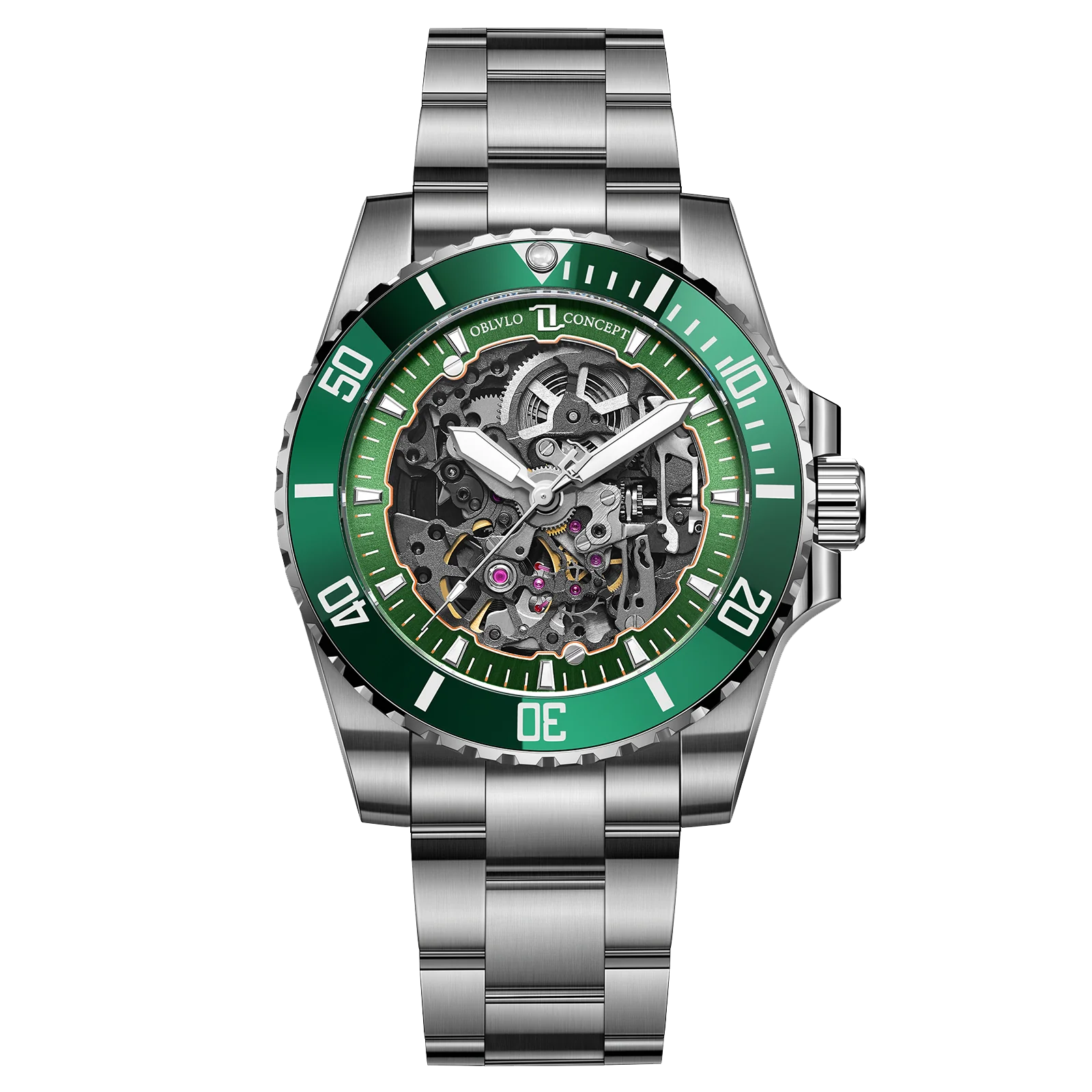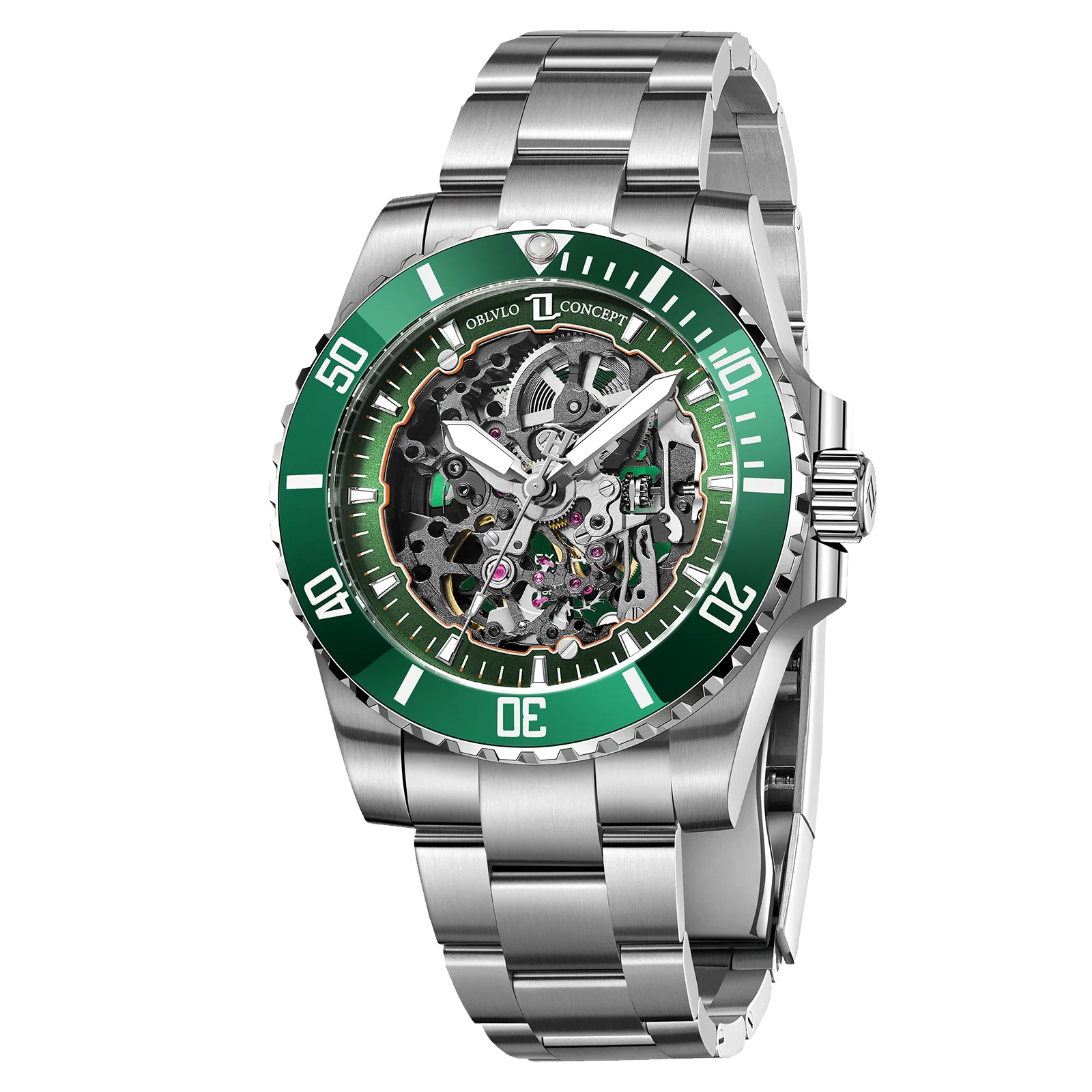 OBLVLO DM-S Mens Green Ceramic Bezel Automatic Skeleton Watch - Luxury Diving Luminous Automatic Waterproof Watch