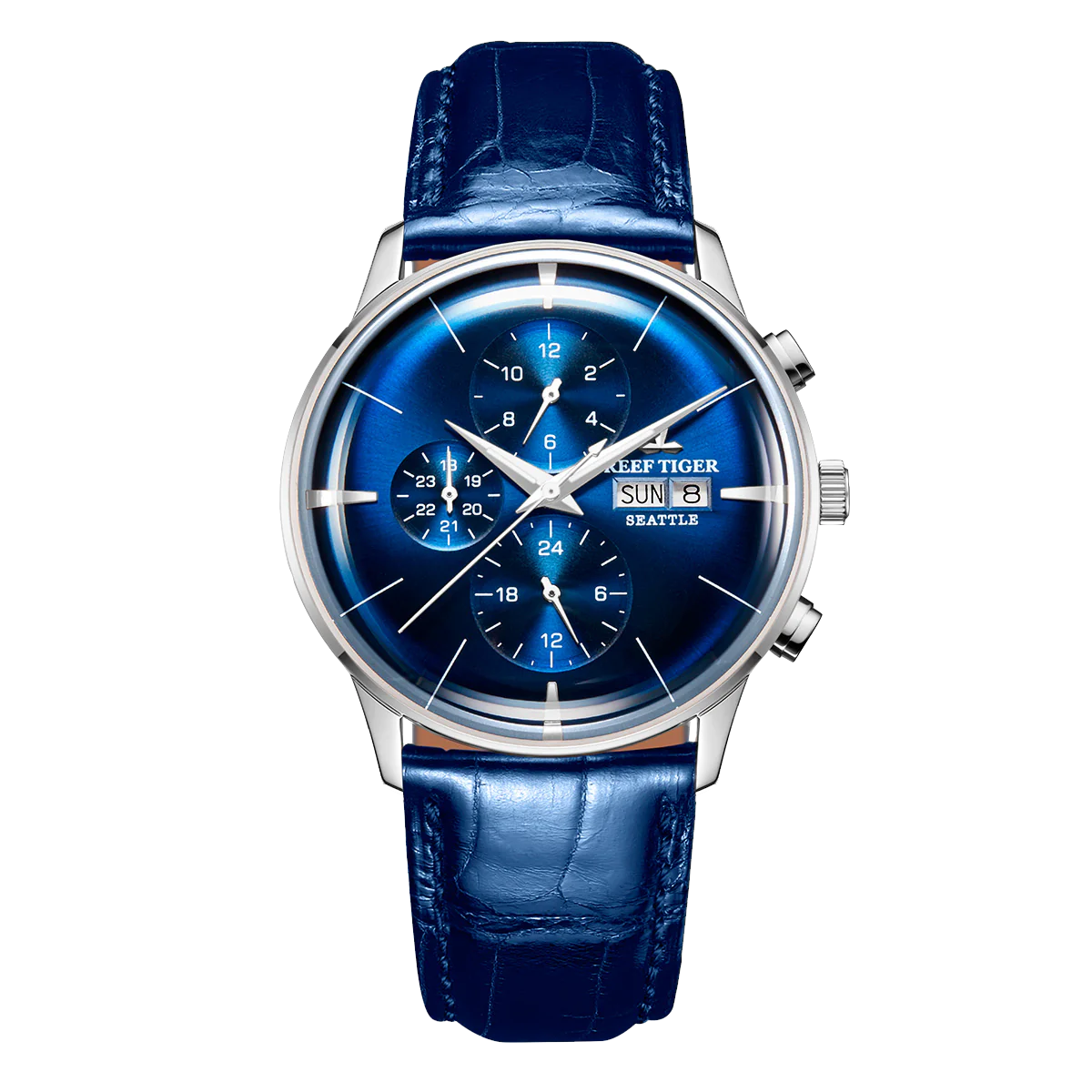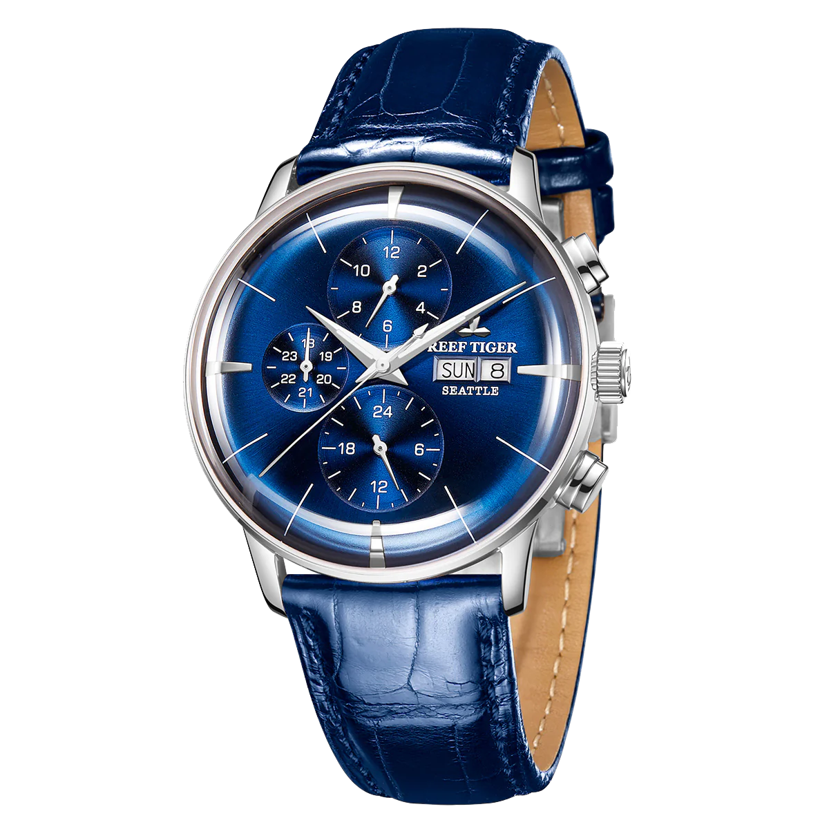 Luxury Mens Automatic Mechanical Blue Dial Dress Watch - Reef Tiger RGA1699 Multifunction Three Eyes Subdial