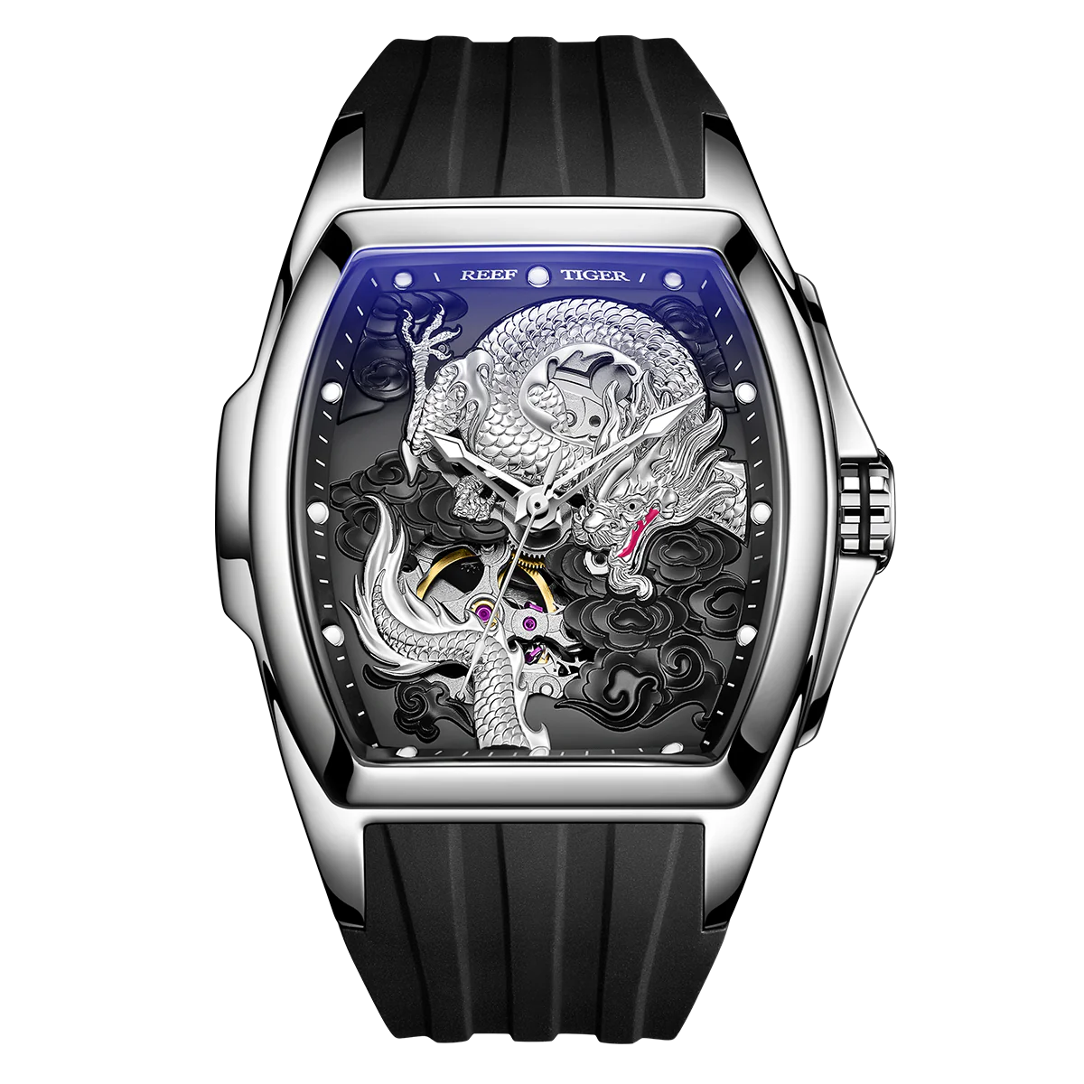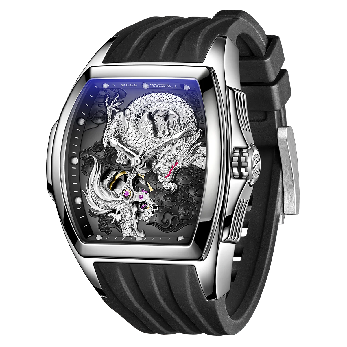 Affordable Luxury Mens Silver Dragon Watches - Reef Tiger RGA3061 Unique Automatic Mechanical Watch