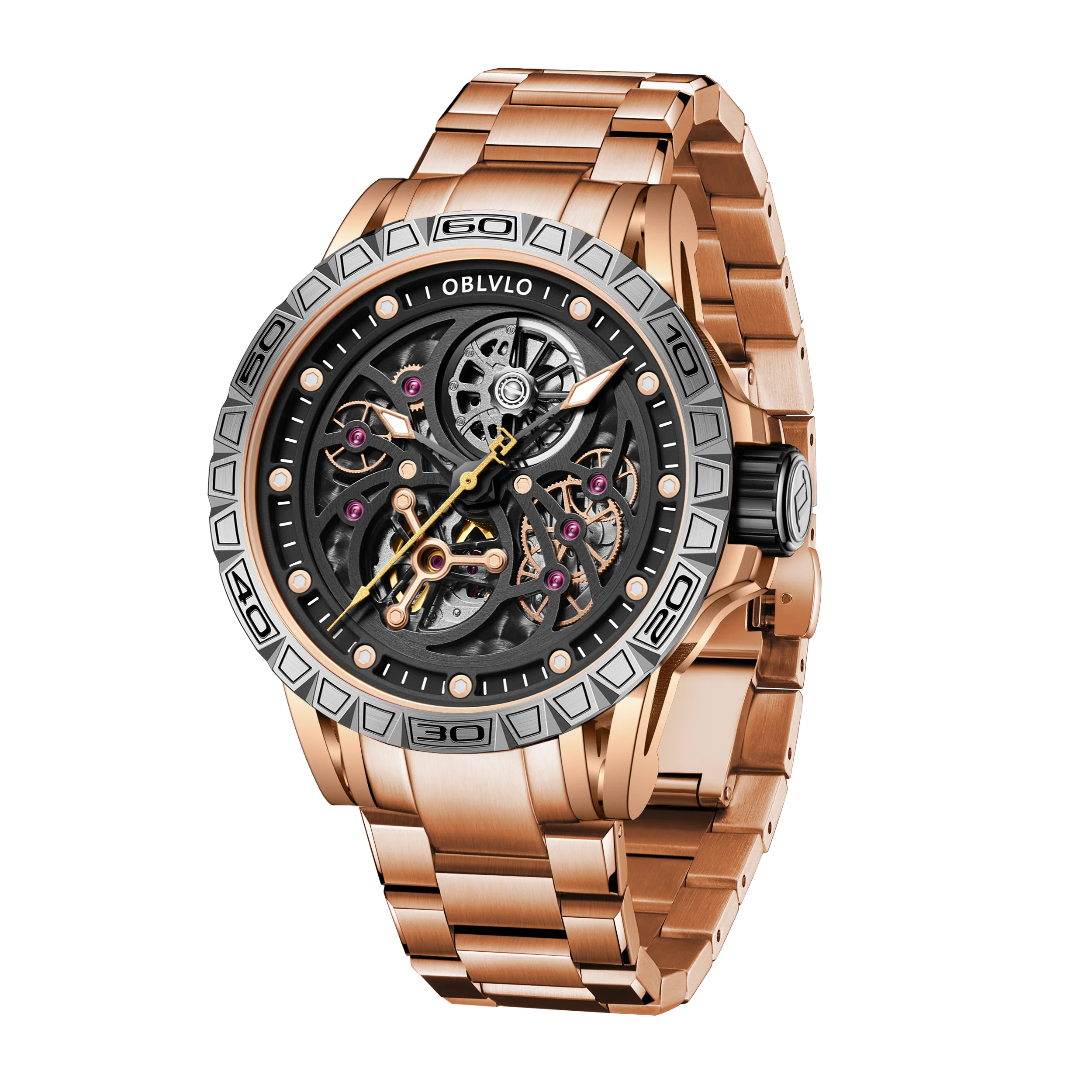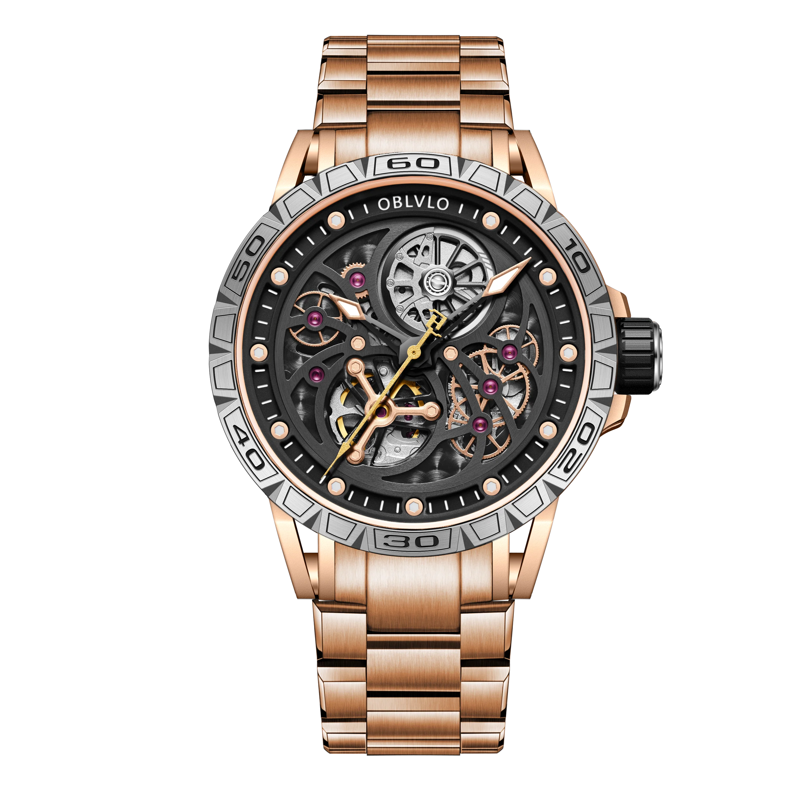 OBLVLO LMS Affordable Luxury Rose Gold Skeleton Mechanical Watches - Fashion Mens Rubber/Leather Strap Waterproof Watch