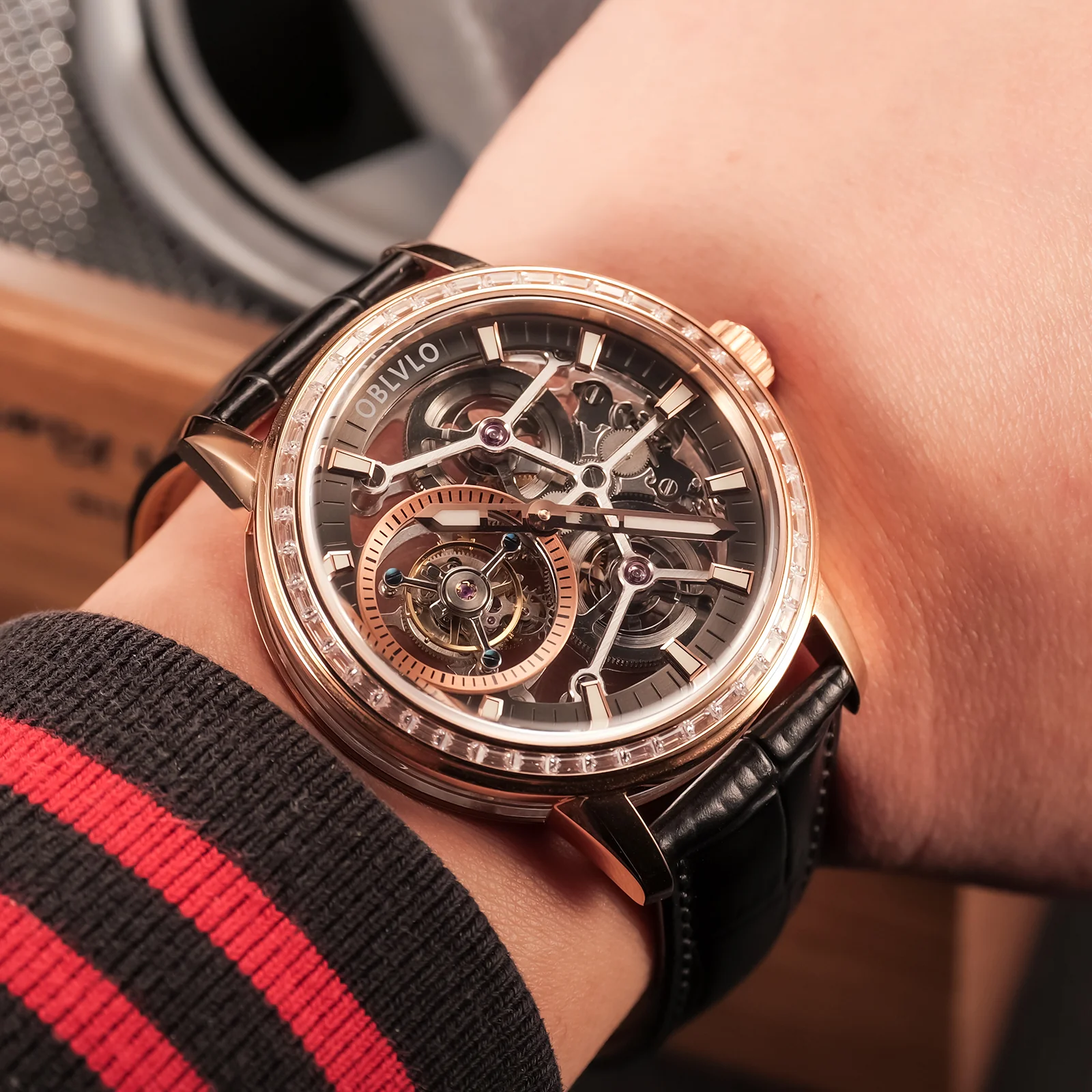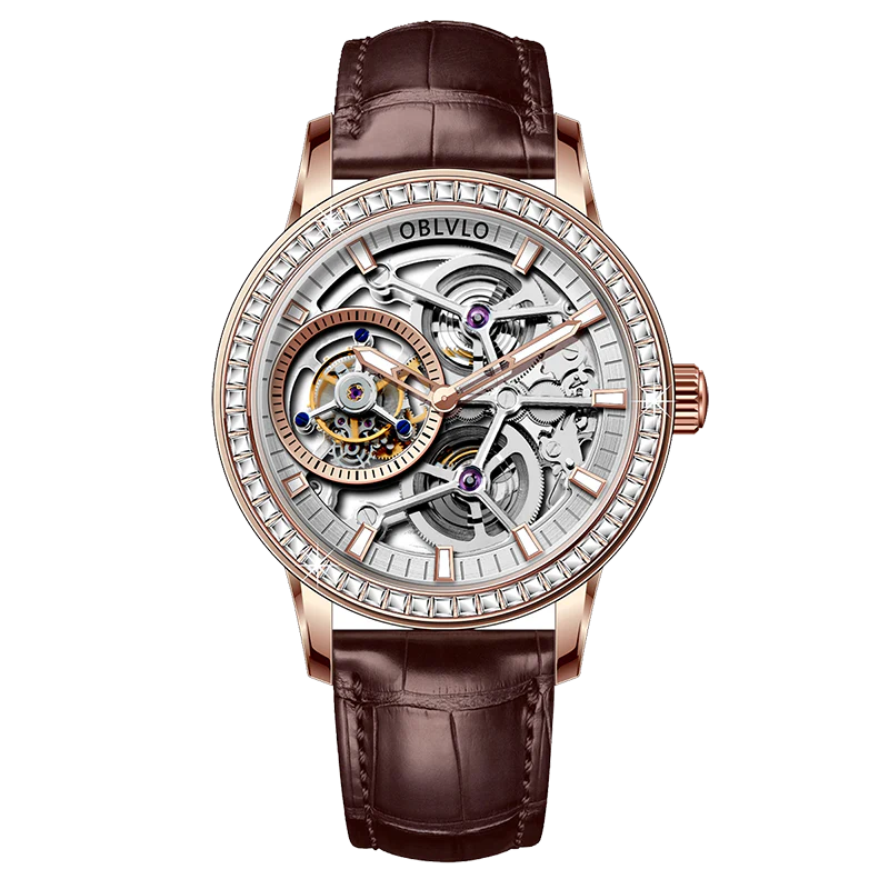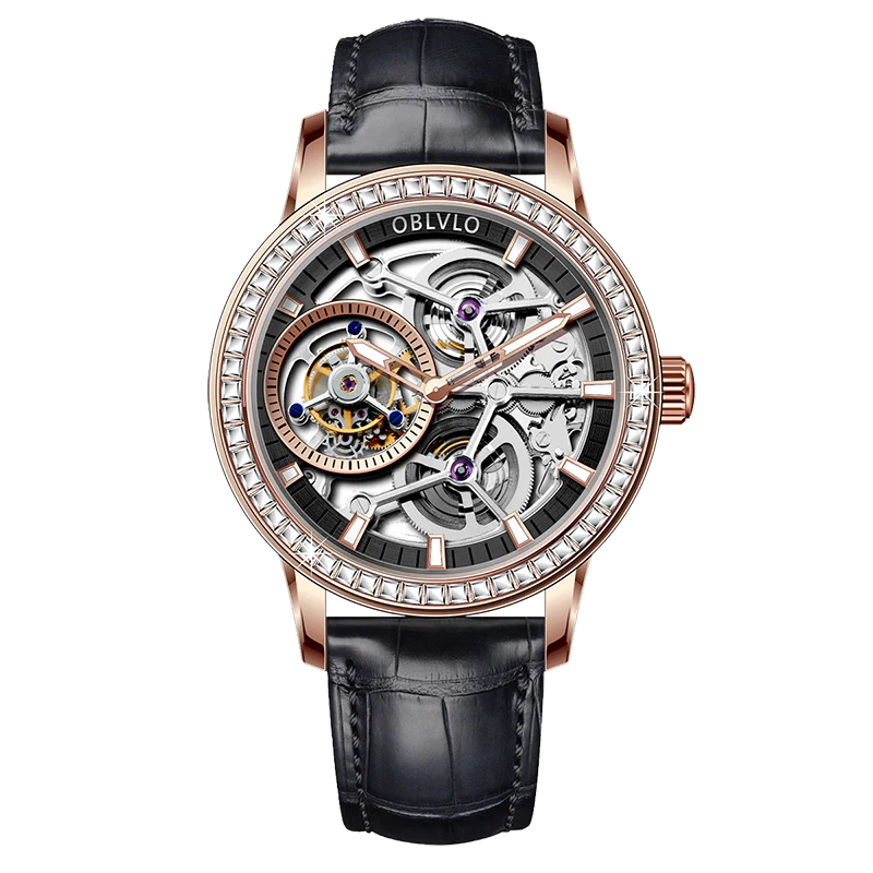 Luxury OBLVLO VM TB Rose Gold & Diamond Tourbillon Watches For Men - Fashion Casual Mens Wrist Watch