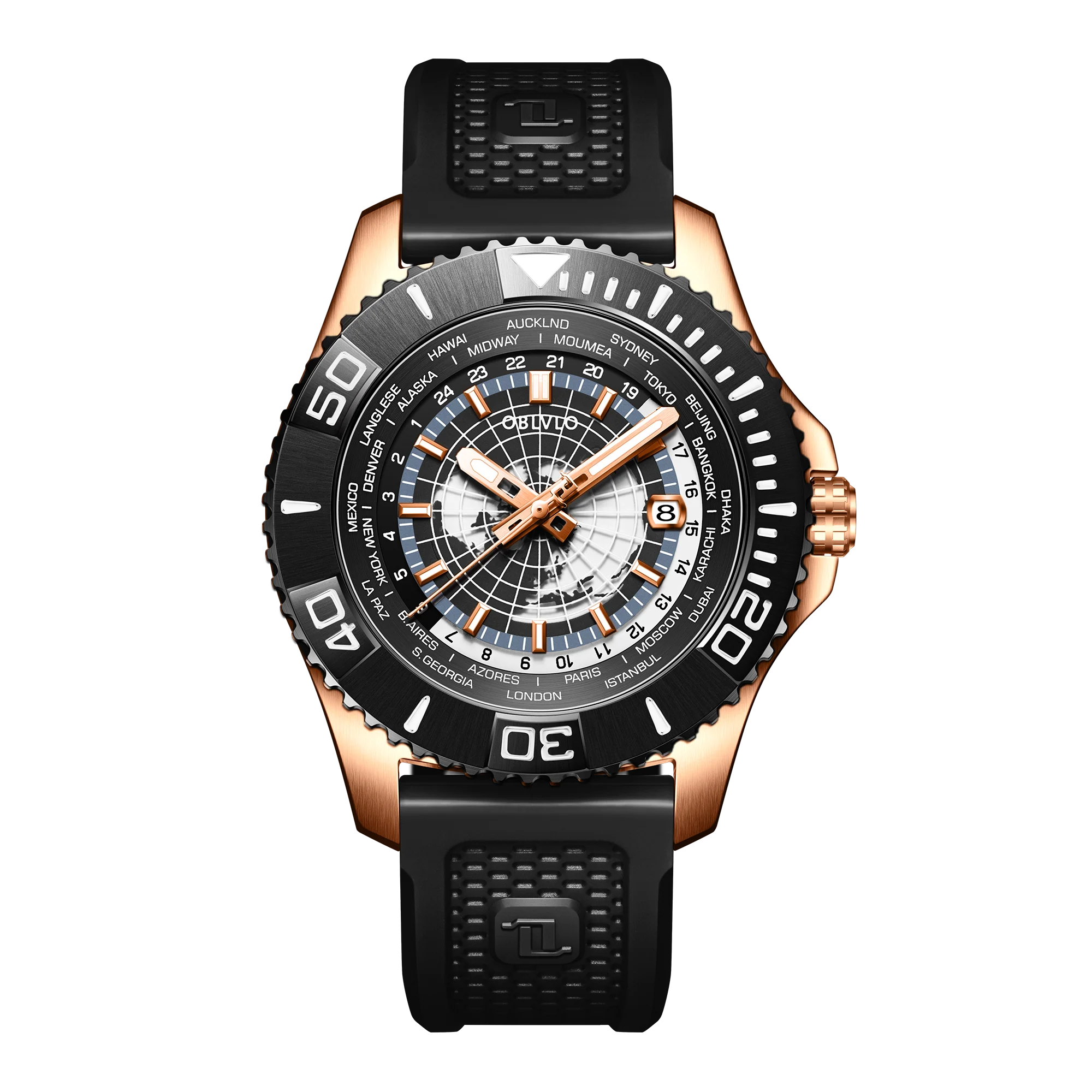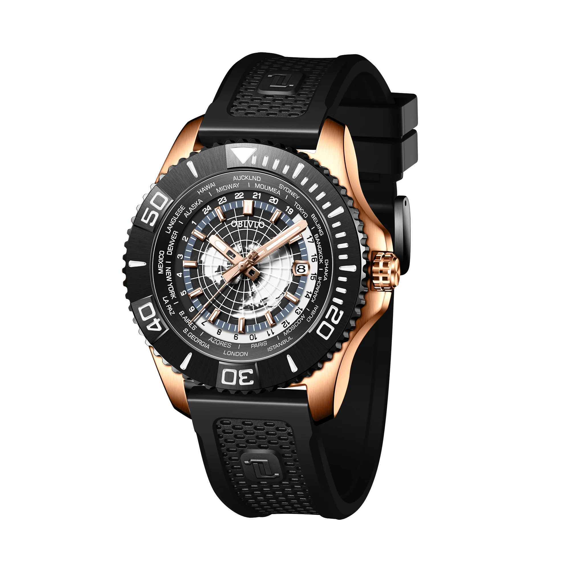 OBLVLO BM Mens 43mm Automatic Military Dive Rose Gold & Black Ceramic Bezel Watches