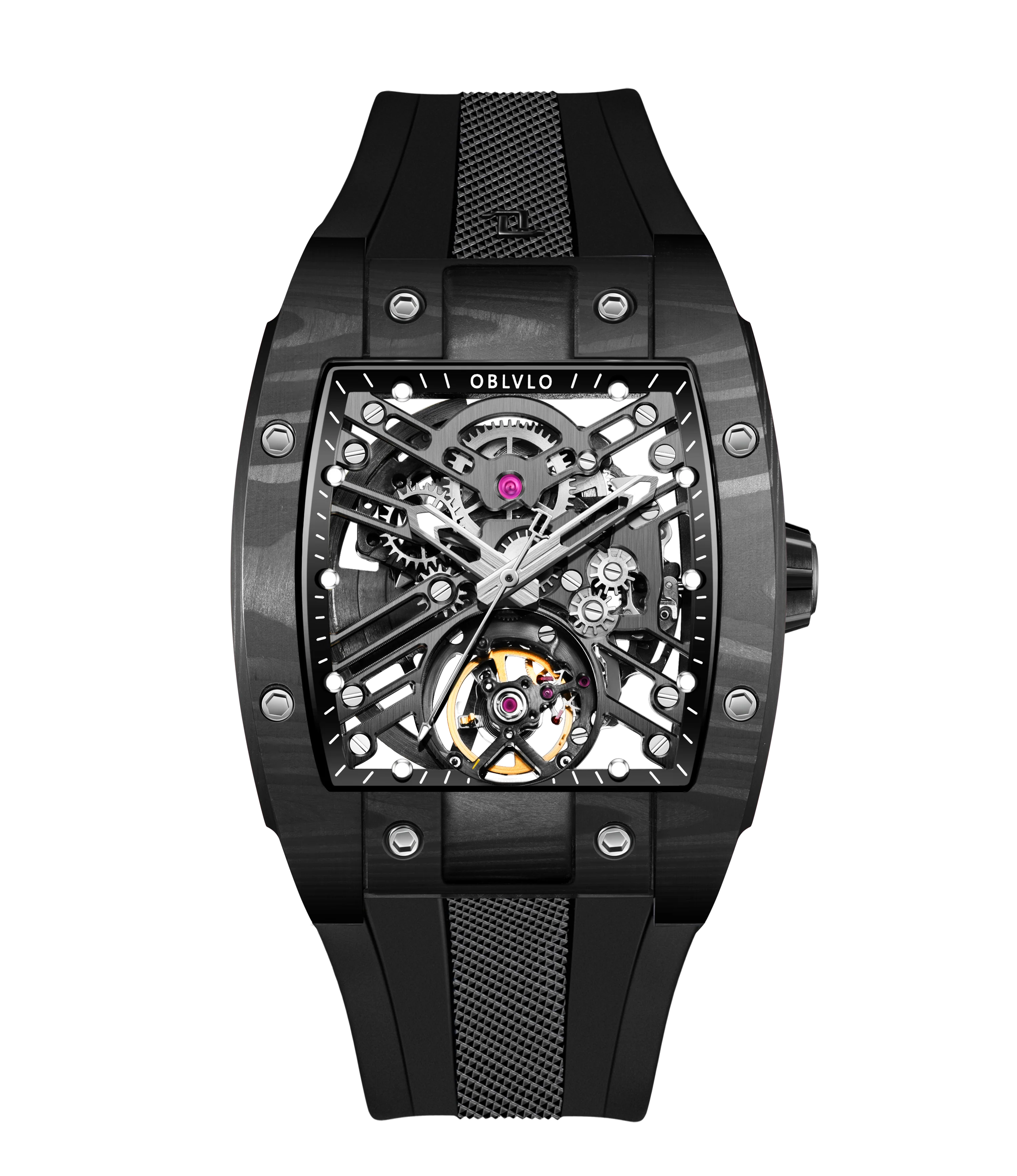 OBLVLO EM-ST Luxury Black Carbon Fiber Skeleton Mechanical Mens Watches