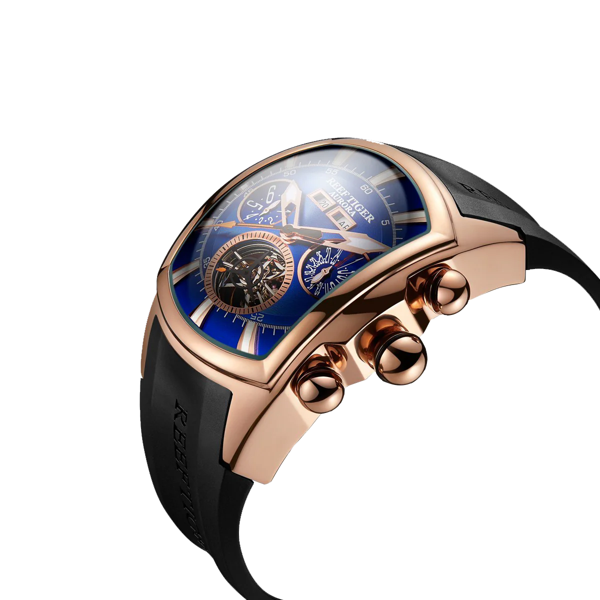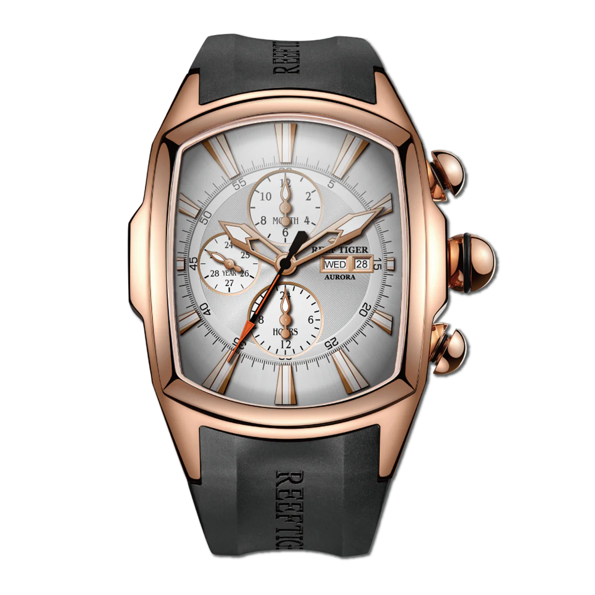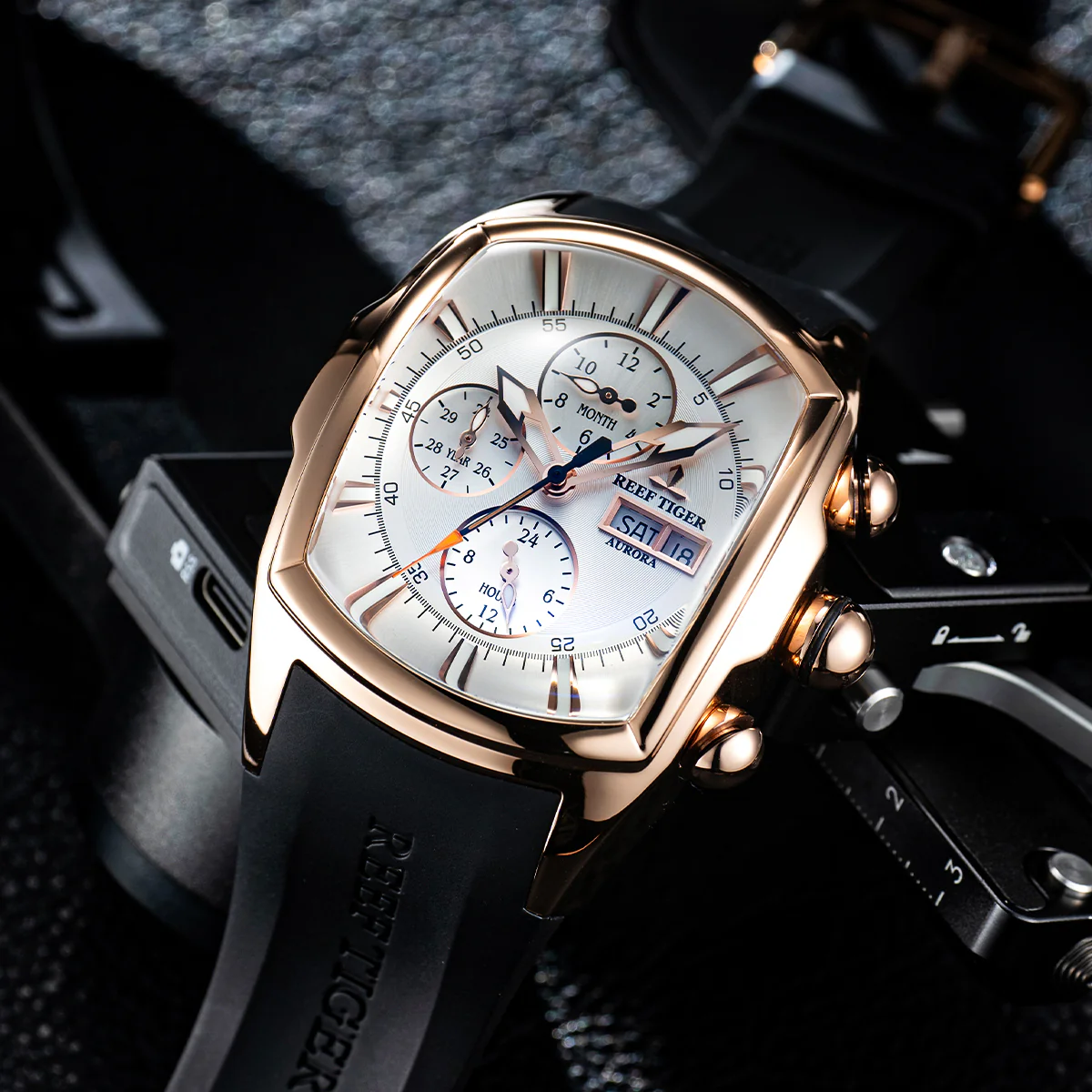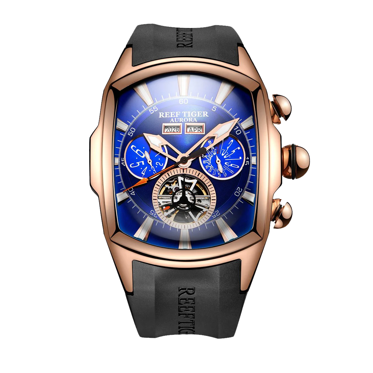 Best Multifunctional Three-eye Mens Watches for Sale - Reef Tiger Tank-P RGA3069 Tonneau Rose Gold Automatic Watch