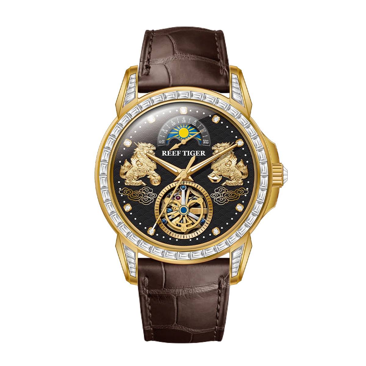 Reef Tiger "Pixiu" RGA1935 - Luxury Yellow Gold Mens Moon Phase Automatic Tourbillon Style Dial & Diamond Design Dress Watches