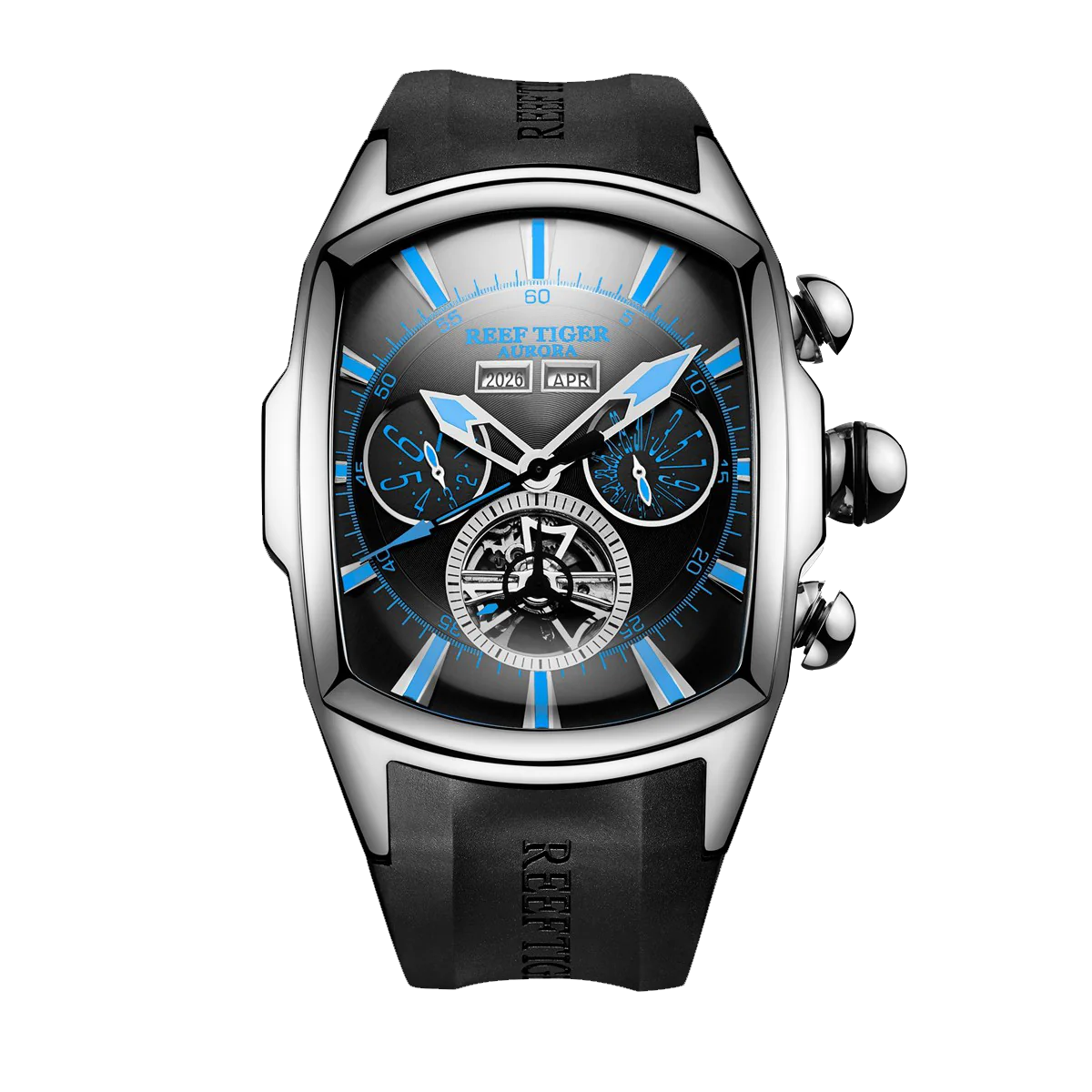 Reef Tiger Aurora Tank II RGA3069 Mens Automatic Self Winding Mechanical Skeleton Black Dial/Rubber Wrist Watch