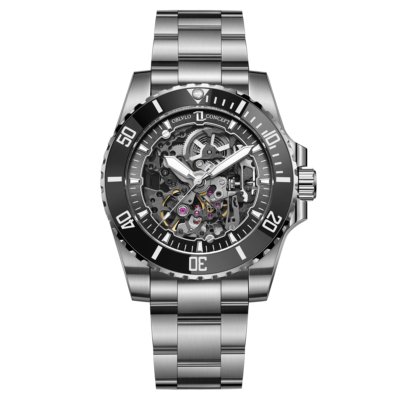 OBLVLO DM-S Luxury Mens Skeleton Stainless Steel Mechanical Automatic Watch - Skeleton Dial Blue Luminous Waterproof Sport Watches