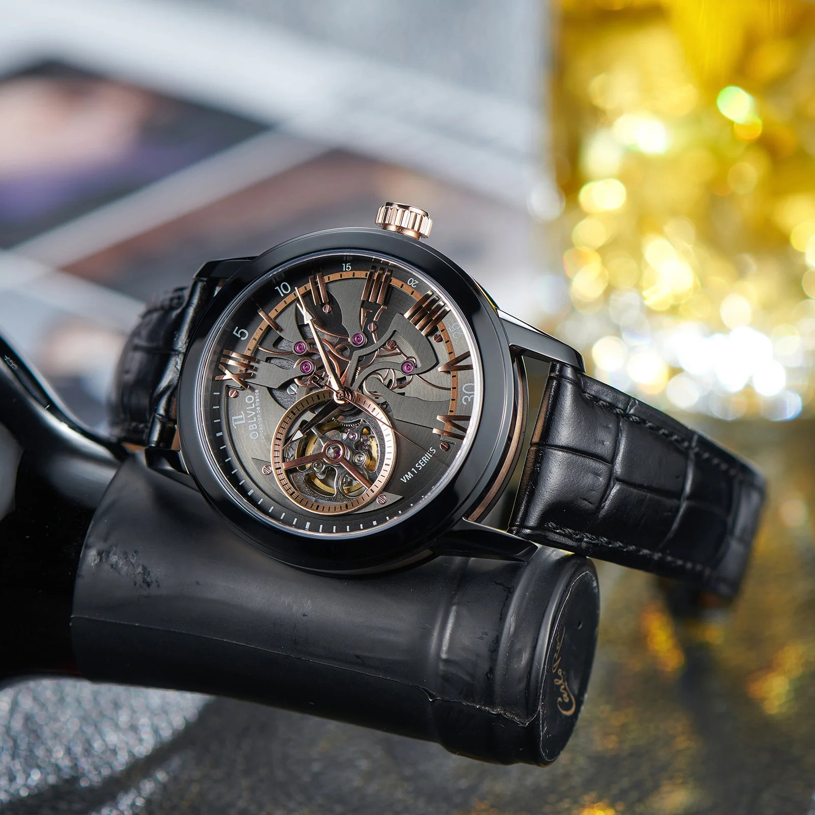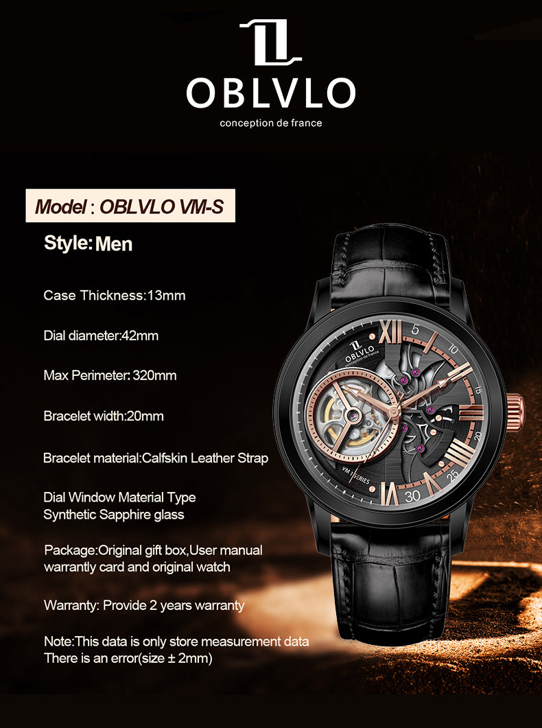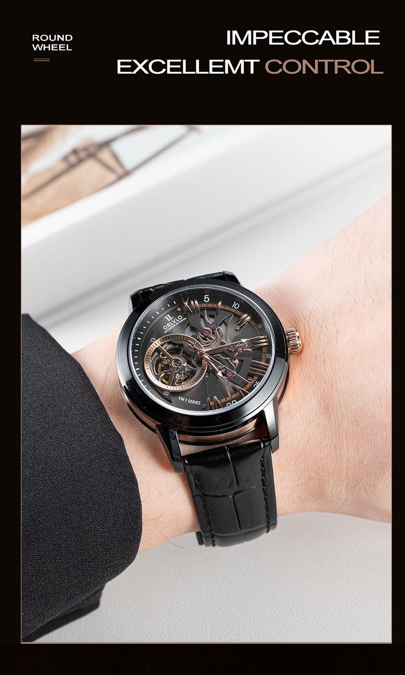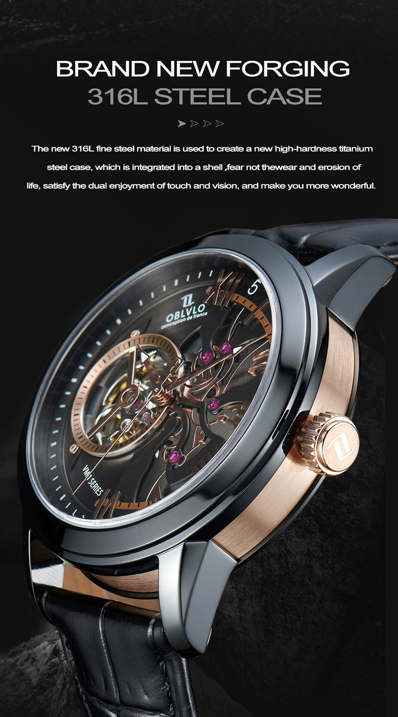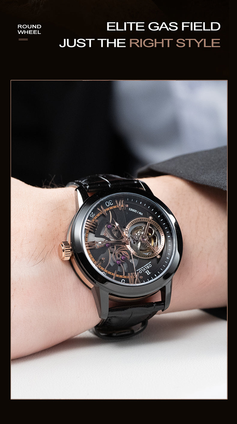 Dial Design: Black & Rose Gold Dial, high-grade satin brushed & polished, and luxury skeleton tourbillon style dial.