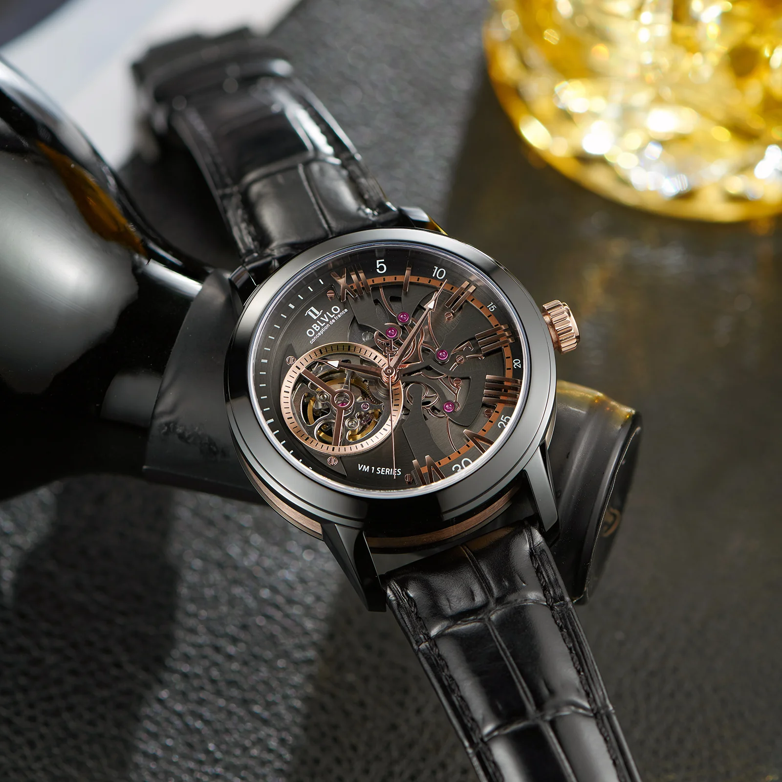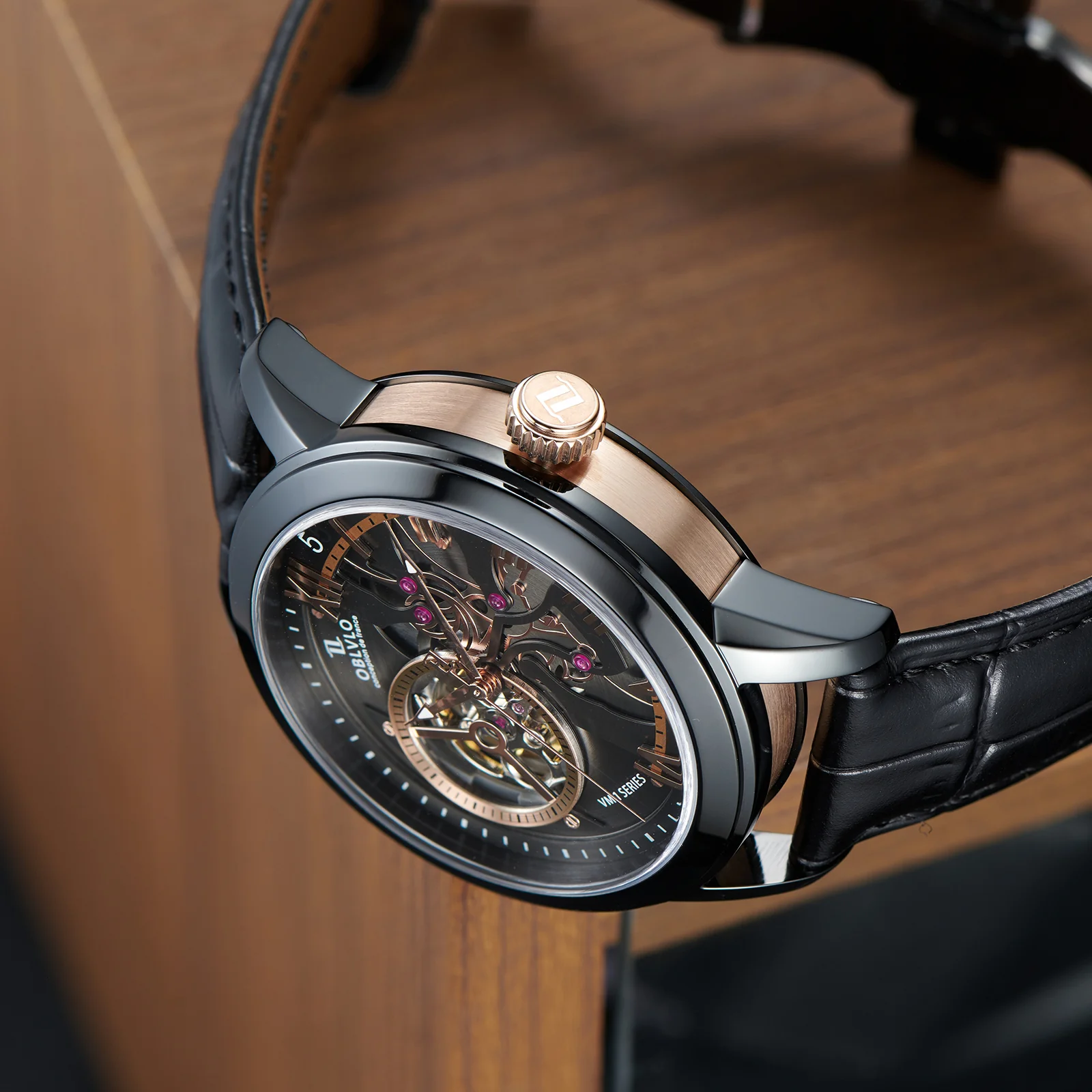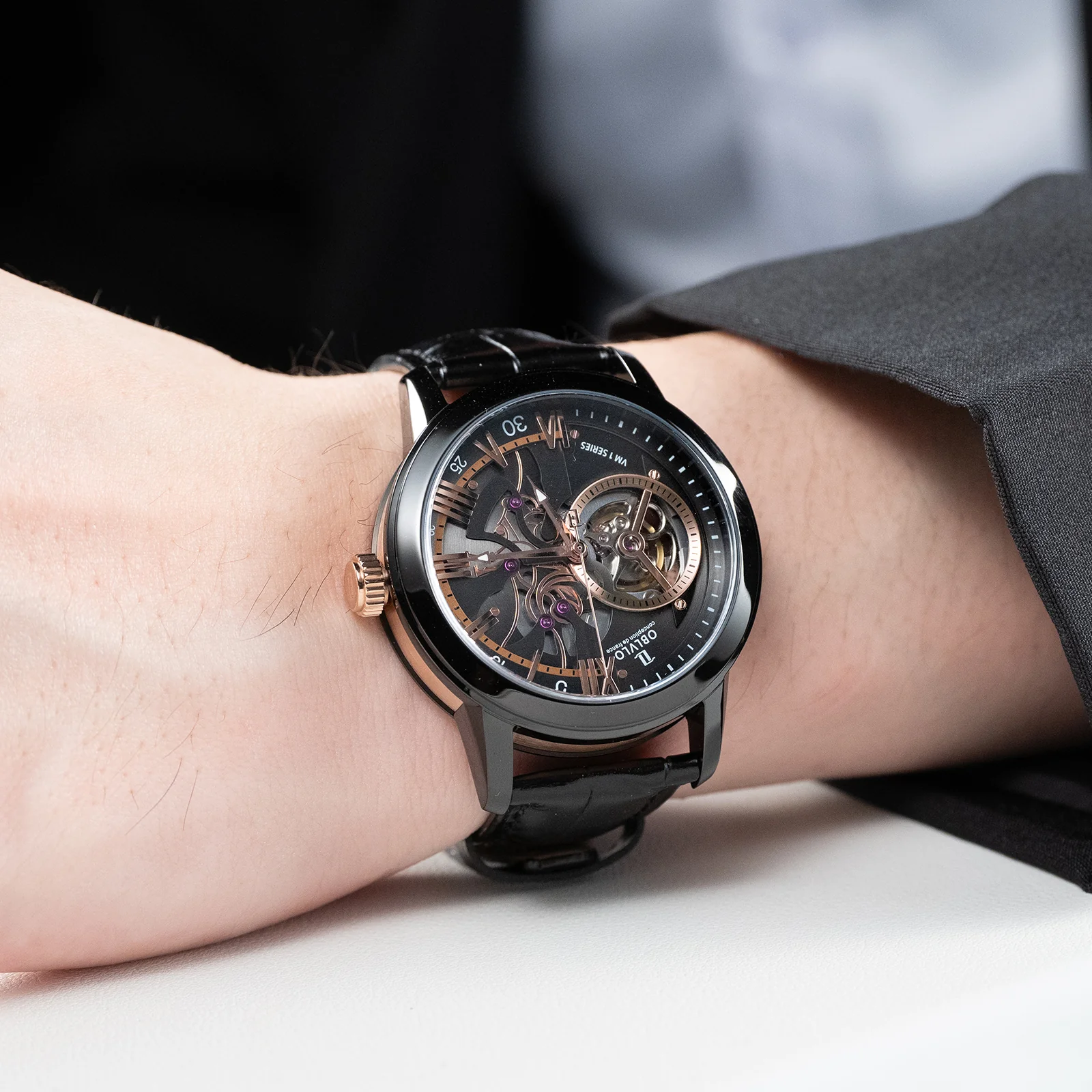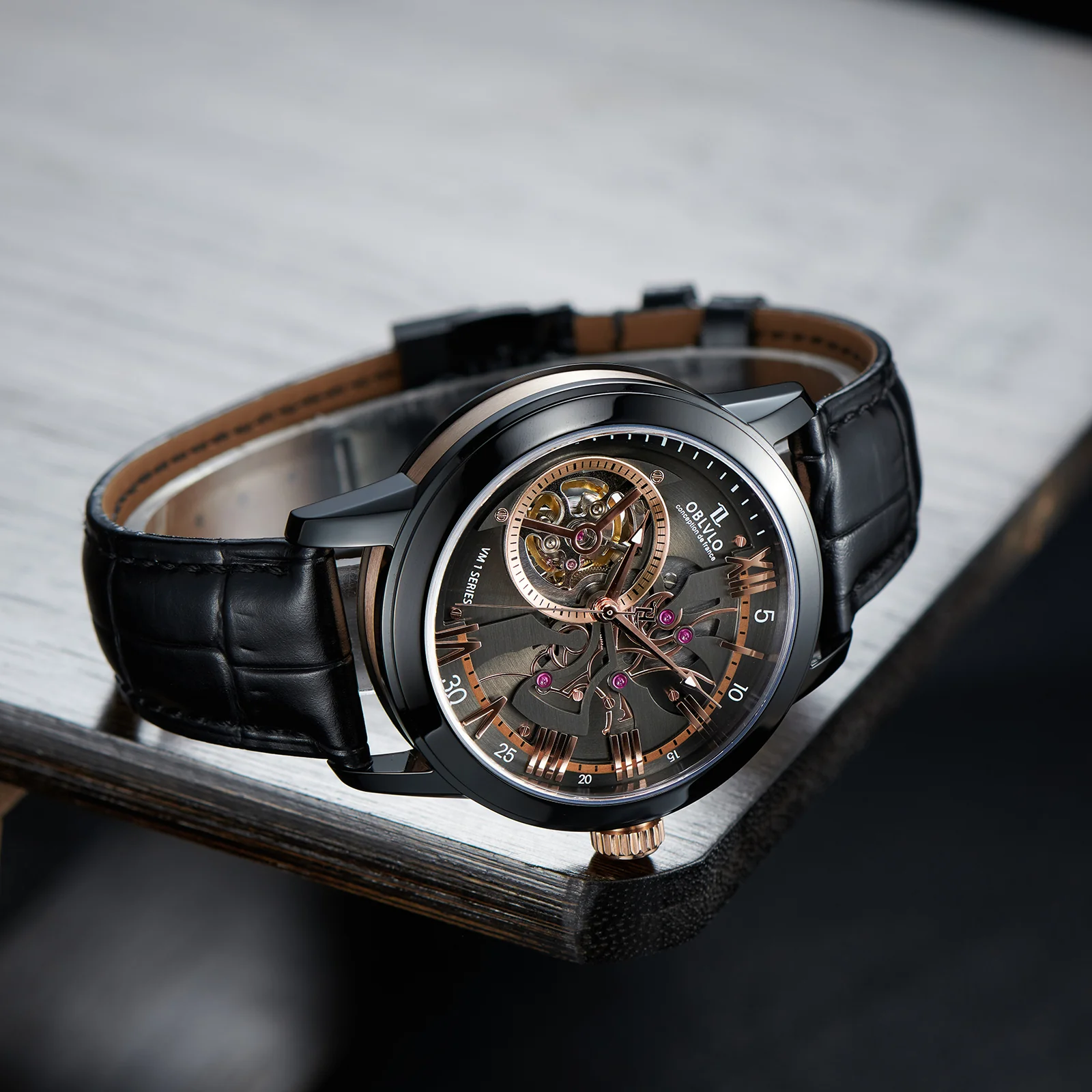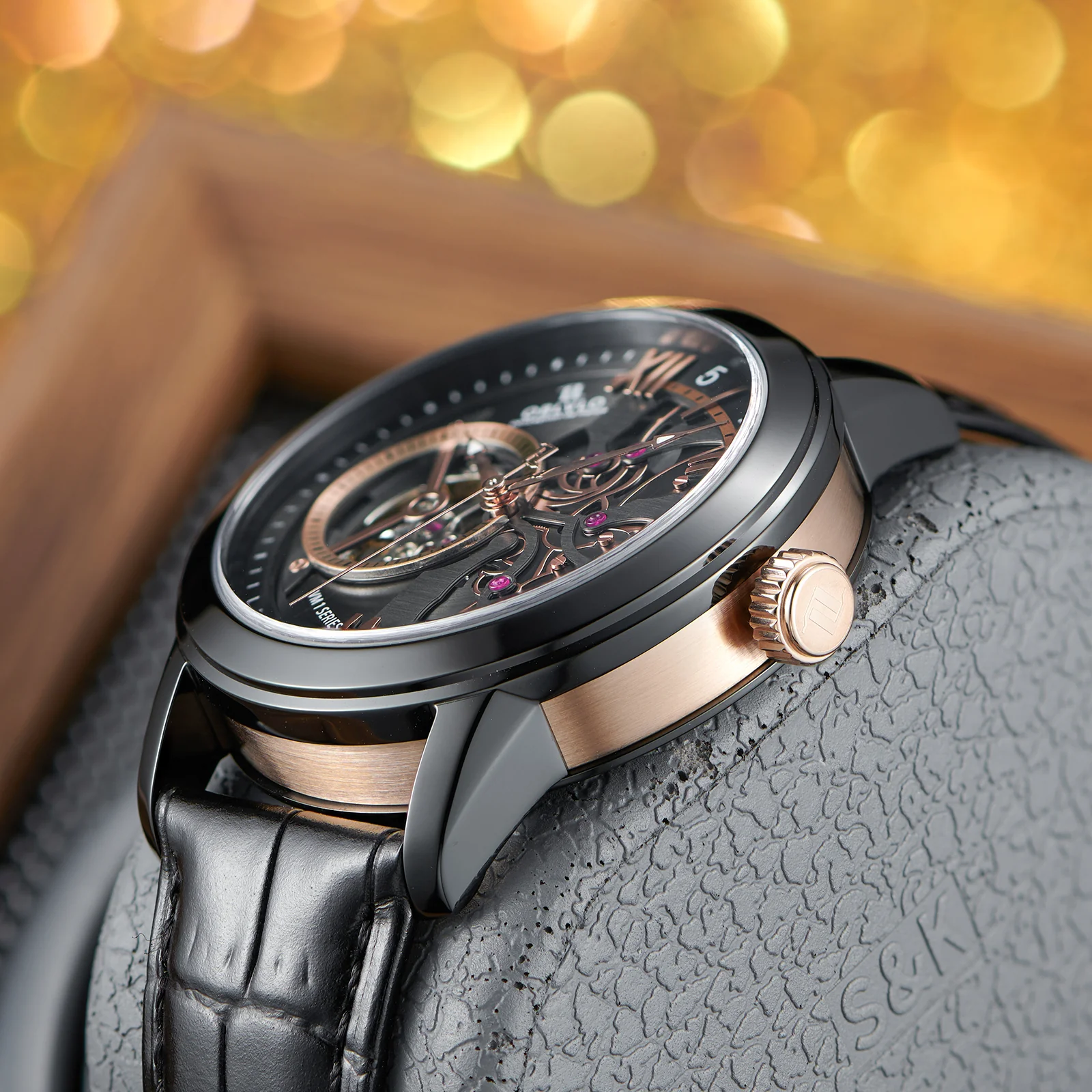 Dial Design: Black & Rose Gold Dial, high-grade satin brushed & polished, and luxury skeleton tourbillon style dial.