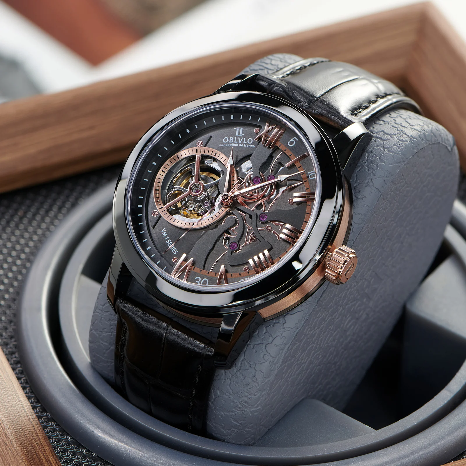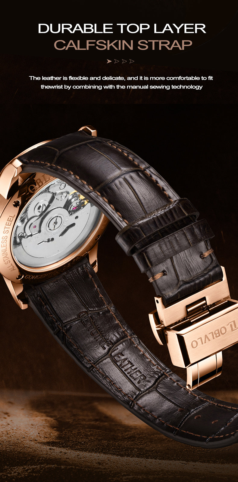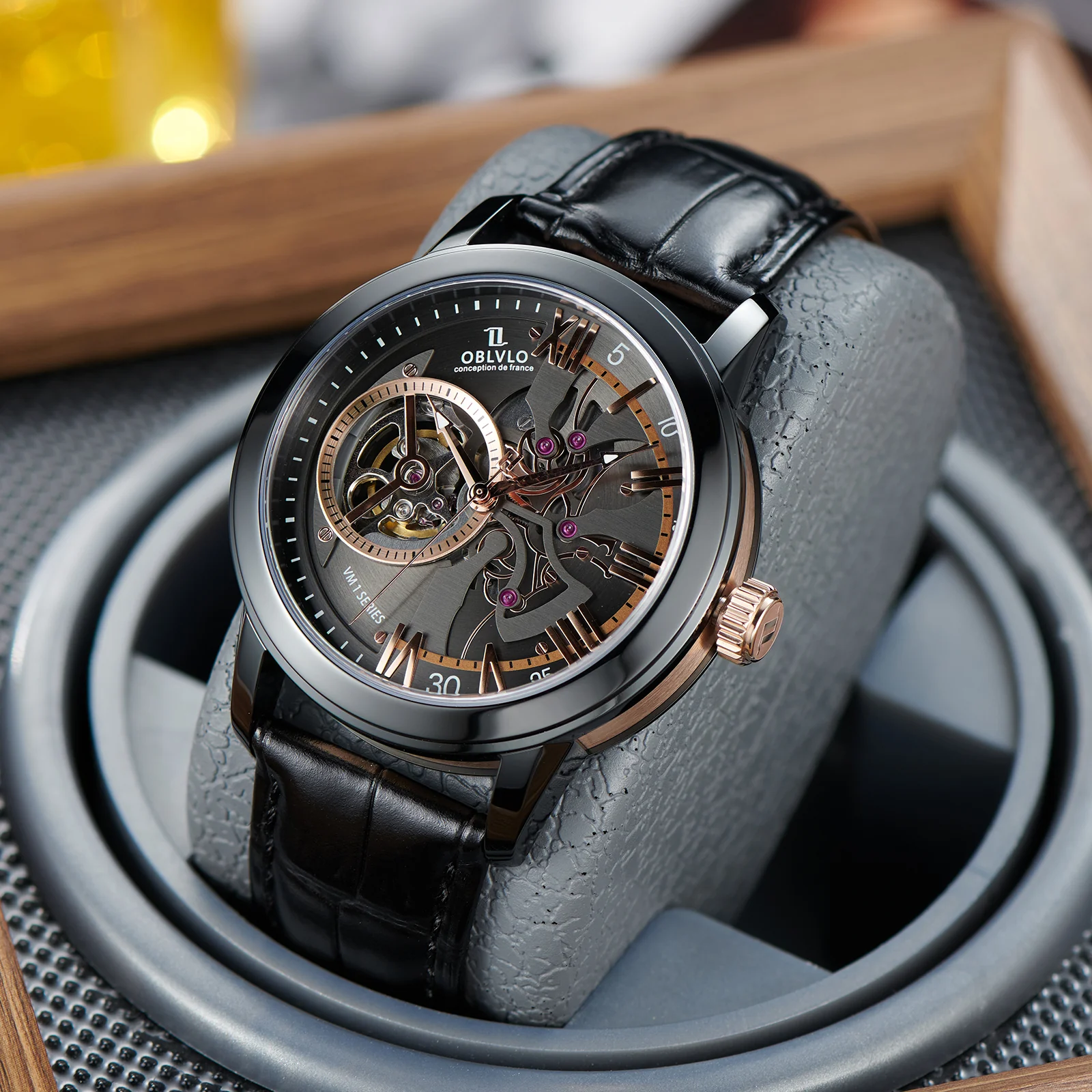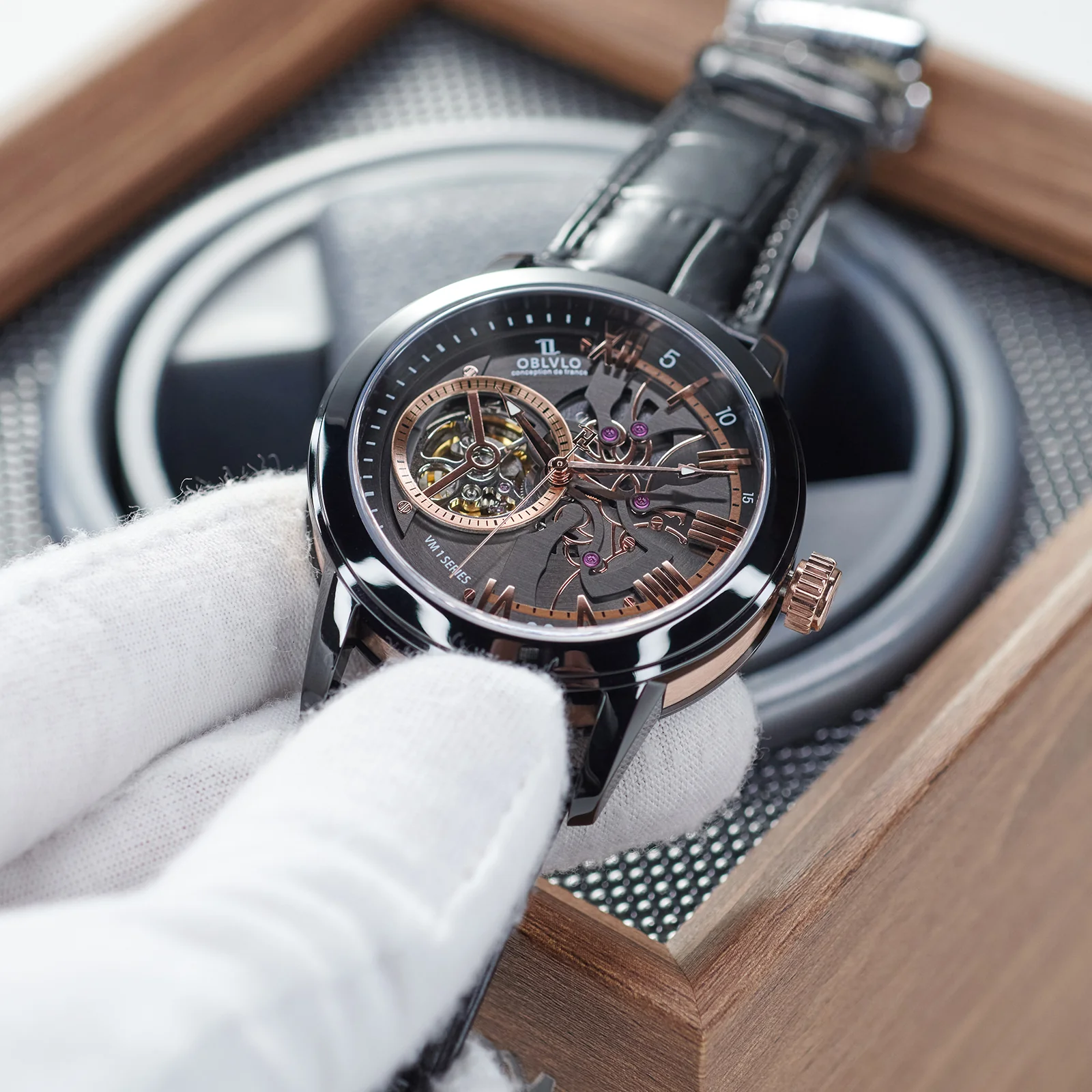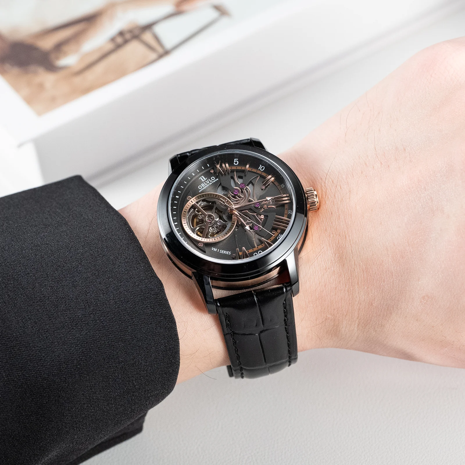 Dial Design: Black & Rose Gold Dial, high-grade satin brushed & polished, and luxury skeleton tourbillon style dial.
