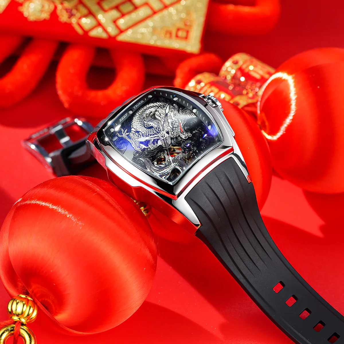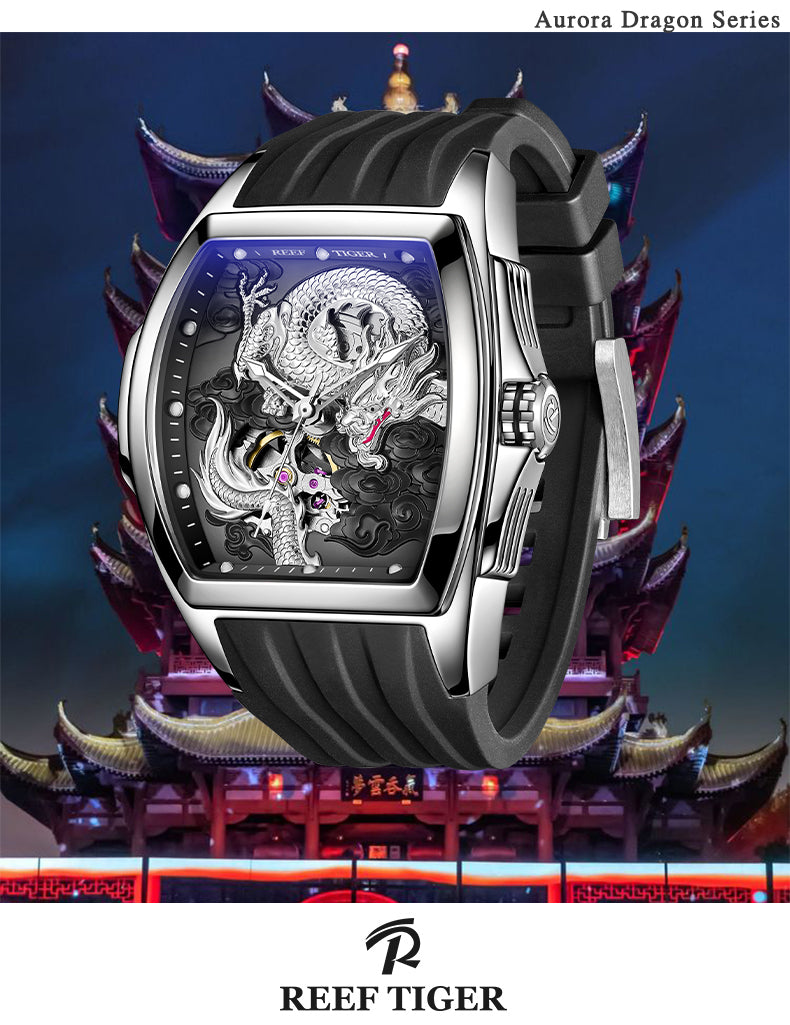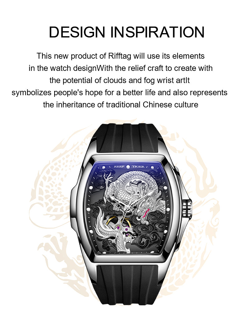 Dial Design: Black Skeleton Xiangyun (Auspicious clouds) Dial & Watch face is designed with Engraving Silver Dragon. Dragons in Chinese culture symbolize great power, good luck and strength.
