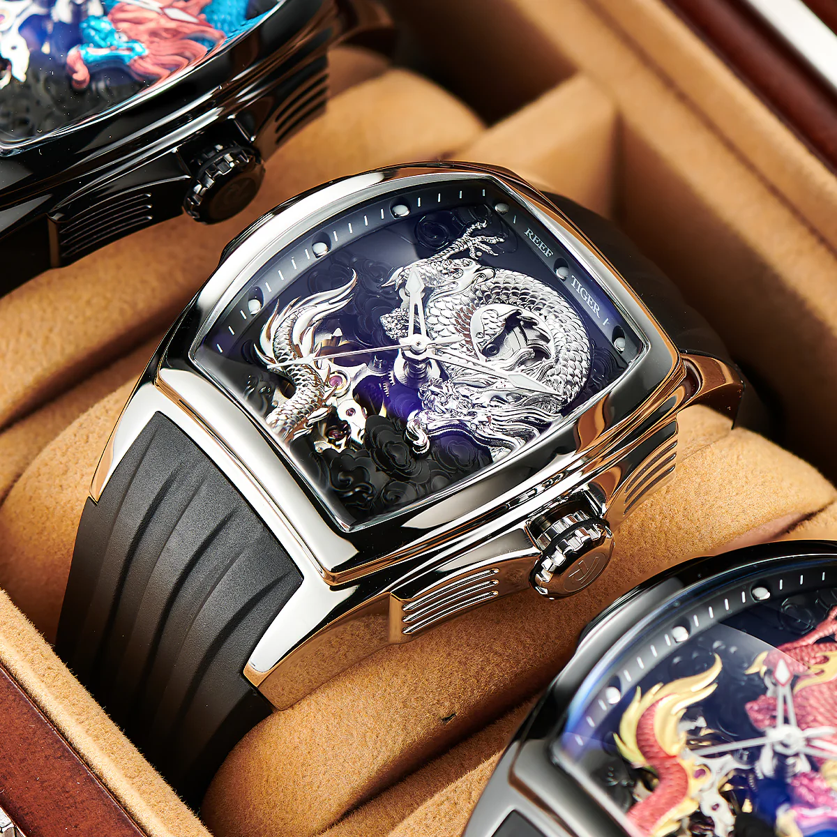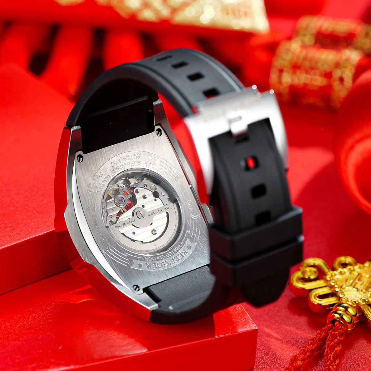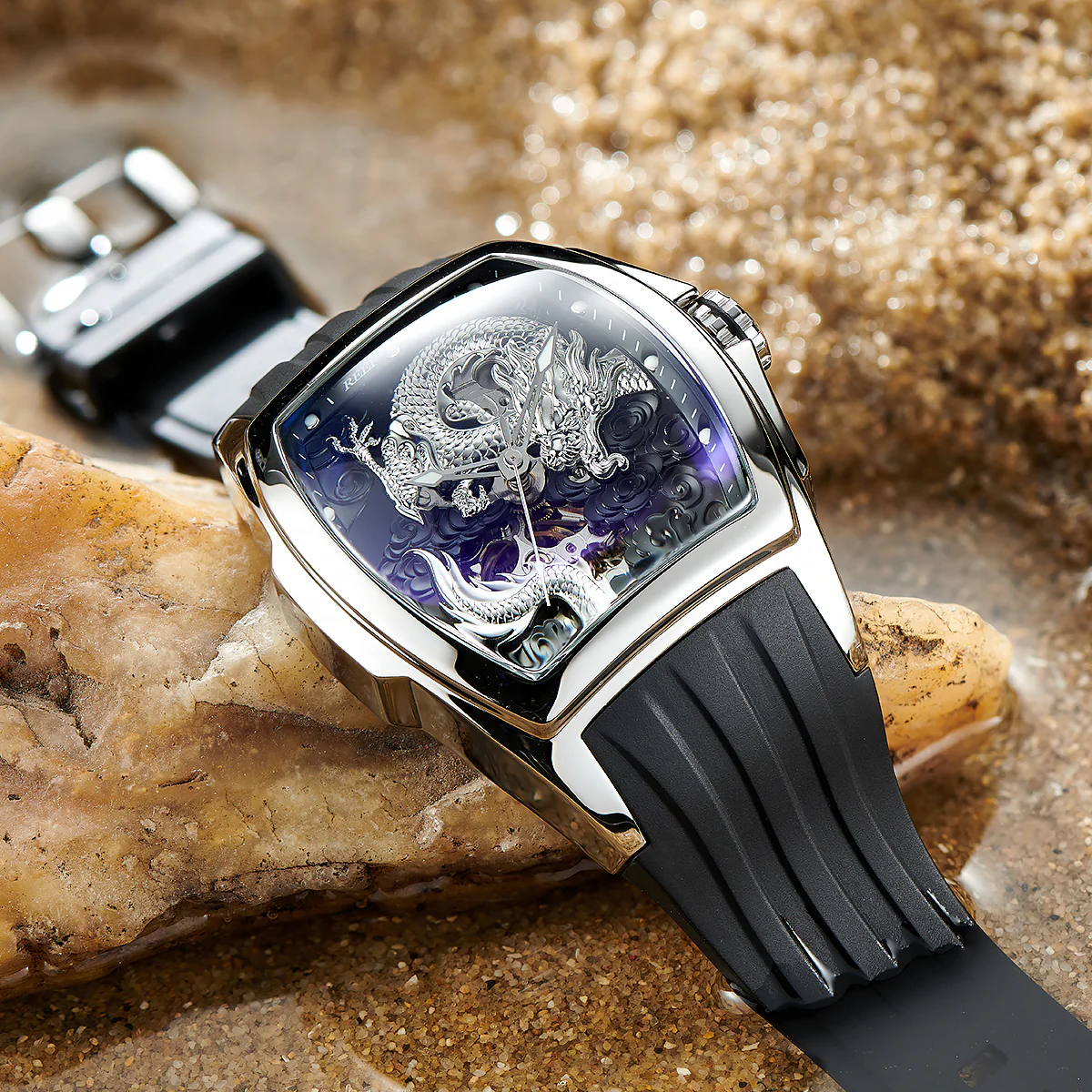 Dial Design: Black Skeleton Xiangyun (Auspicious clouds) Dial & Watch face is designed with Engraving Silver Dragon. Dragons in Chinese culture symbolize great power, good luck and strength.
