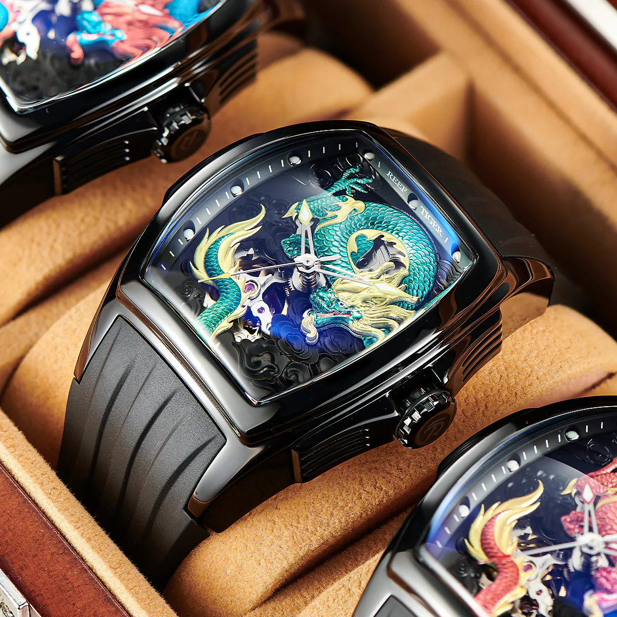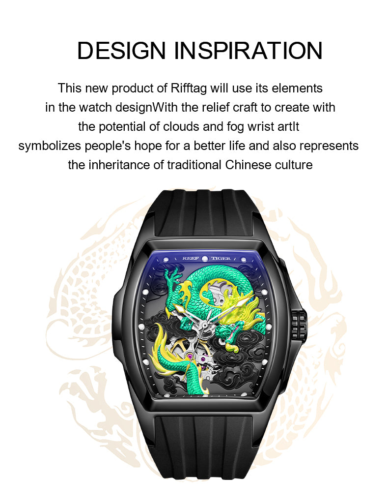Dial Design: Black Skeleton Xiangyun (Auspicious clouds) Dial & Watch face is designed with Engraving Green Dragon. Dragons in Chinese culture symbolize great power, good luck and strength.