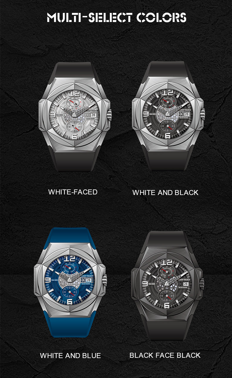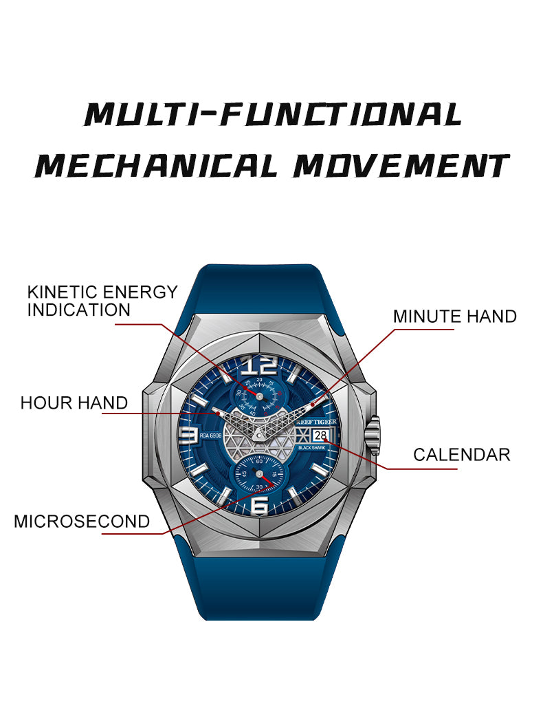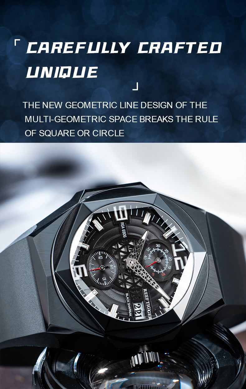 Dial Design: Black Dial & Multifunctional Mechanical Watch face is designed with day, hours instruction, luminous hands display & the pointer is made of a zero-radioactivity super-luminova swiss glow in the dark material. The new geometric line design of the multi-geometric space breaks the rule of square or circle. The back face is combined with the dial geometry design.