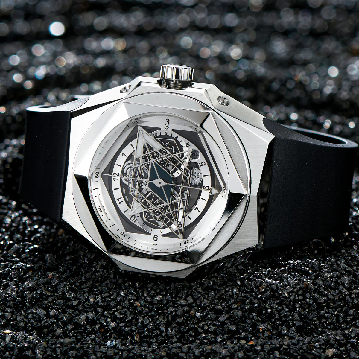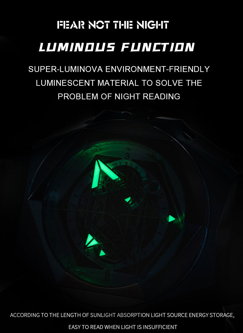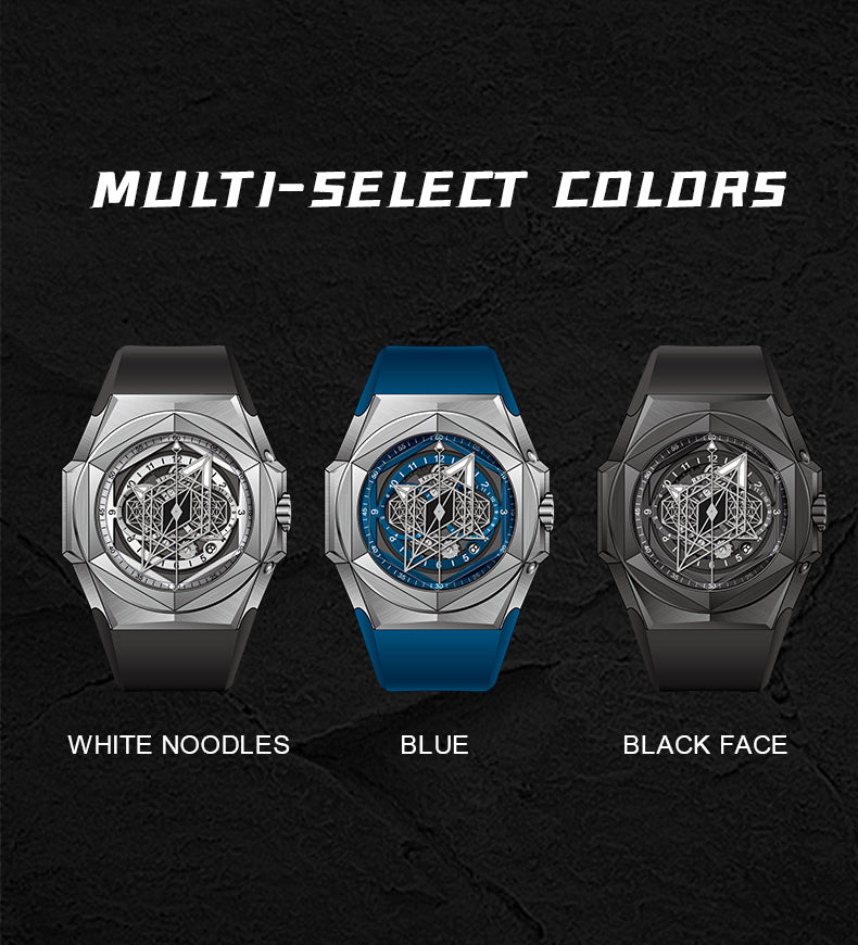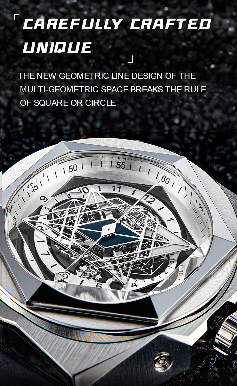 Dial Design: Black Dial & Multifunctional Mechanical Watch face is designed with month, date, day, hours instruction, luminous hands display & the pointer is made of a zero-radioactivity super-luminova swiss glow in the dark material. The new geometric line design of the multi-geometric space breaks the rule of square or circle. The back face is combined with the dial geometry design.