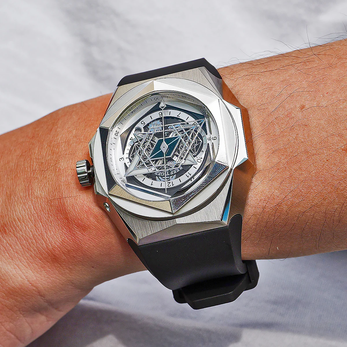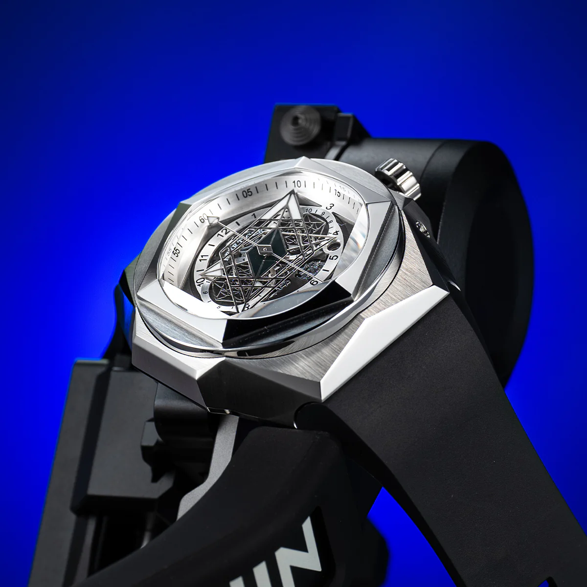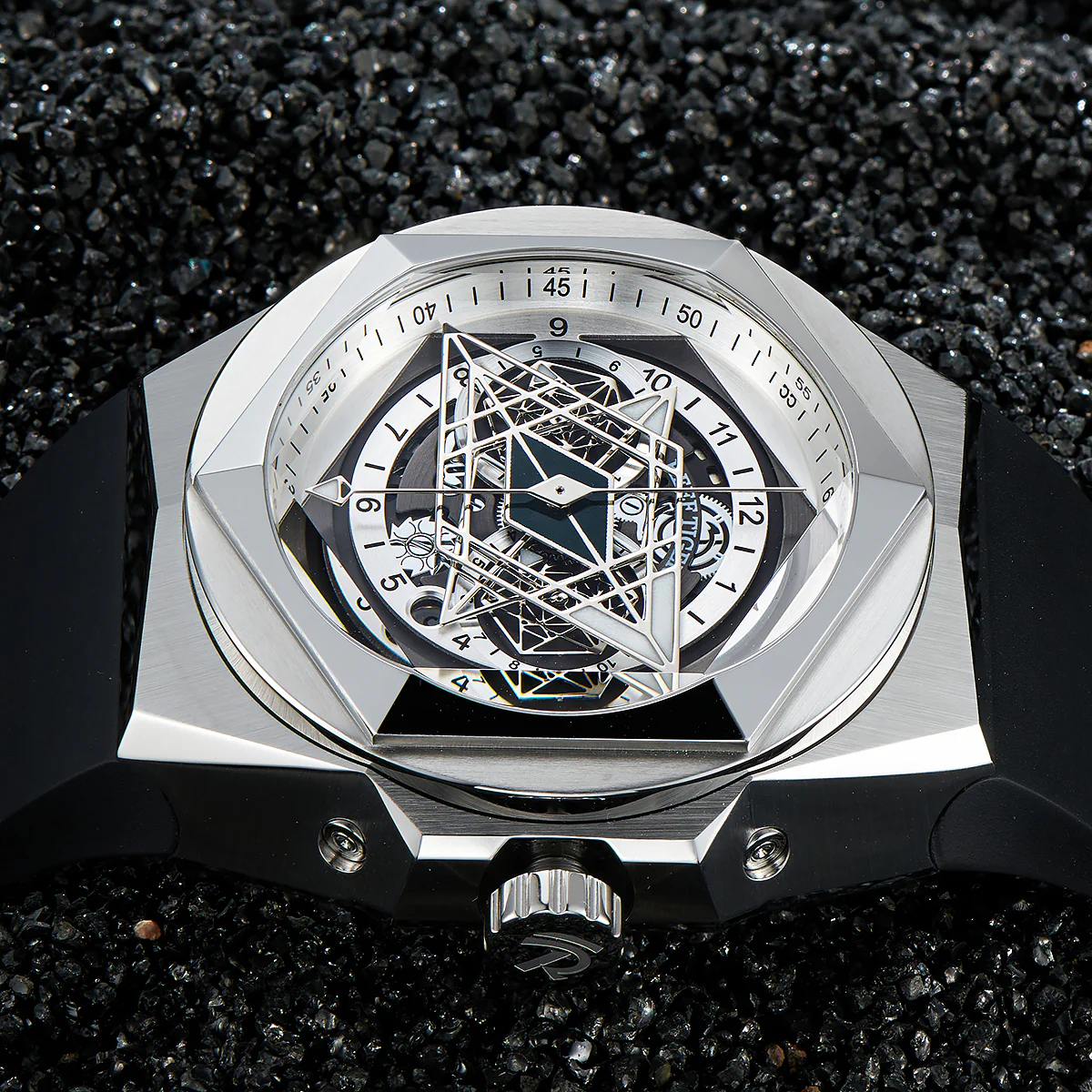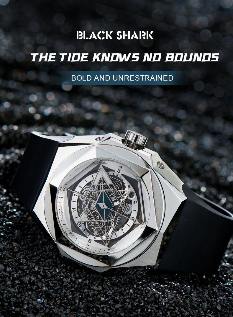 Dial Design: Black Dial & Multifunctional Mechanical Watch face is designed with month, date, day, hours instruction, luminous hands display & the pointer is made of a zero-radioactivity super-luminova swiss glow in the dark material. The new geometric line design of the multi-geometric space breaks the rule of square or circle. The back face is combined with the dial geometry design.