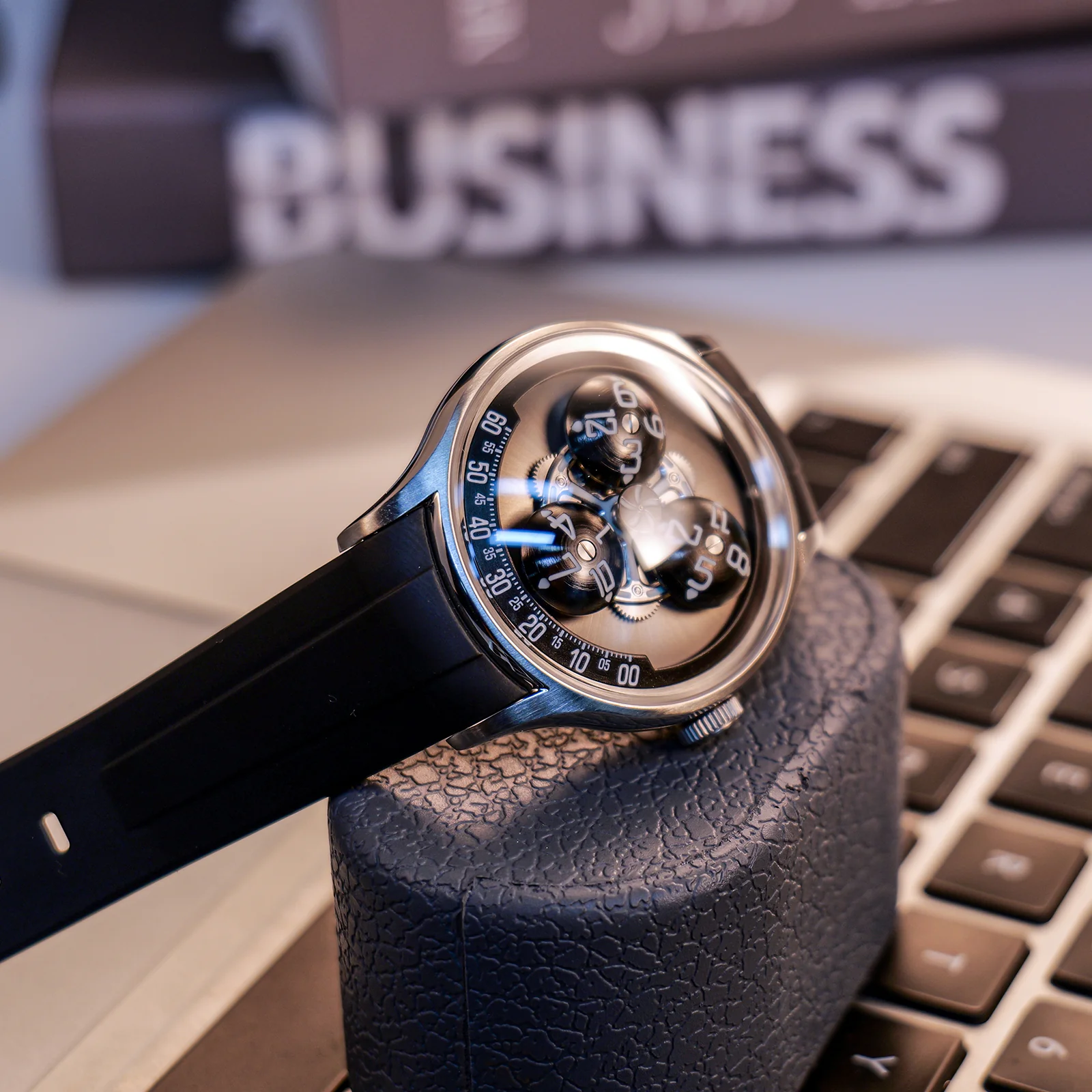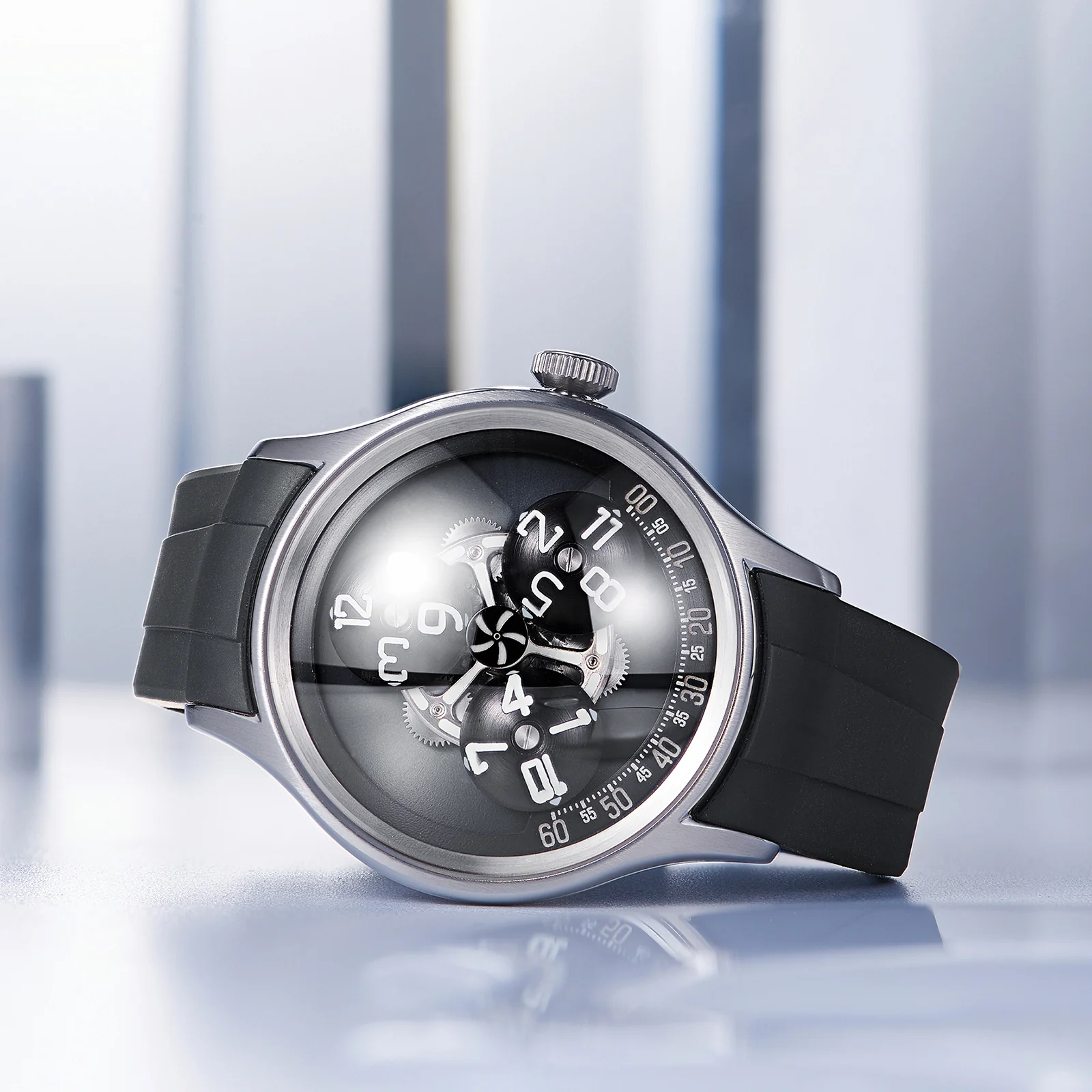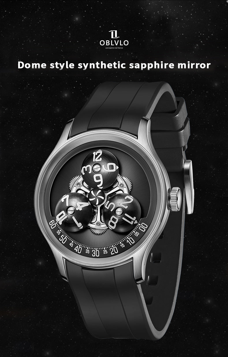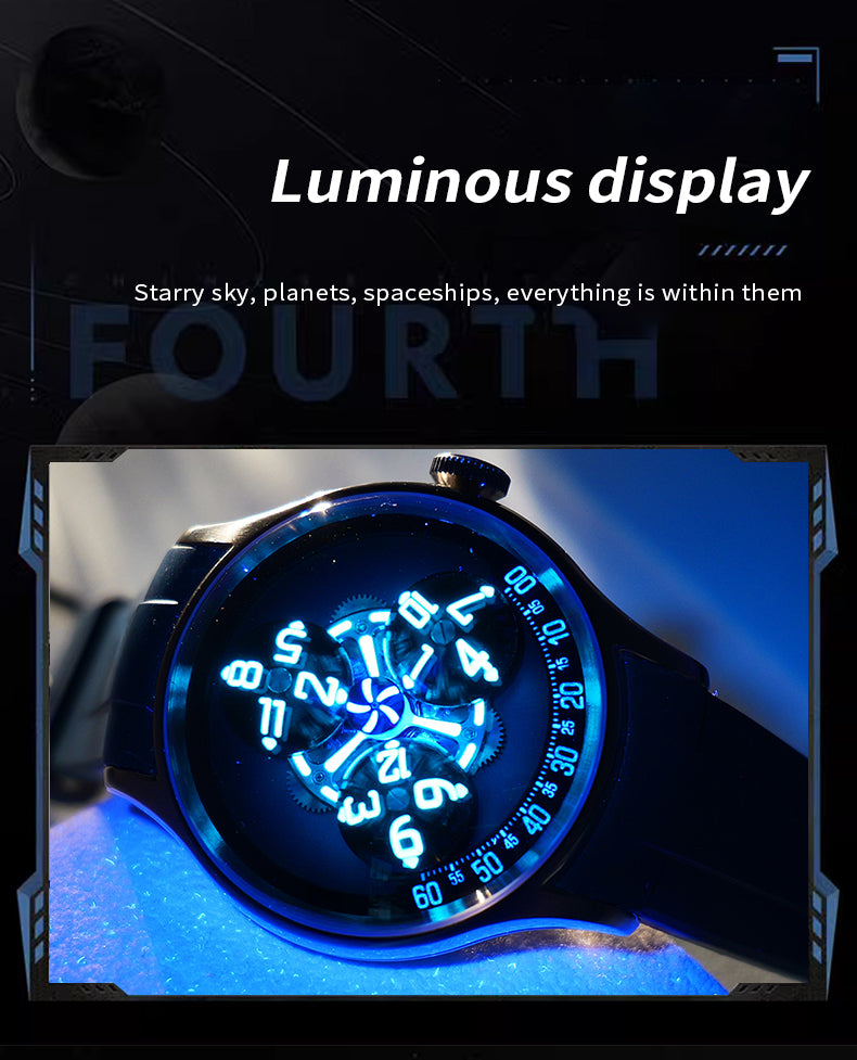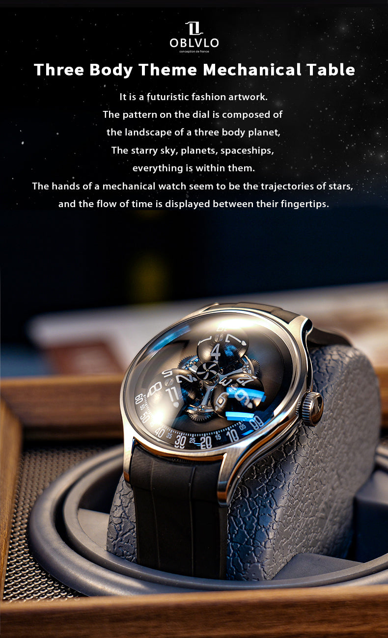 Dial Design: Unique Mechanical Rotating Sphere Indices Dial And Hands With Luminescent Coating. The design inspiration for this mechanical watch comes from Liu Cixin's science fiction work "Three Body". In the novel, a three body planet is a world filled with unknowns. The designers of mechanical watches hope to express their exploration and curiosity about the unknown world through this expression.