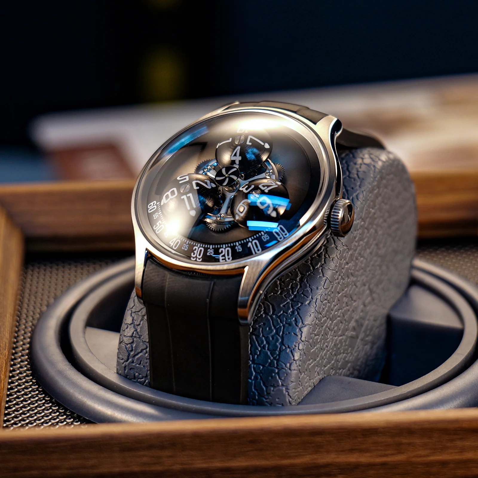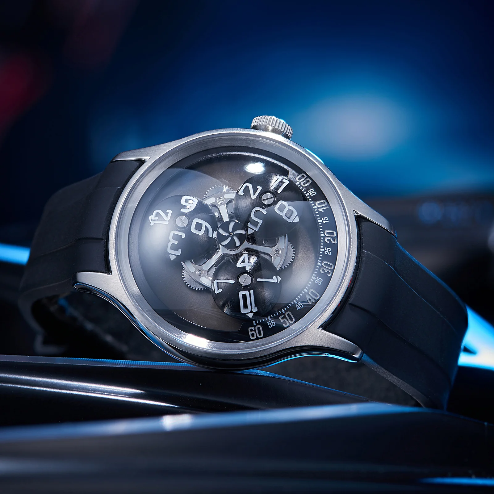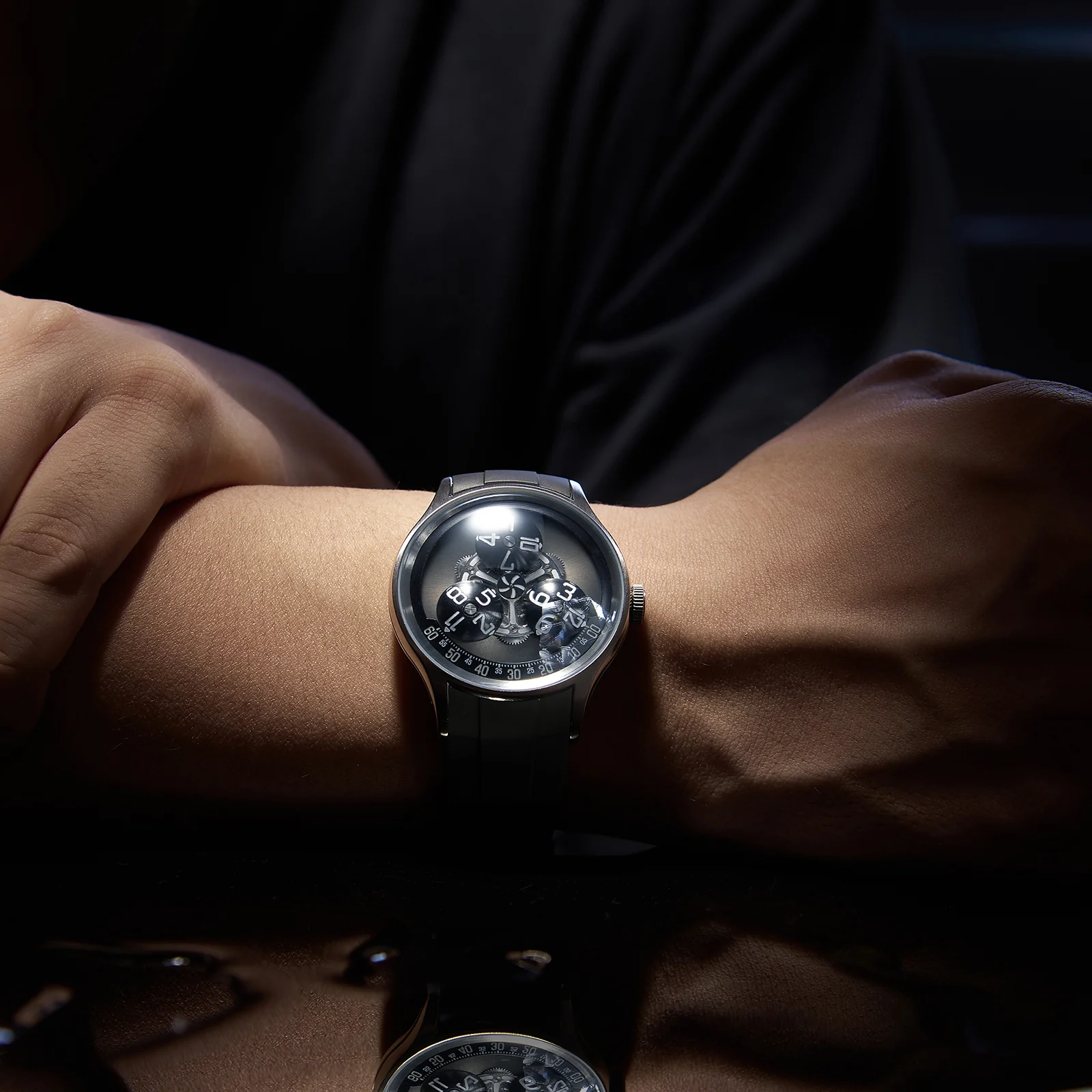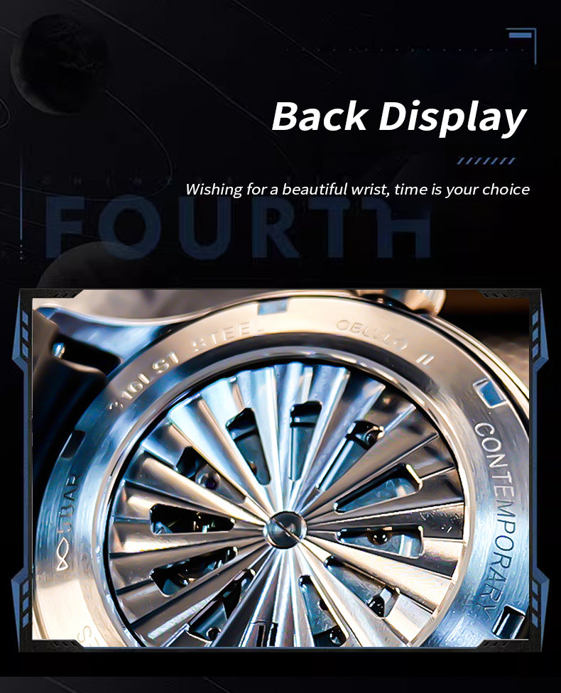 Dial Design: Unique Mechanical Rotating Sphere Indices Dial And Hands With Luminescent Coating. The design inspiration for this mechanical watch comes from Liu Cixin's science fiction work "Three Body". In the novel, a three body planet is a world filled with unknowns. The designers of mechanical watches hope to express their exploration and curiosity about the unknown world through this expression.