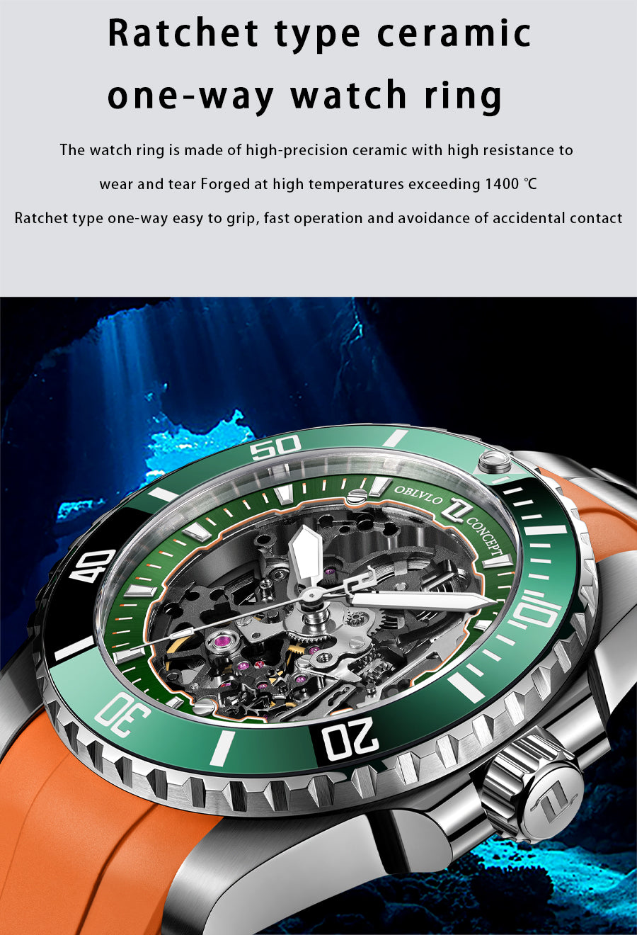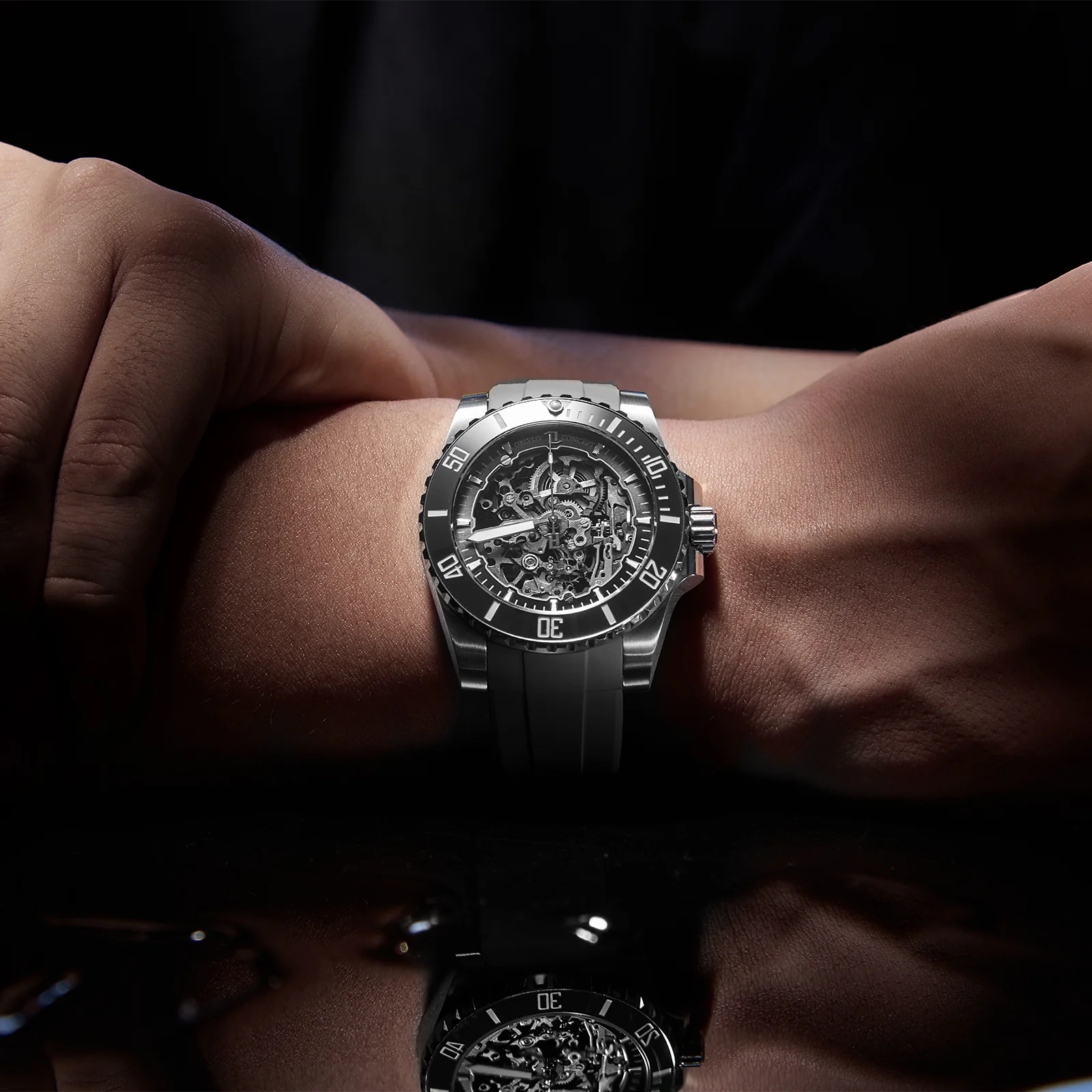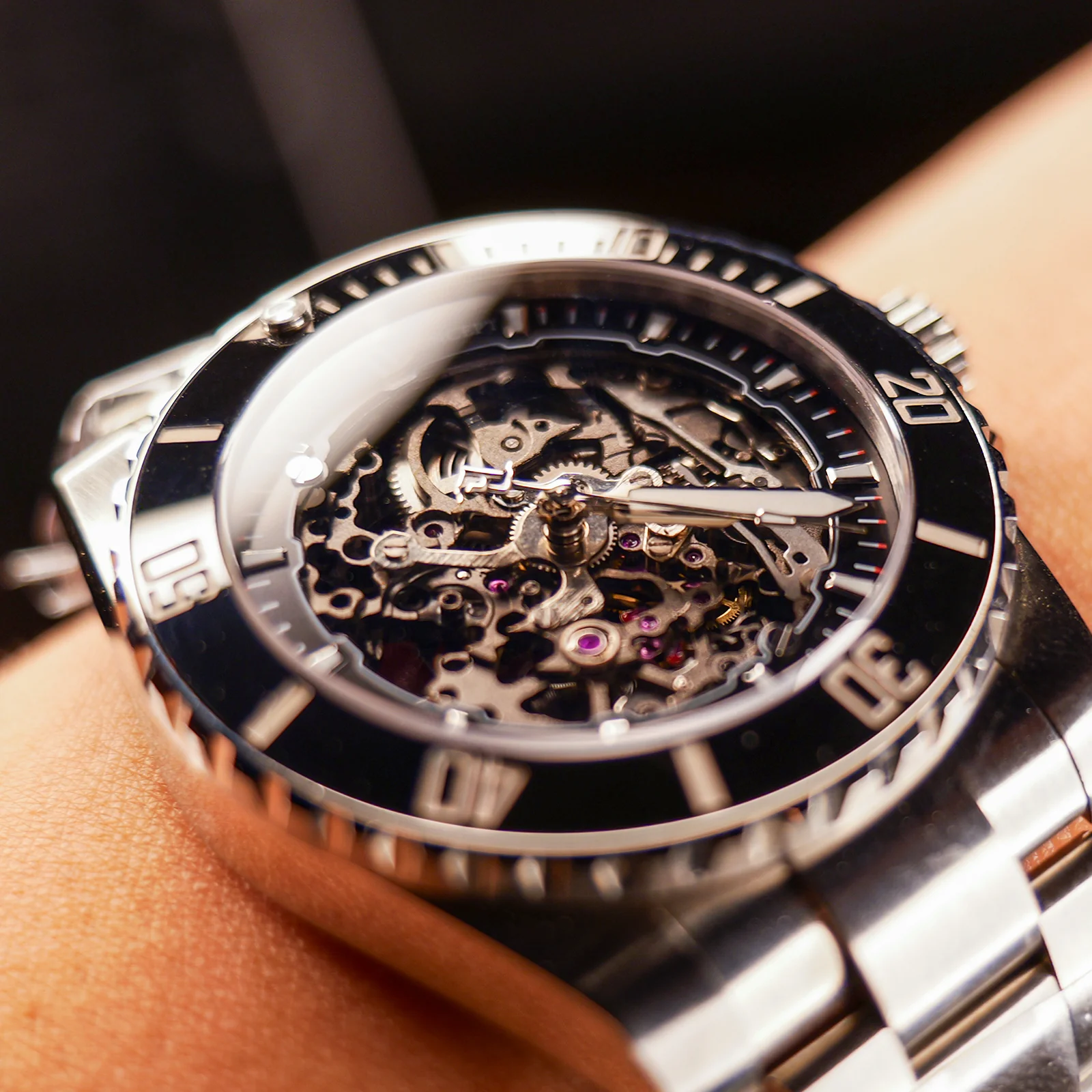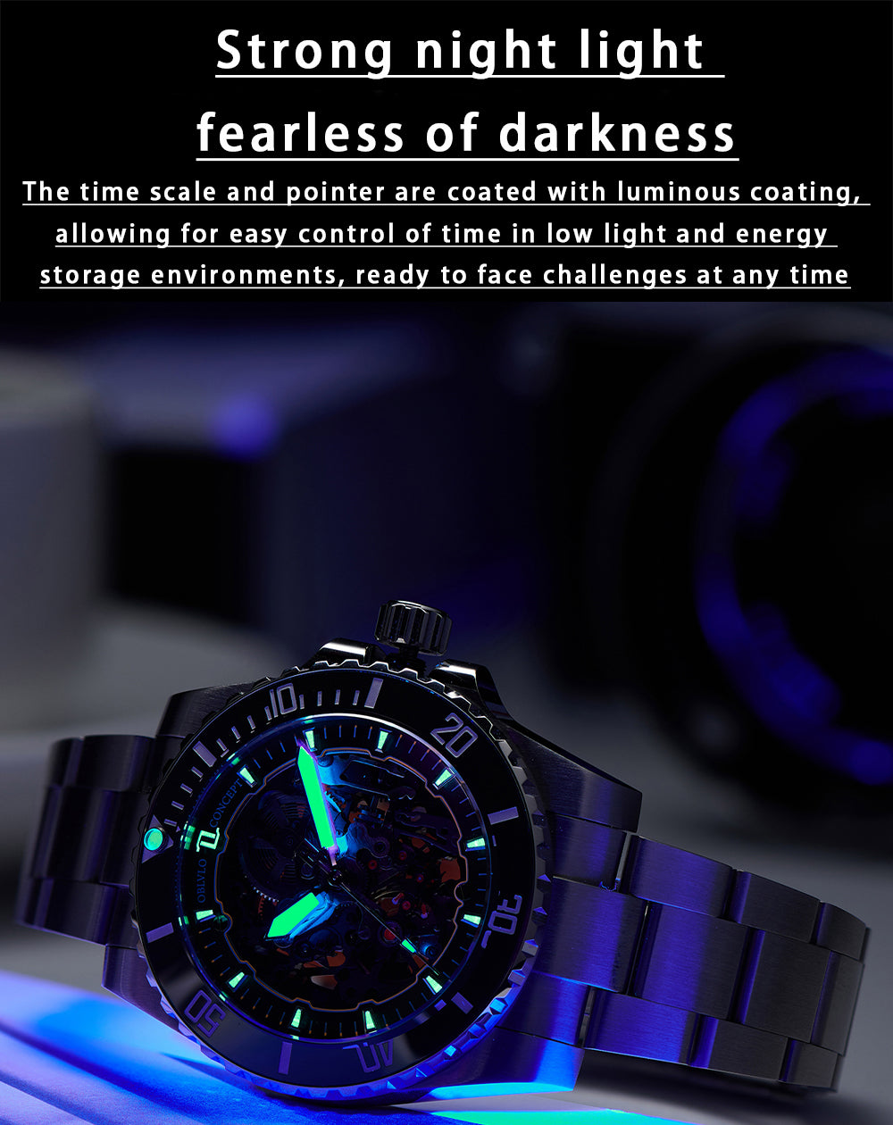 Dial Design: Skeleton perspective hardcore machinery, precision polished processing with outstanding texture smooth lines and full gloss. See-through powerful mechanical movement, insight into the charm of machinery.