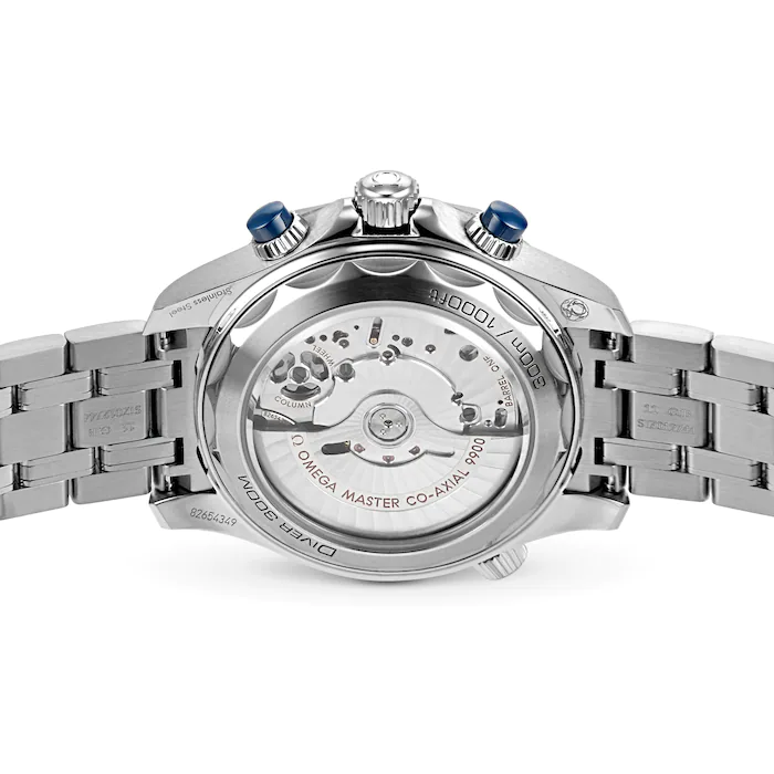 Desde 1993, el Seamaster Professional Diver 300M ha gozado de un seguimiento legendario. La moderna colección actual ha adoptado esa famosa herencia oceánica y la ha actualizado con la mejor innovación y diseño de OMEGA. Este modelo de cronógrafo de 44 mm está fabricado en acero inoxidable e incluye un bisel de cerámica negra pulida con una escala de buceo de esmalte blanco. Los pulsadores también son de cerámica negra pulida, al igual que la esfera, que presenta ondas grabadas con láser y una ventana de fecha a las 6 horas. Las agujas de la subesfera están rodiadas, al igual que el resto de agujas e índices, que están rellenos de Super-LumiNova blanca. El reloj se presenta con un brazalete de acero inoxidable y está animado por el Calibre OMEGA Master Chronometer 9900, que puede verse a través del cristal de zafiro del fondo de caja ondulado.