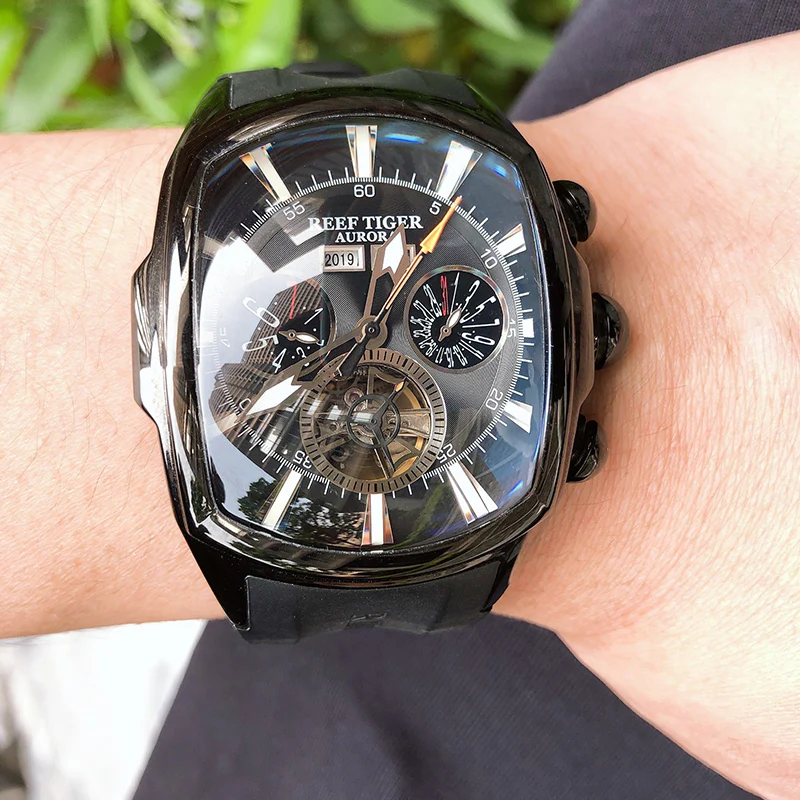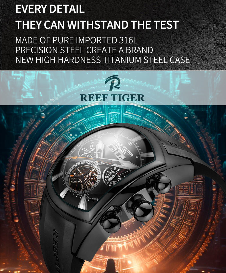 Dial Design: Black Dial & Watch face is designed with year, month, date, day, white luminous hands display & tourbillon style dial.