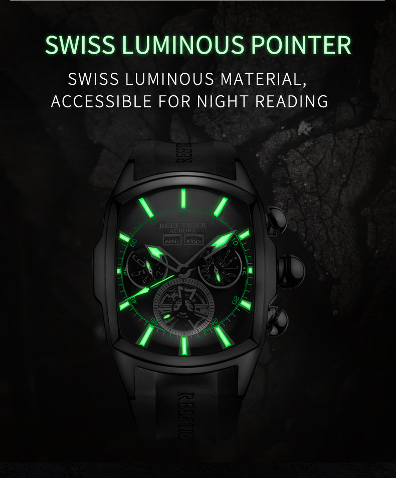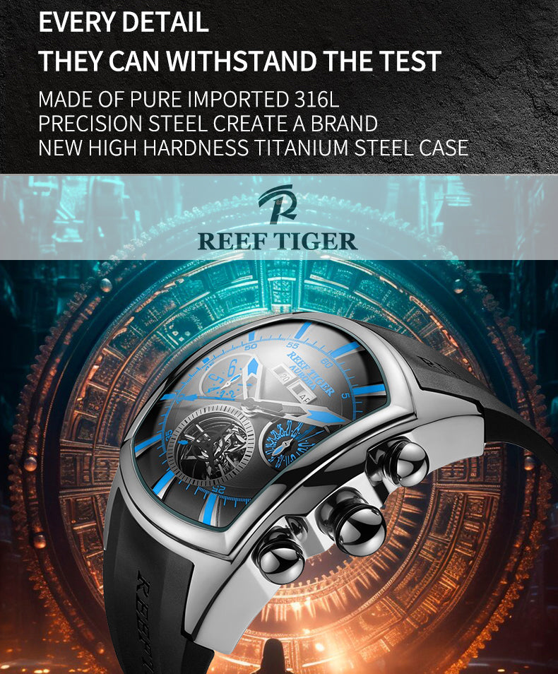 Dial Design: Black Dial & Watch face is designed with year, month, date, day, blue luminous hands display & tourbillon style dial.
