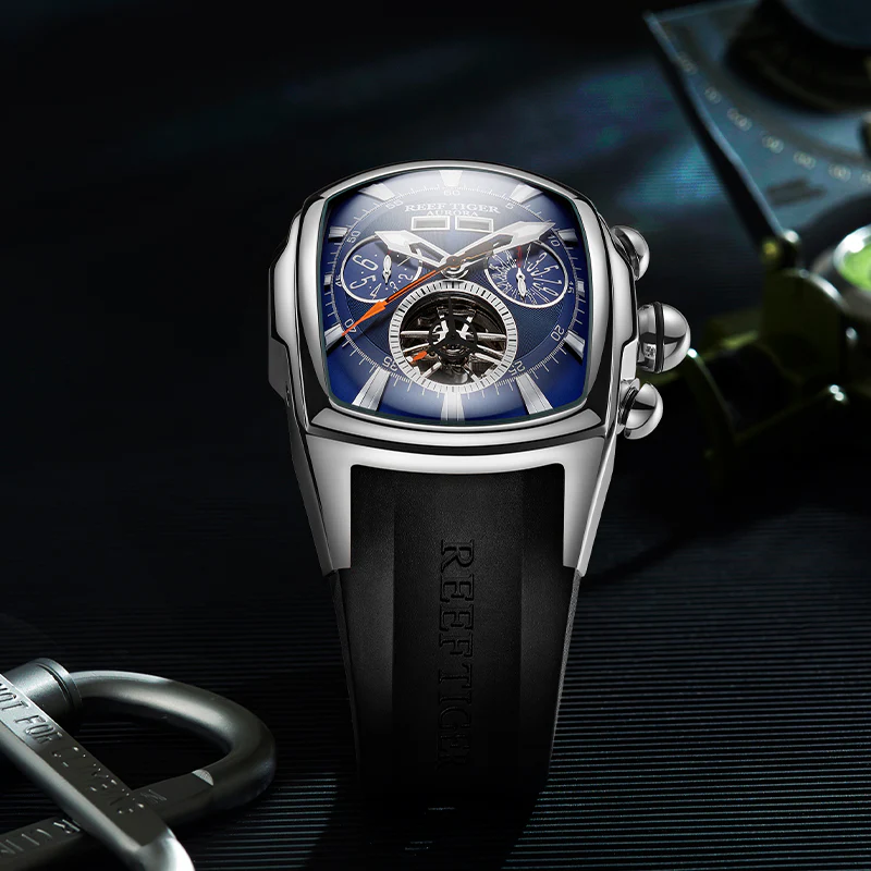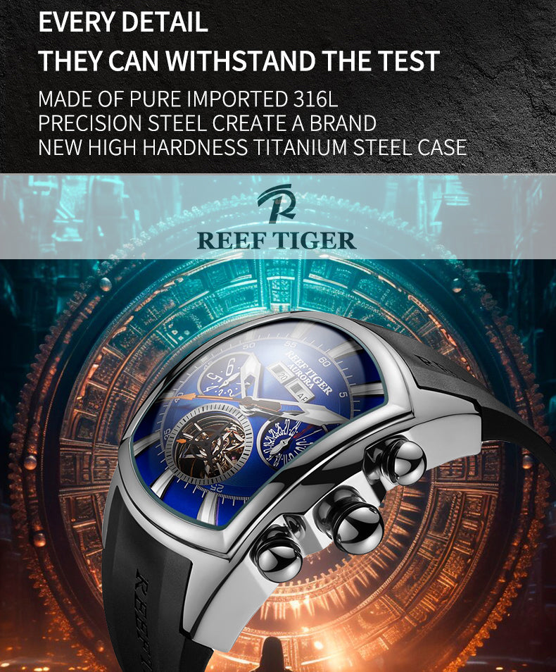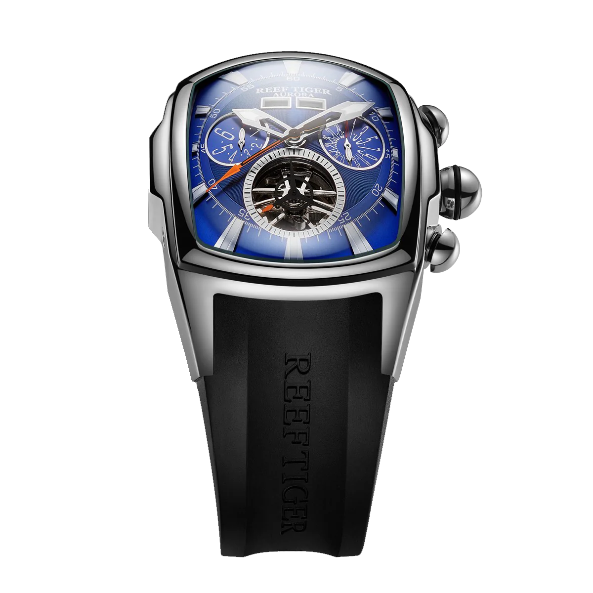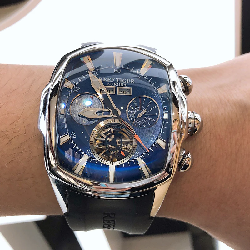Dial Design: Blue Dial & Watch face is designed with year, month, date, day, white luminous hands display & tourbillon style dial.