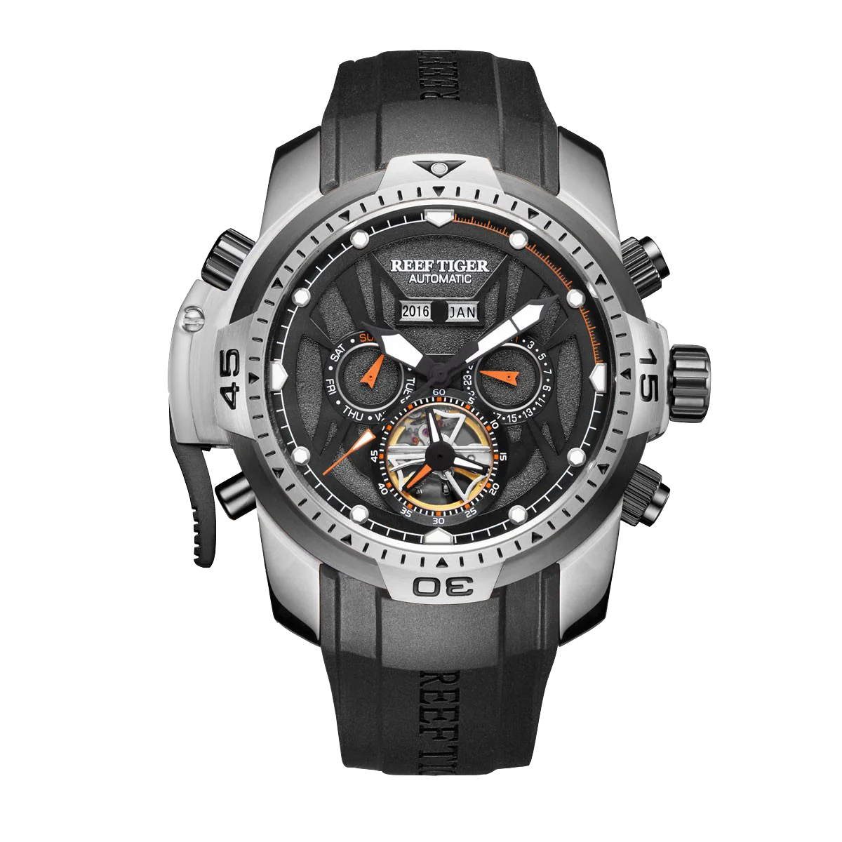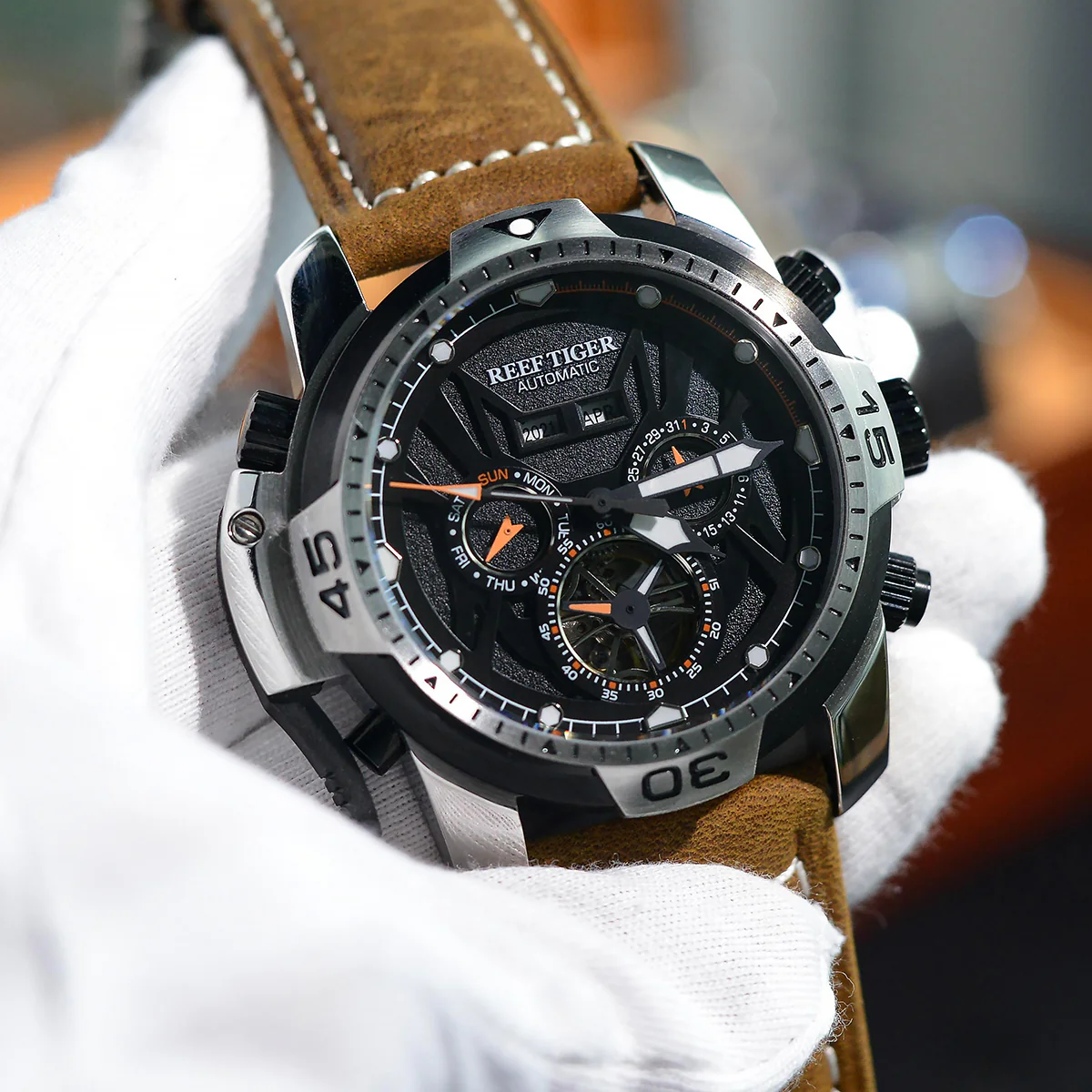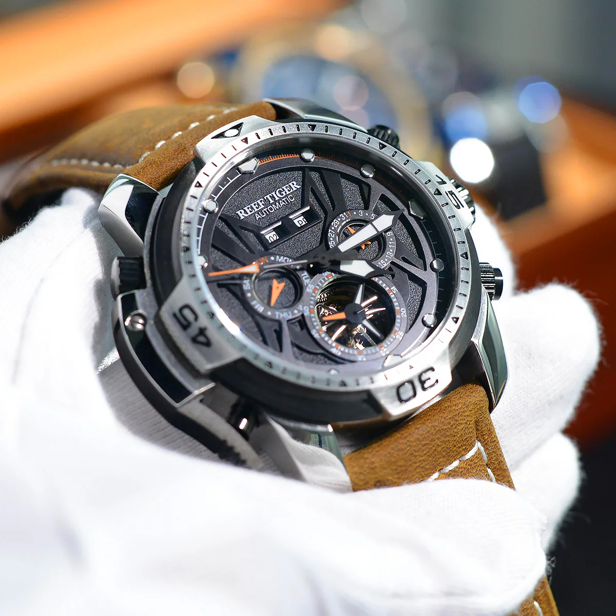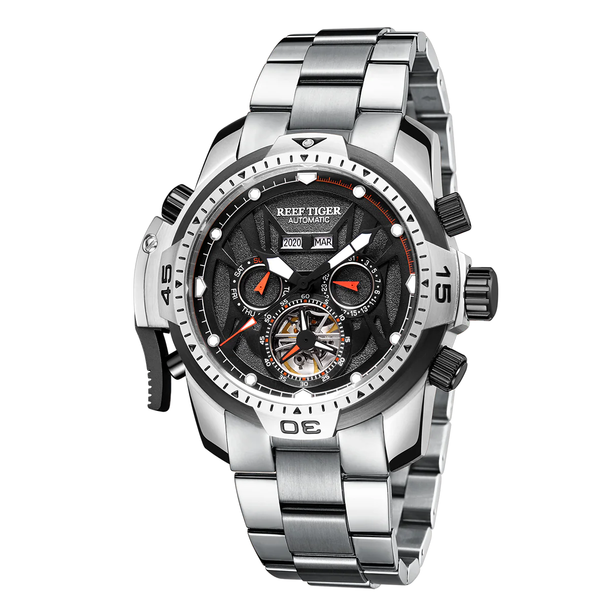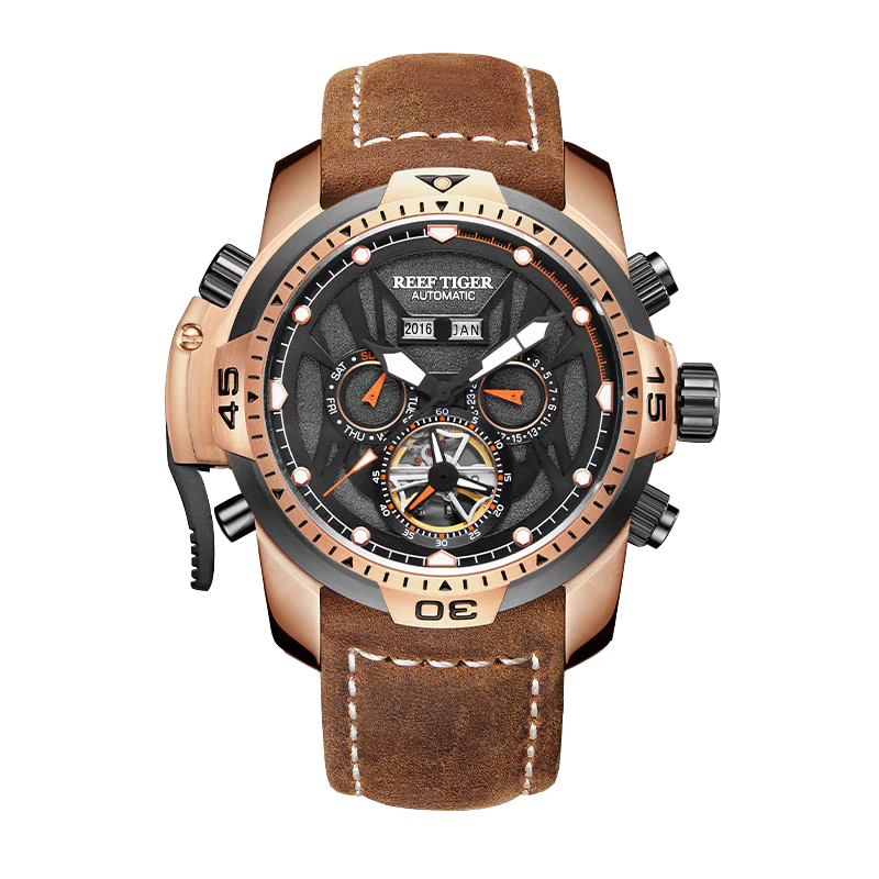Dial Design: Black Dial & Watch face is designed with year, month, date, day, orange luminous watch hands display & tourbillon style dial.