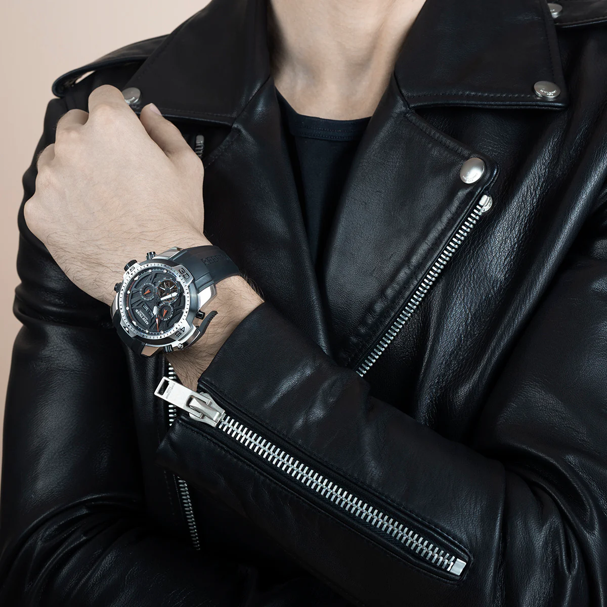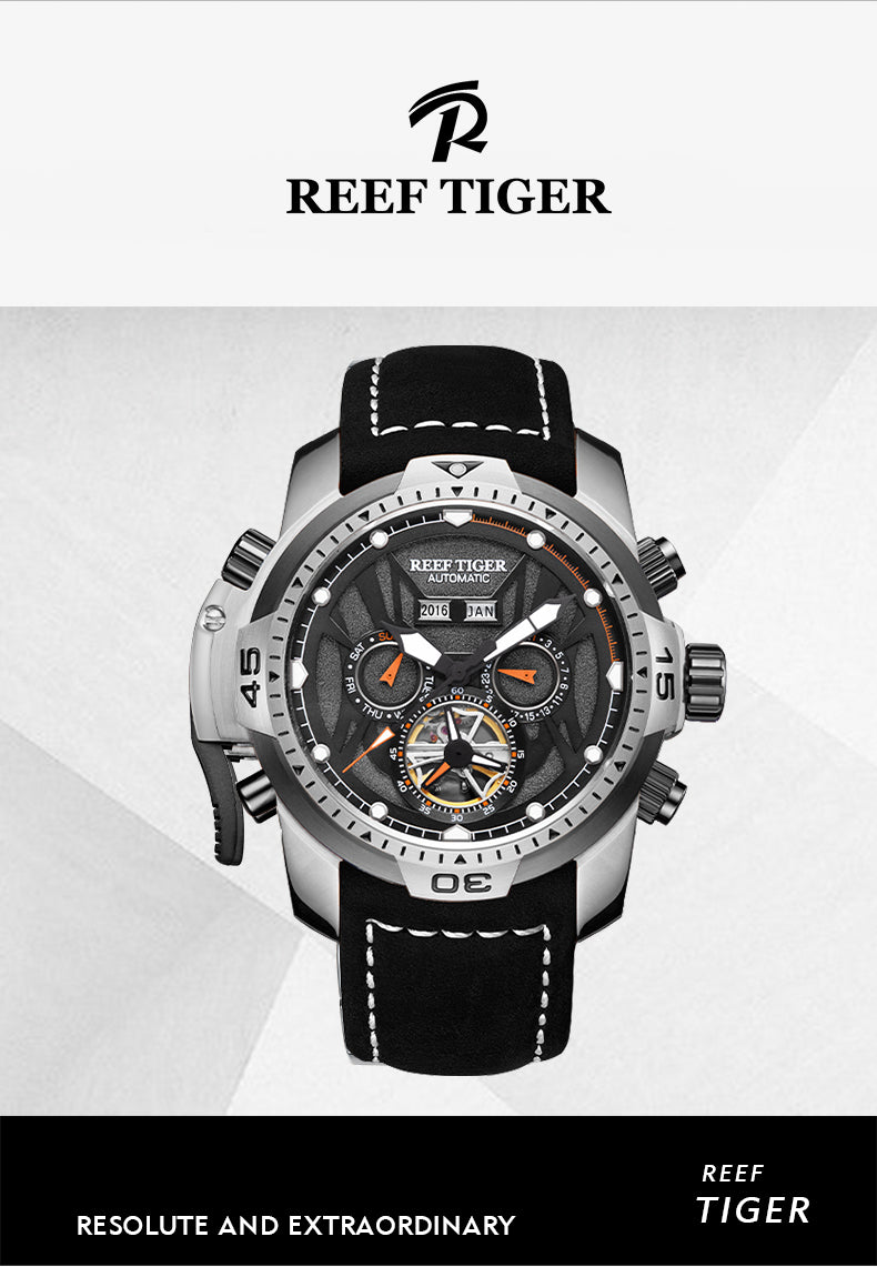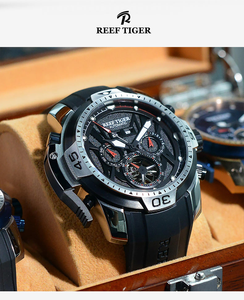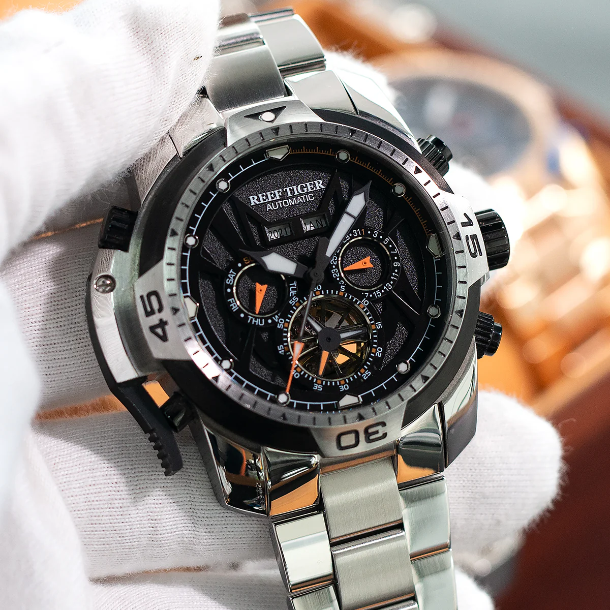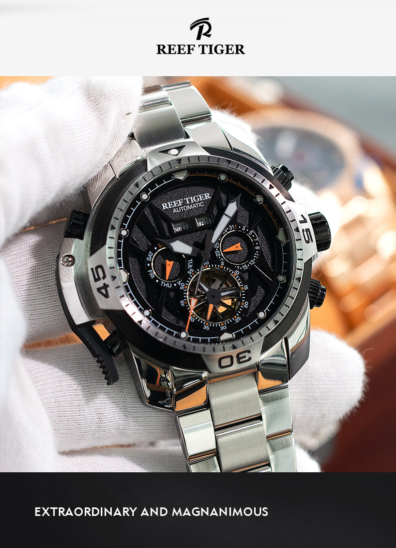 Dial Design: Black Dial & Watch face is designed with year, month, date, day, orange luminous watch hands display & tourbillon style dial.