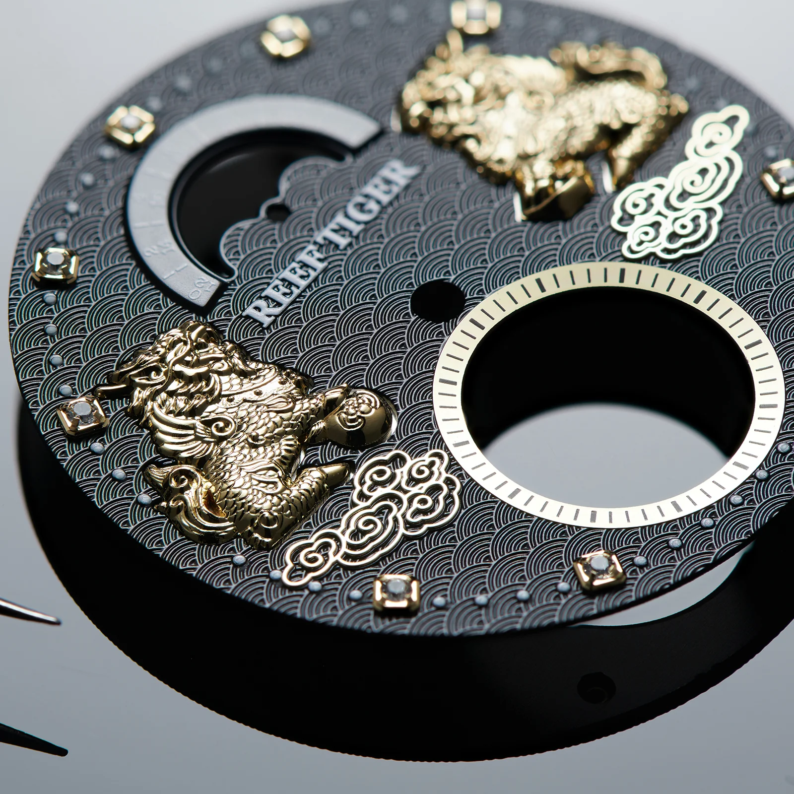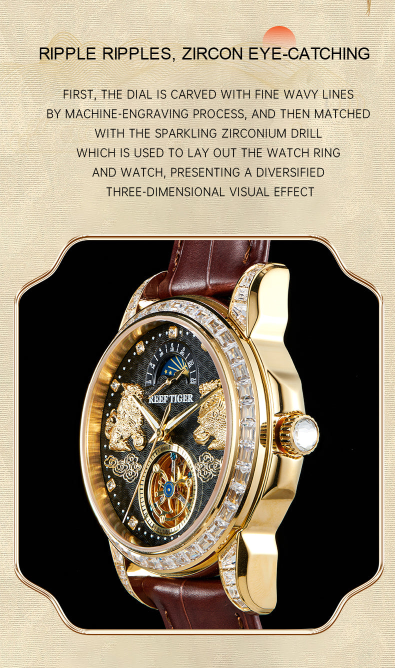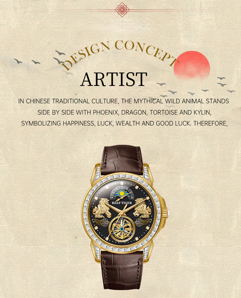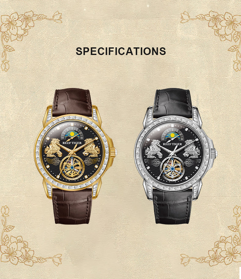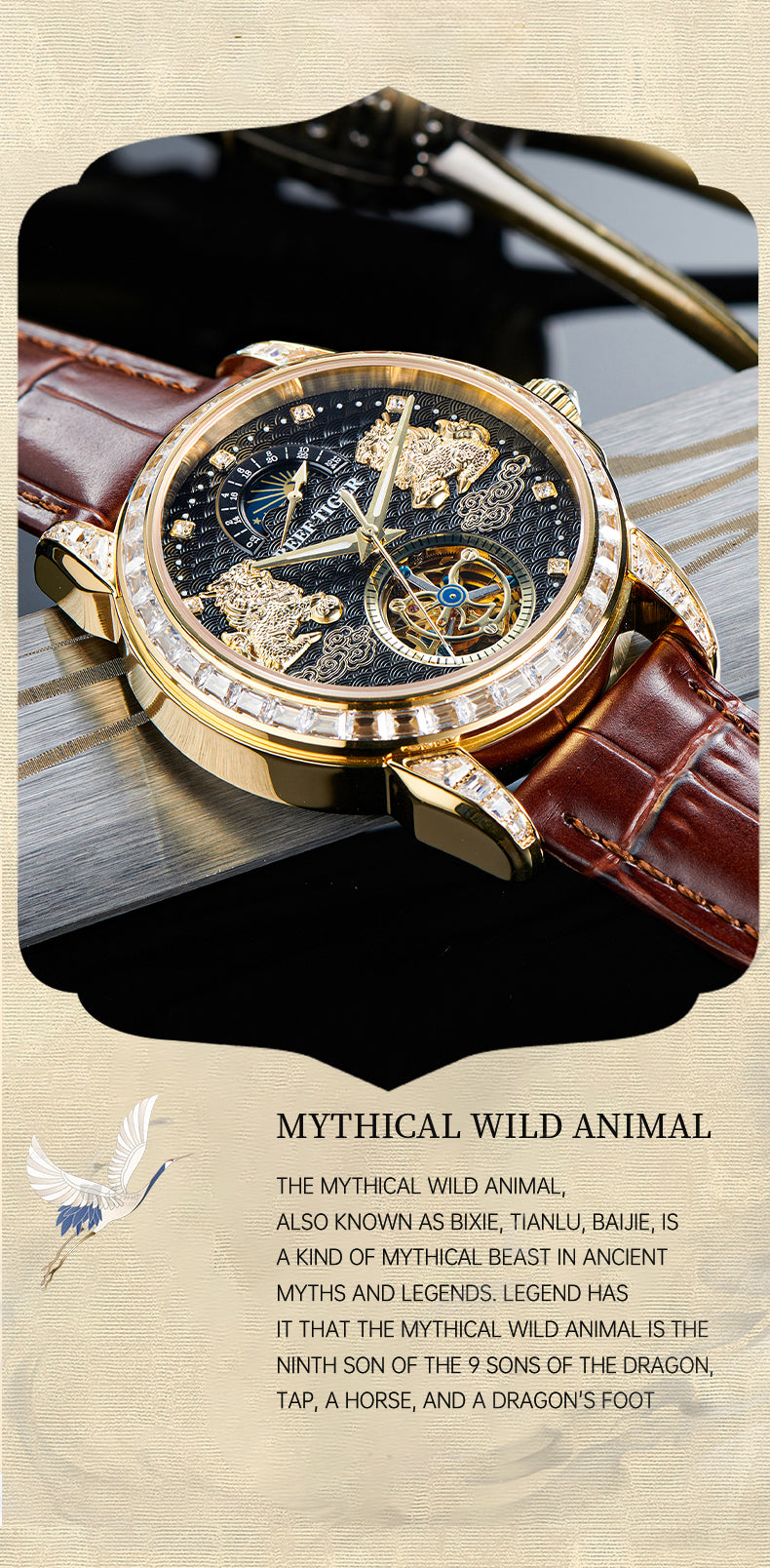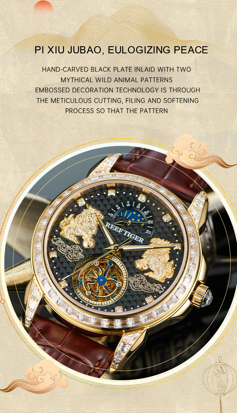 Dial Design: Black Dial & Engraving Yellow Gold Color "Pixiu" ( "Pixiu" is a symbol for wealth, good fortune, and protection). Watch face is designed with 24 hours instruction, luminous hands display. The dial is carved with fine wavy lines by machine-engraving process, and then matched with the sparkling zirconium drill which is used to lay out the watch ring and watch, presenting a diversified three-dimensional visual effect.