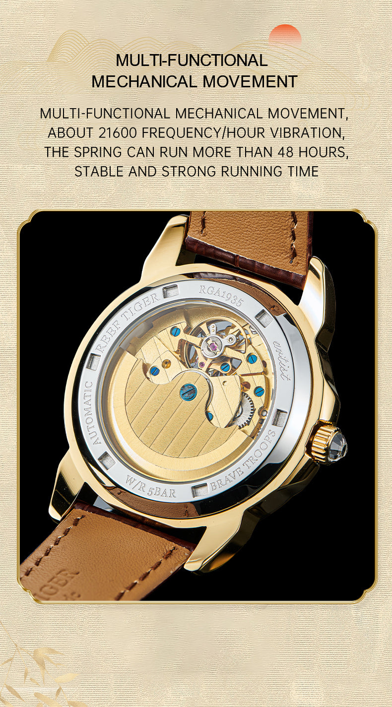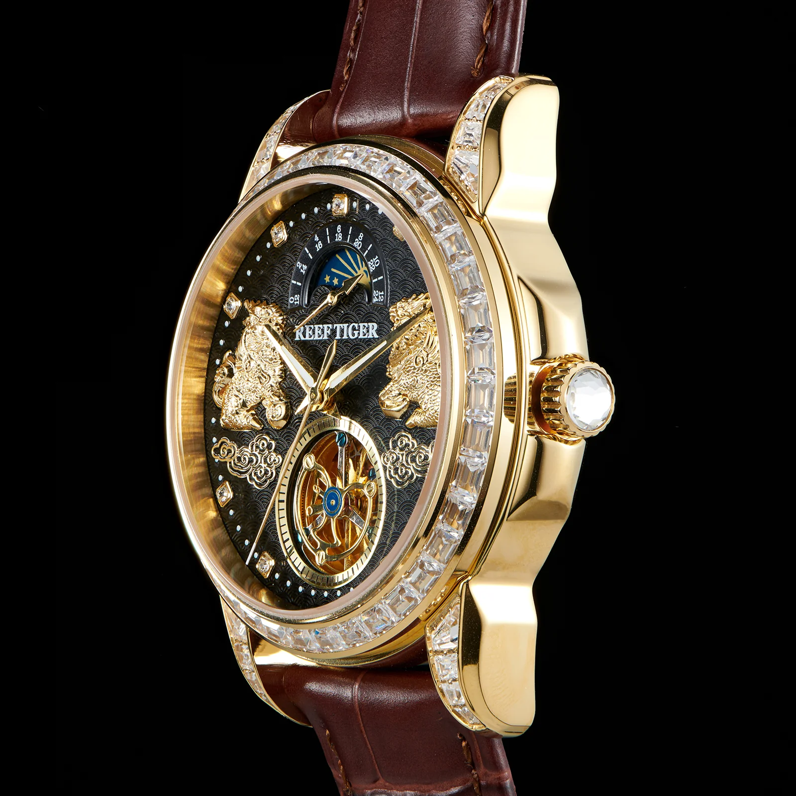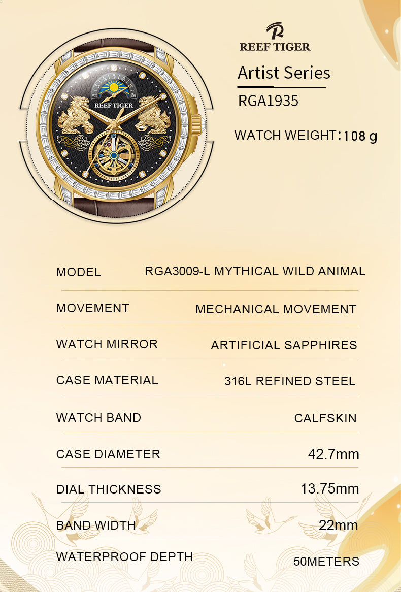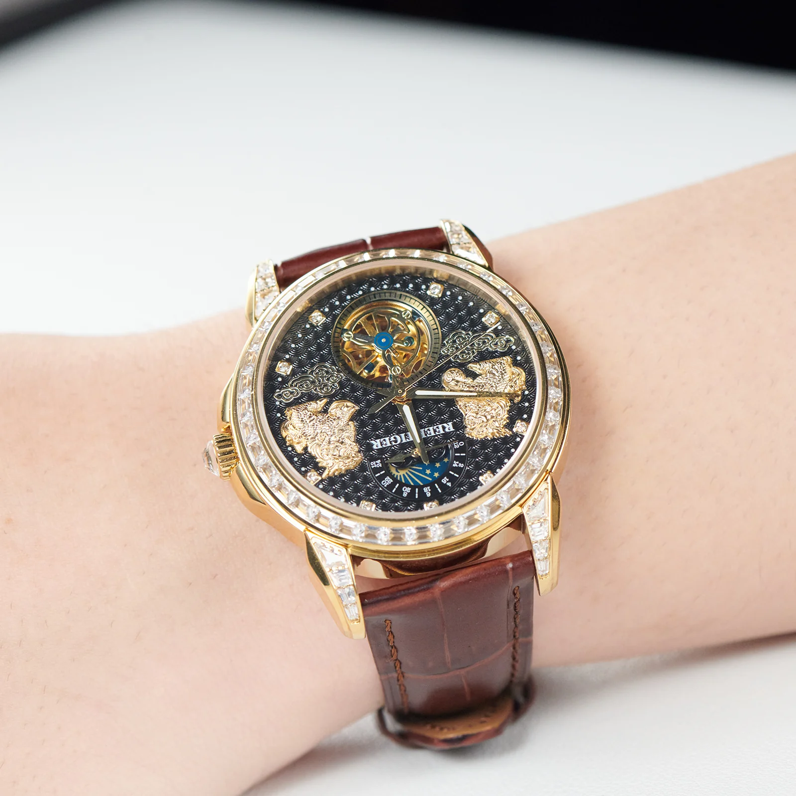 Dial Design: Black Dial & Engraving Yellow Gold Color "Pixiu" ( "Pixiu" is a symbol for wealth, good fortune, and protection). Watch face is designed with 24 hours instruction, luminous hands display. The dial is carved with fine wavy lines by machine-engraving process, and then matched with the sparkling zirconium drill which is used to lay out the watch ring and watch, presenting a diversified three-dimensional visual effect.