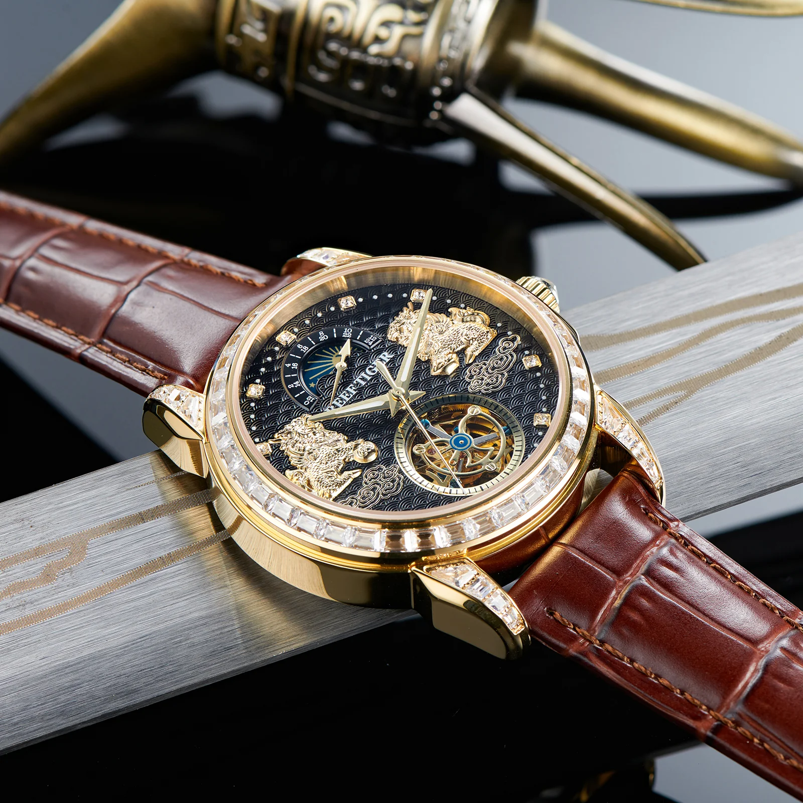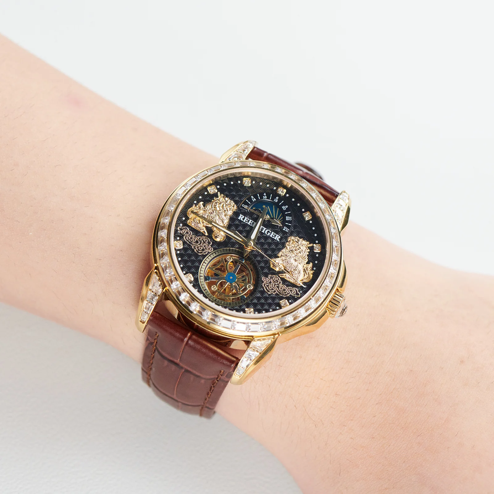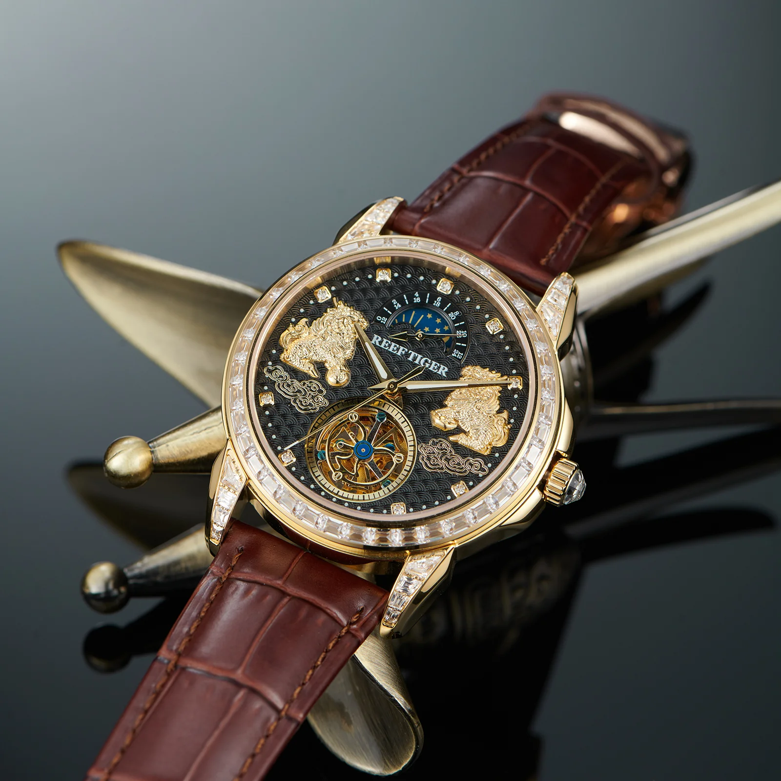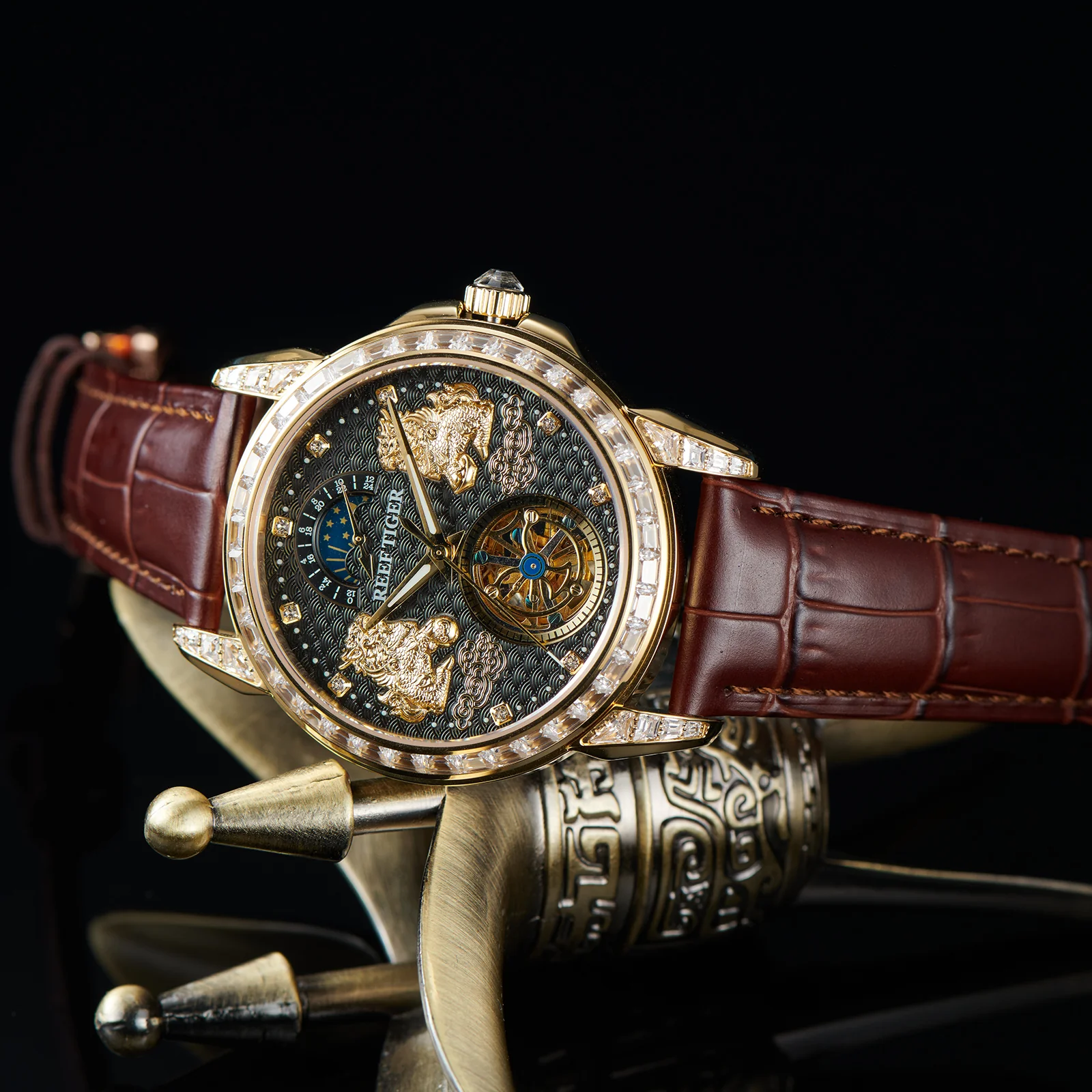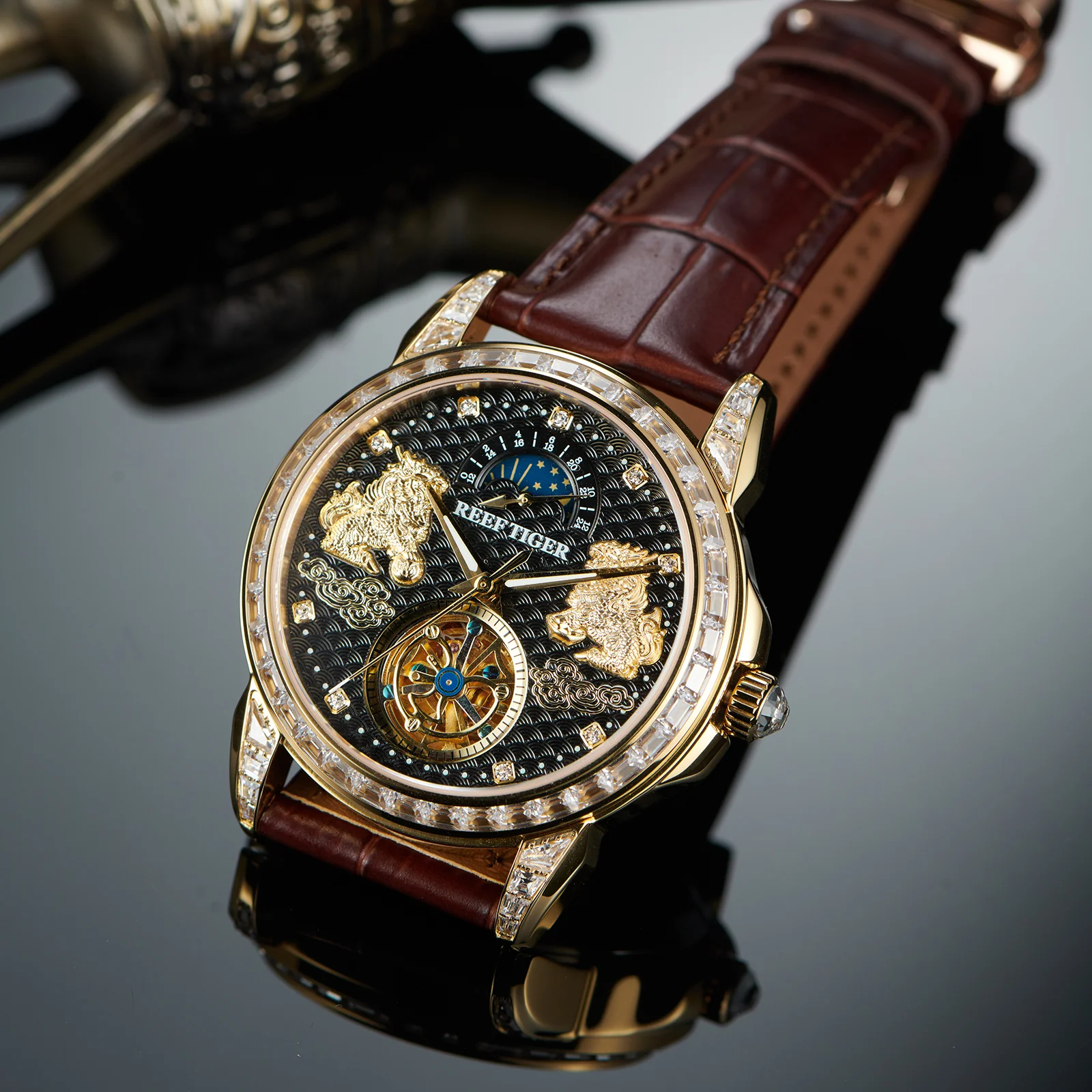 Dial Design: Black Dial & Engraving Yellow Gold Color "Pixiu" ( "Pixiu" is a symbol for wealth, good fortune, and protection). Watch face is designed with 24 hours instruction, luminous hands display. The dial is carved with fine wavy lines by machine-engraving process, and then matched with the sparkling zirconium drill which is used to lay out the watch ring and watch, presenting a diversified three-dimensional visual effect.