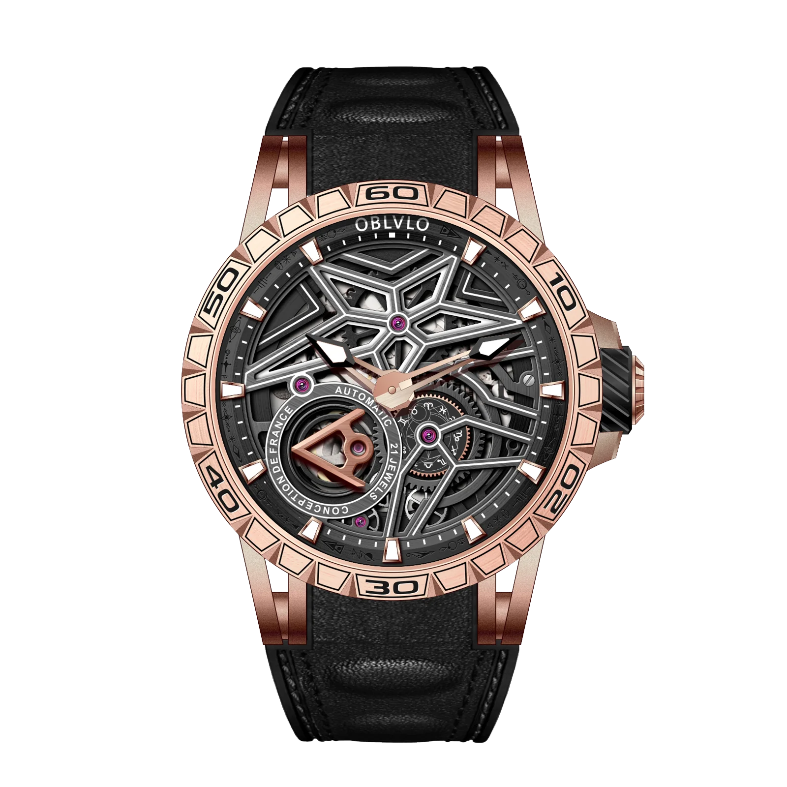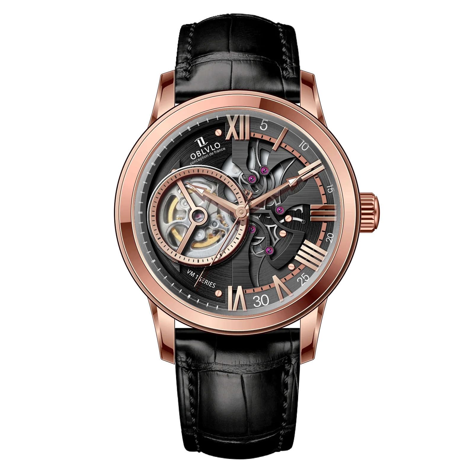 Best Affordable Luxury Rose Gold & Zirconia Case Mens Automatic Tourbillon Style Dial Dress Watches - OBLVLO VMQ Series