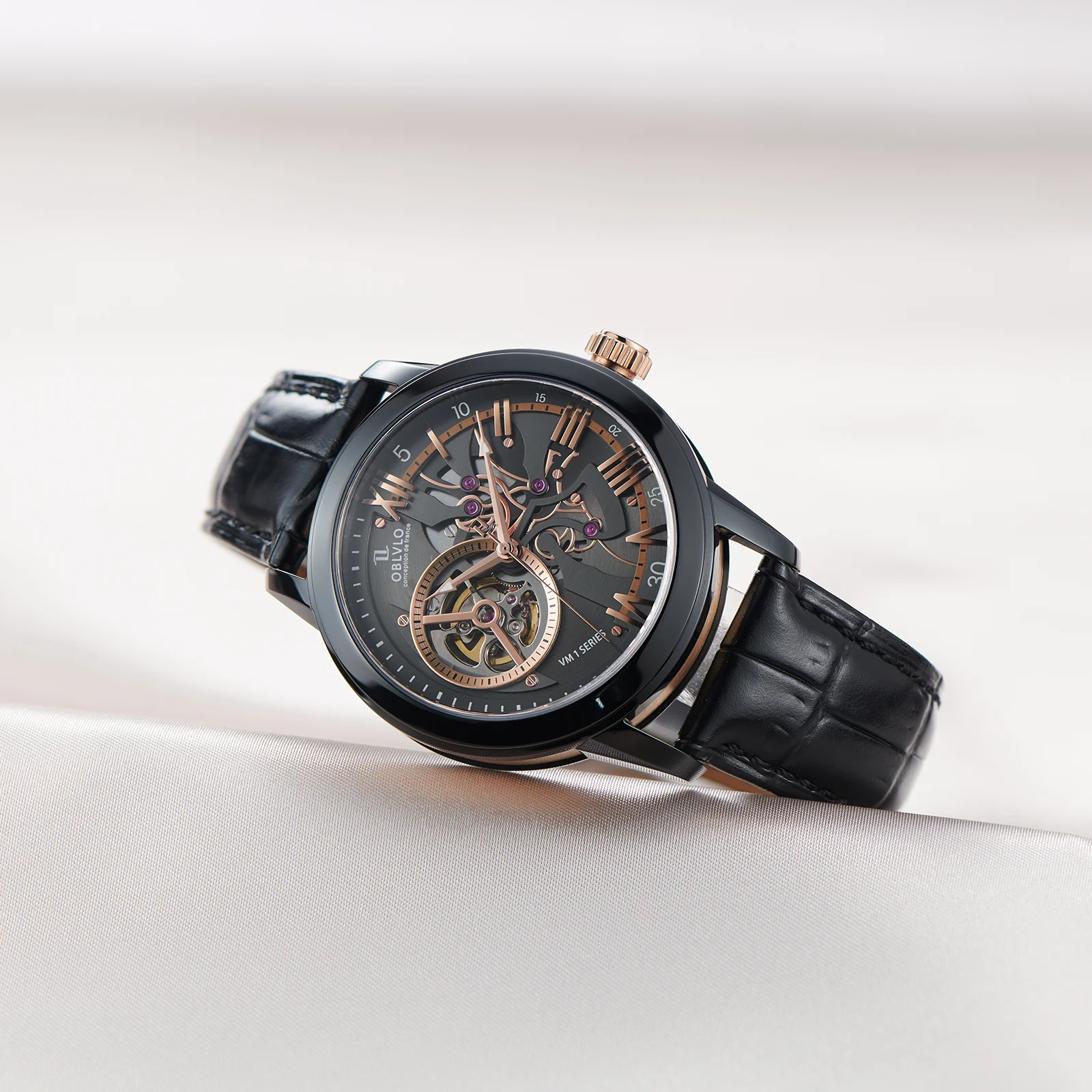OBLVLO LMQ Cool Luxury Mens Automatic Skeleton Black PVD Case Watches - 42mm Men Mechanical Waterproof Watch