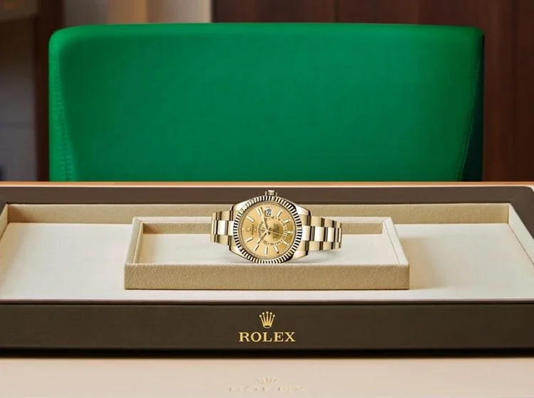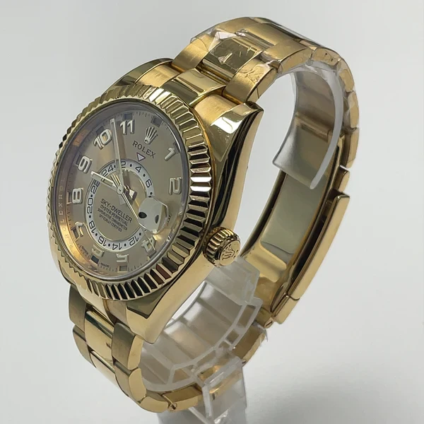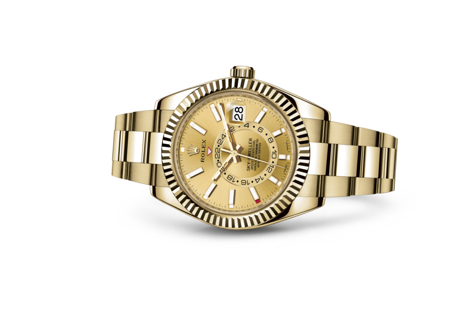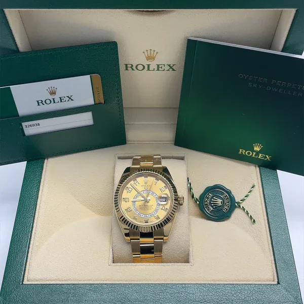 BRAND : Rolex MODEL : Sky-Dweller MODEL NUMBER : 326938-0003 MODEL CASE : Oyster, 42 mm, yellow gold OYSTER ARCHITECTURE : Monobloc middle case, screw-down case back and winding crown DIAMETER : 42 mm MATERIAL : 18 ct yellow gold BEZEL : Fluted, bidirectional rotatable Rolex Ring Command WINDING CROWN : Screw-down, Twinlock double waterproofness system CRYSTAL : Scratch-resistant sapphire, Cyclops lens over the date WATER RESISTANCE : Waterproof to 100 metres / 330 feet MOVEMENT : Perpetual, mechanical, self-winding, dual time zones, annual calendar CALIBRE : 9001, Manufacture Rolex PRECISION : -2/+2 sec/day, after casing FUNCTIONS : Centre hour, minute and seconds hands. 24-hour display on off-centre disc. Second time zone. Instantaneous annual calendar at 3 o'clock and rapid-setting of the date. Month display via 12 apertures around the circumference of the dial. Stop-seconds for precise time setting OSCILLATOR : Paramagnetic blue Parachrom hairspring. High-performance Paraflex shock absorbers WINDING : Bidirectional self-winding via Perpetual rotor POWER RESERVE : Approximately 72 hours BRACELET : Oyster, flat three-piece links BRACELET MATERIAL : 18 ct yellow gold CLASP : Folding Oysterclasp with Easylink 5 mm comfort extension link DIAL : Champagne-Colour DETAILS : Highly legible Chromalight display with long-lasting blue luminescence CERTIFICATION : Superlative Chronometer (COSC + Rolex certification after casing)