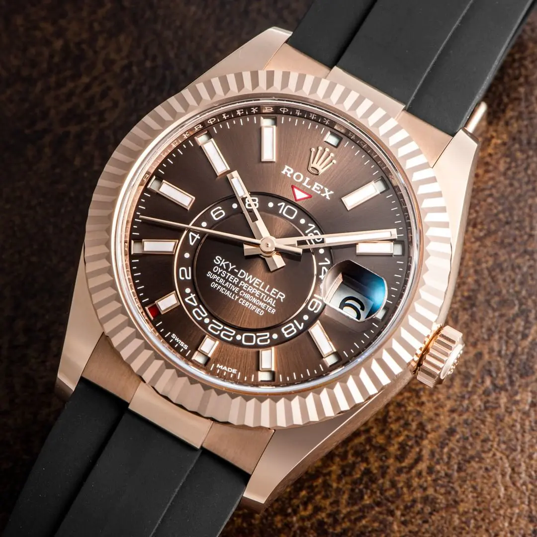 THE OYSTER PERPETUAL SKY-DWELLER IN 18 CT EVEROSE GOLD WITH A CHOCOLATE DIAL AND AN OYSTERFLEX BRACELET.