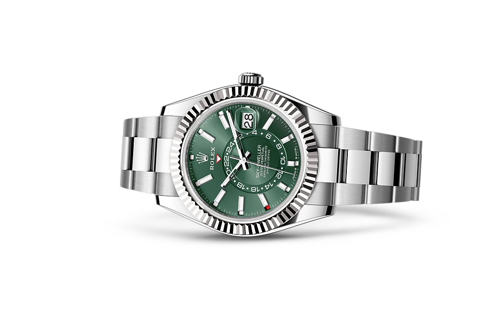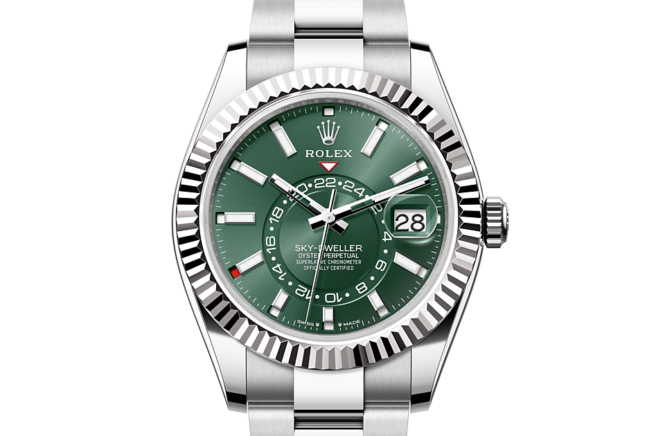 The Rolex fluted bezel is a mark of distinction. Originally, the fluting of the Oyster bezel had a functional purpose: it served to screw the bezel onto the case, helping to ensure the waterproofness of the watch. It was therefore identical to the fluting on the case back, which was also screwed onto the case for waterproofness, using specific Rolex tools. Over time, the fluting became an aesthetic element, a genuine Rolex signature feature. Today the fluted bezel is a mark of distinction, always in gold. The Sky-Dweller is equipped with a mechanism of interaction between the rotatable bezel, the winding crown and the movement: the Ring Command system, which allows the user to select the watch's functions one-by-one and to set them easily, quickly and securely.