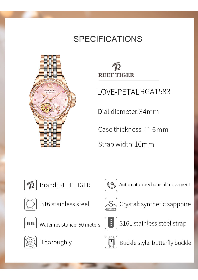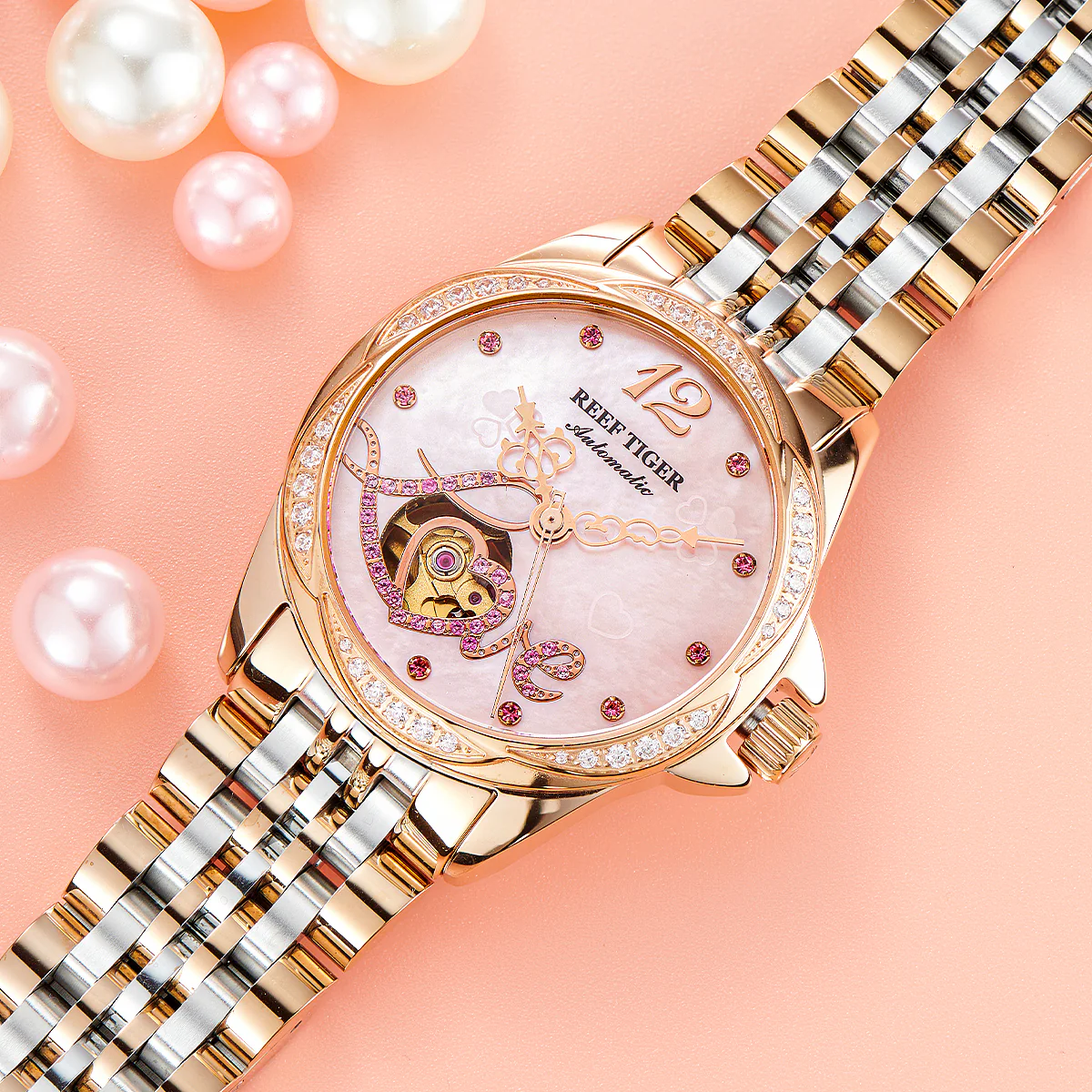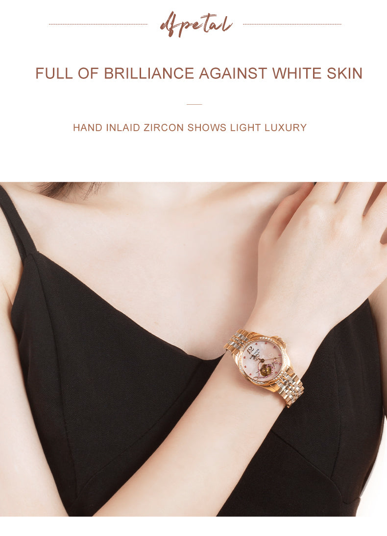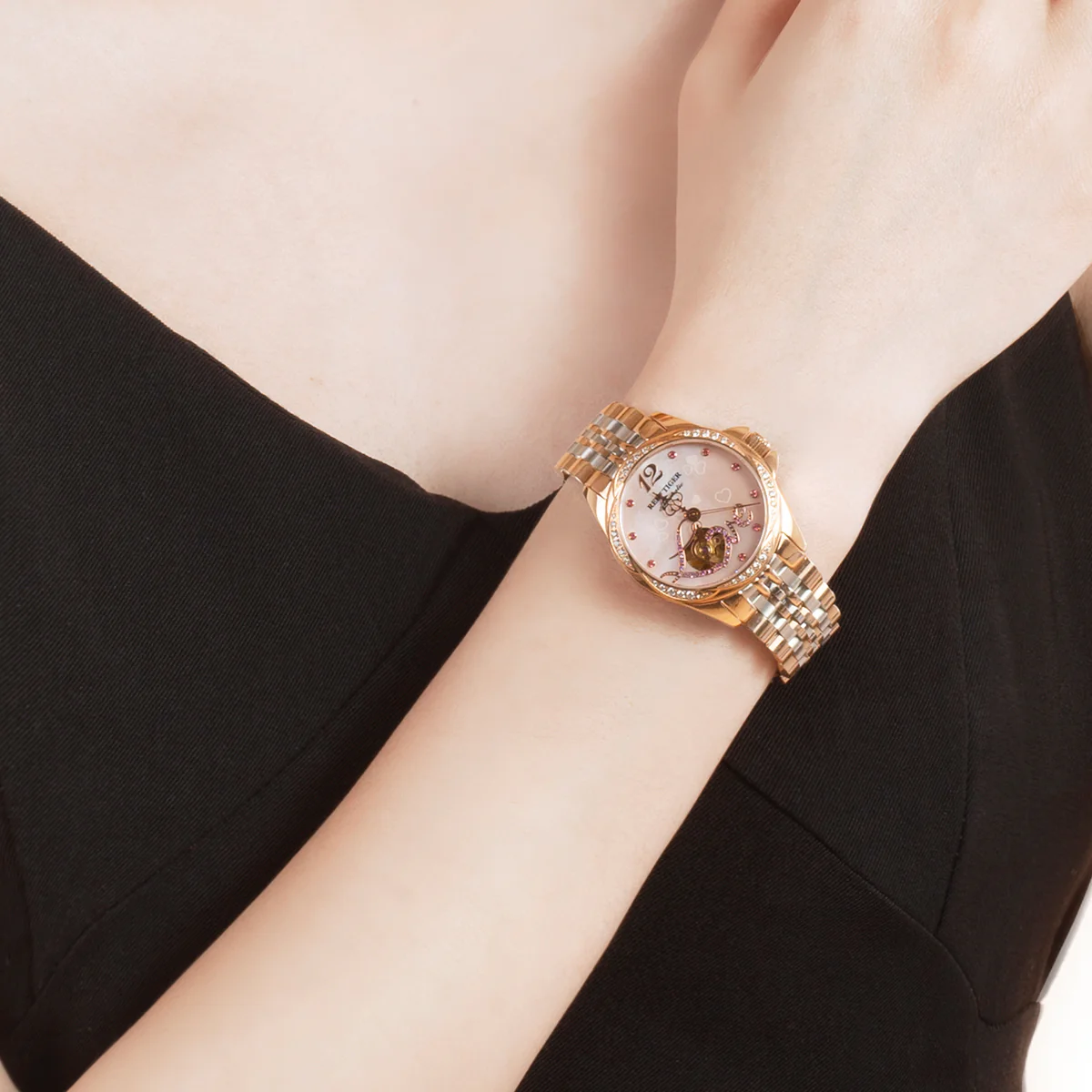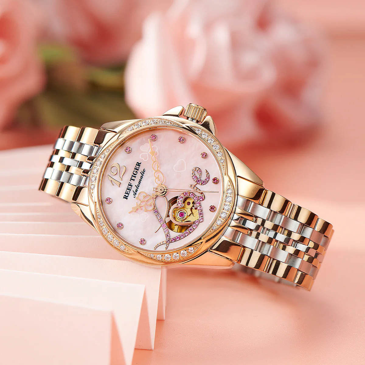 Dial Design: Pink Zirconia inlay Love word Skeleton And Pink Color Zirconia inlay collocation Pink shell pattern dial and Flower Bezel, Shows the noble charm of women, shine extraordinary brilliance.