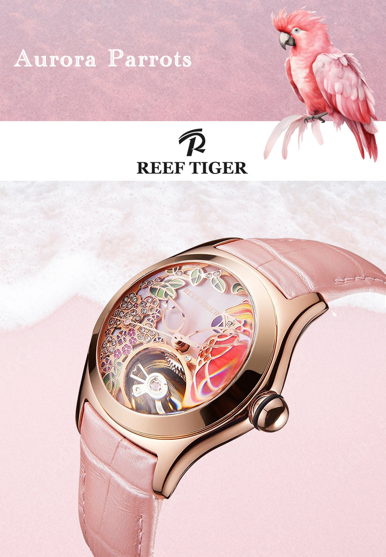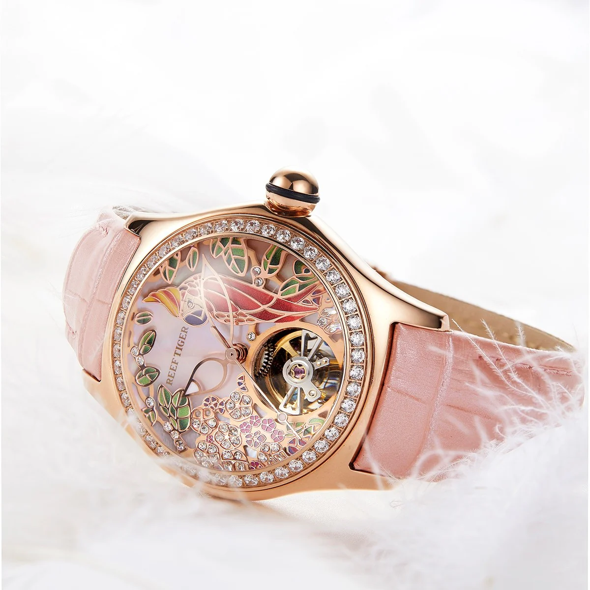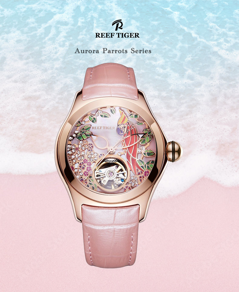 Dial Design: Pink Dial & Watch face is designed with Diamond citron crested cockatoo Dial & tourbillon style dial.