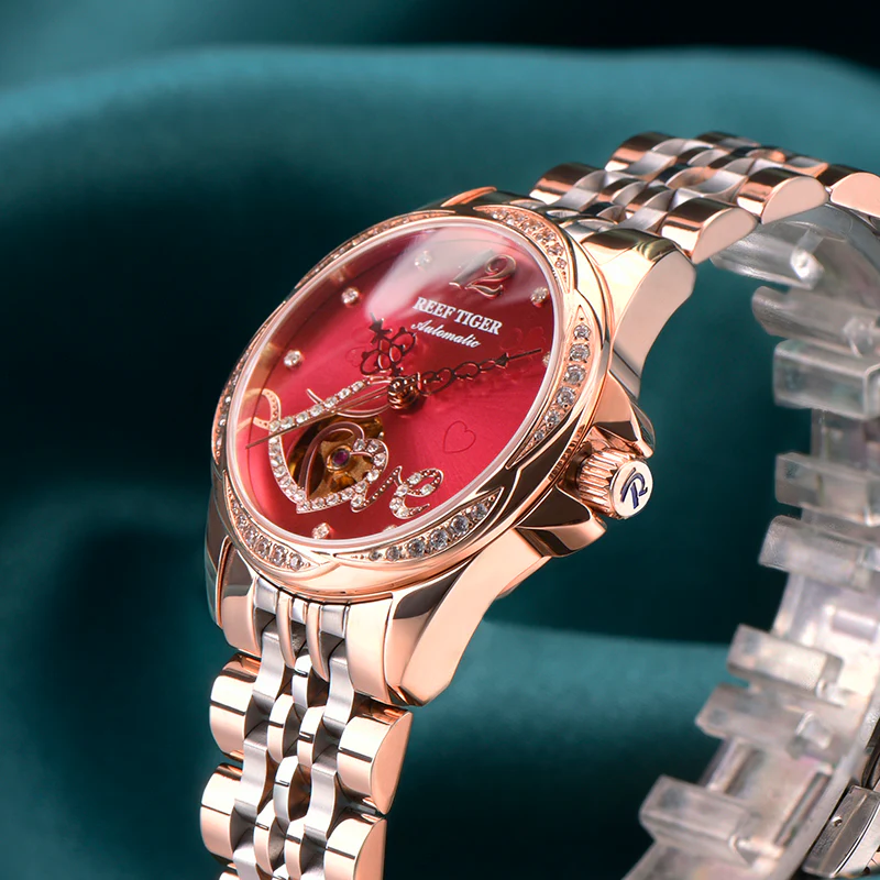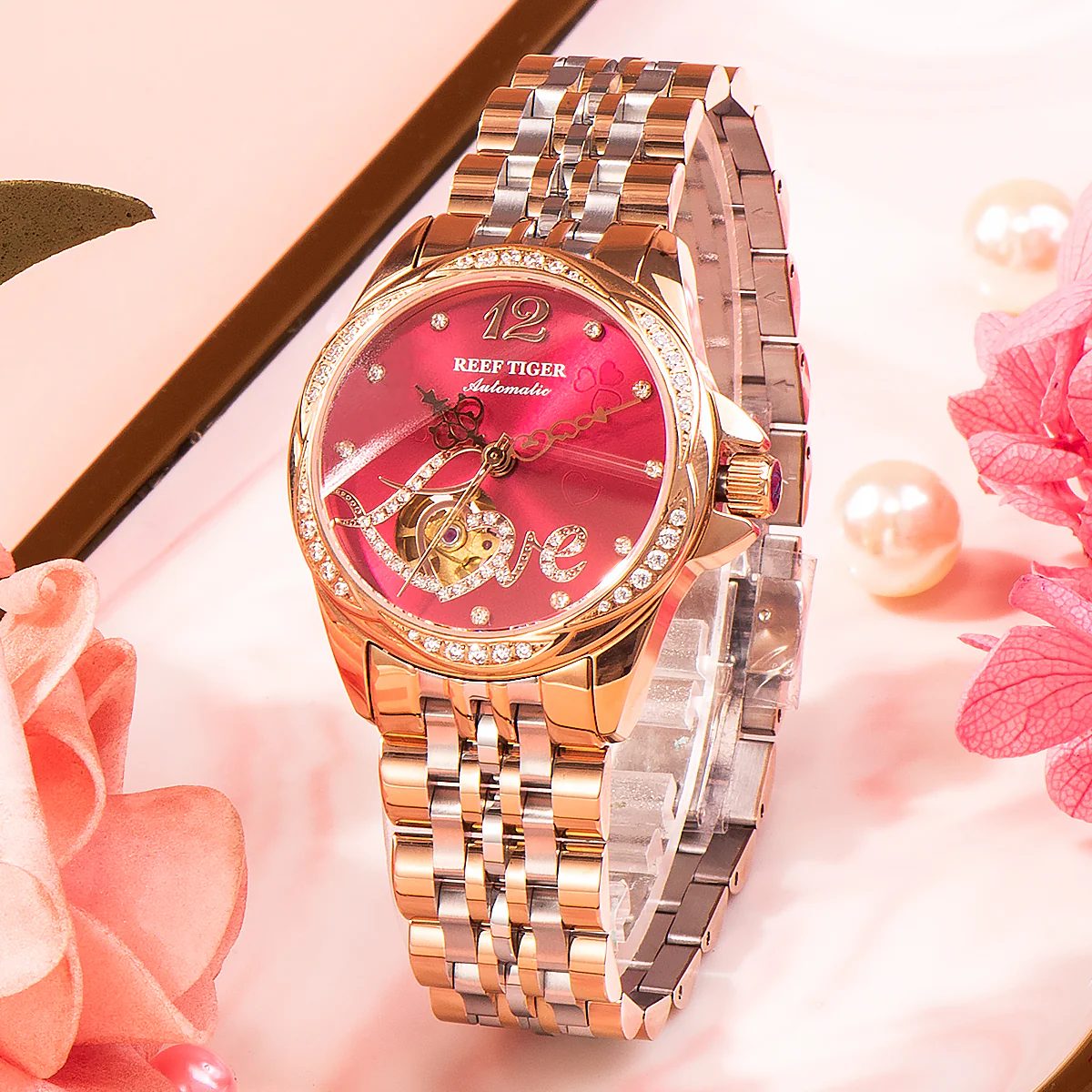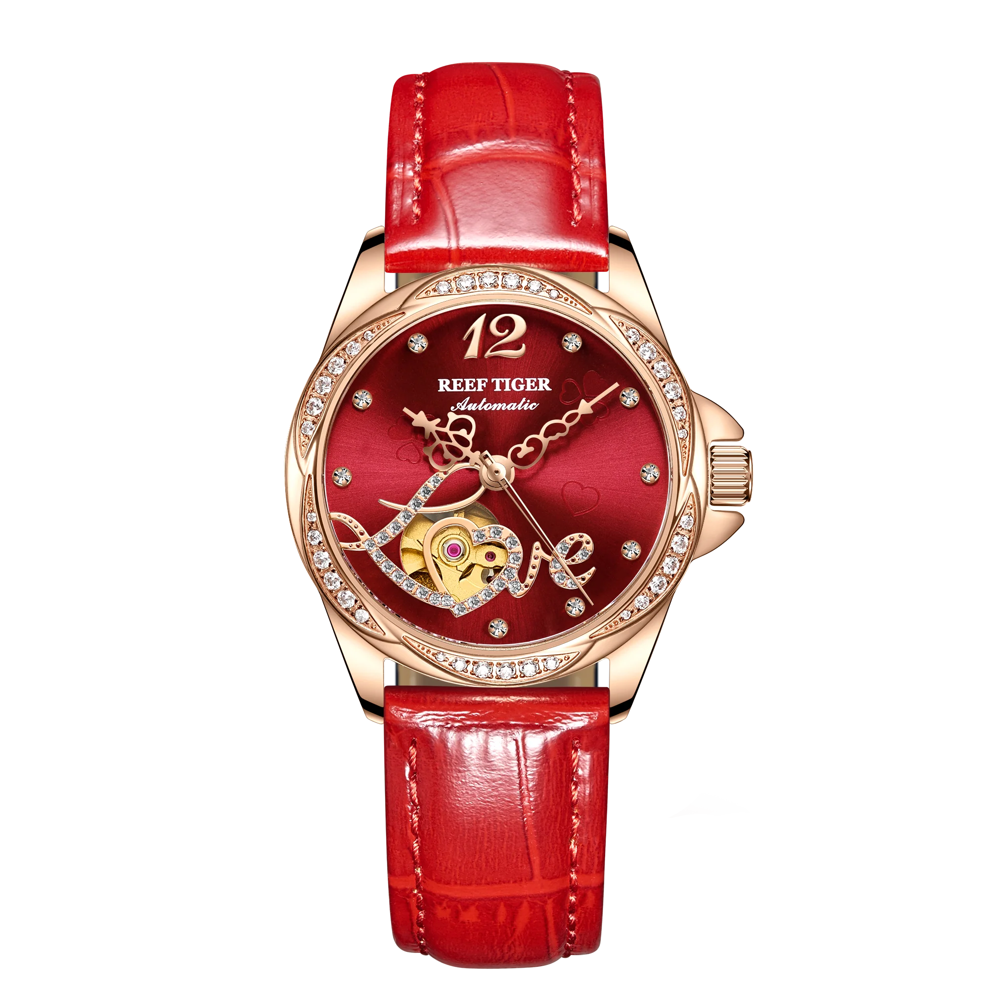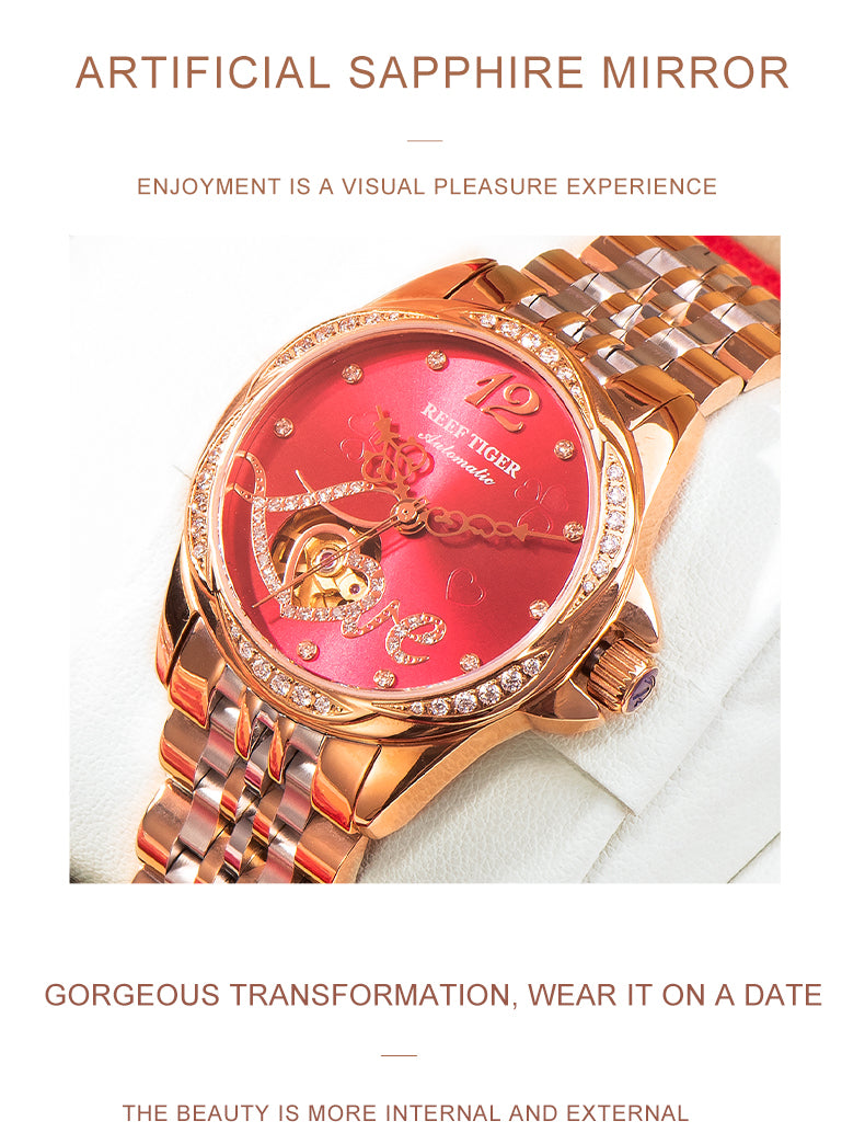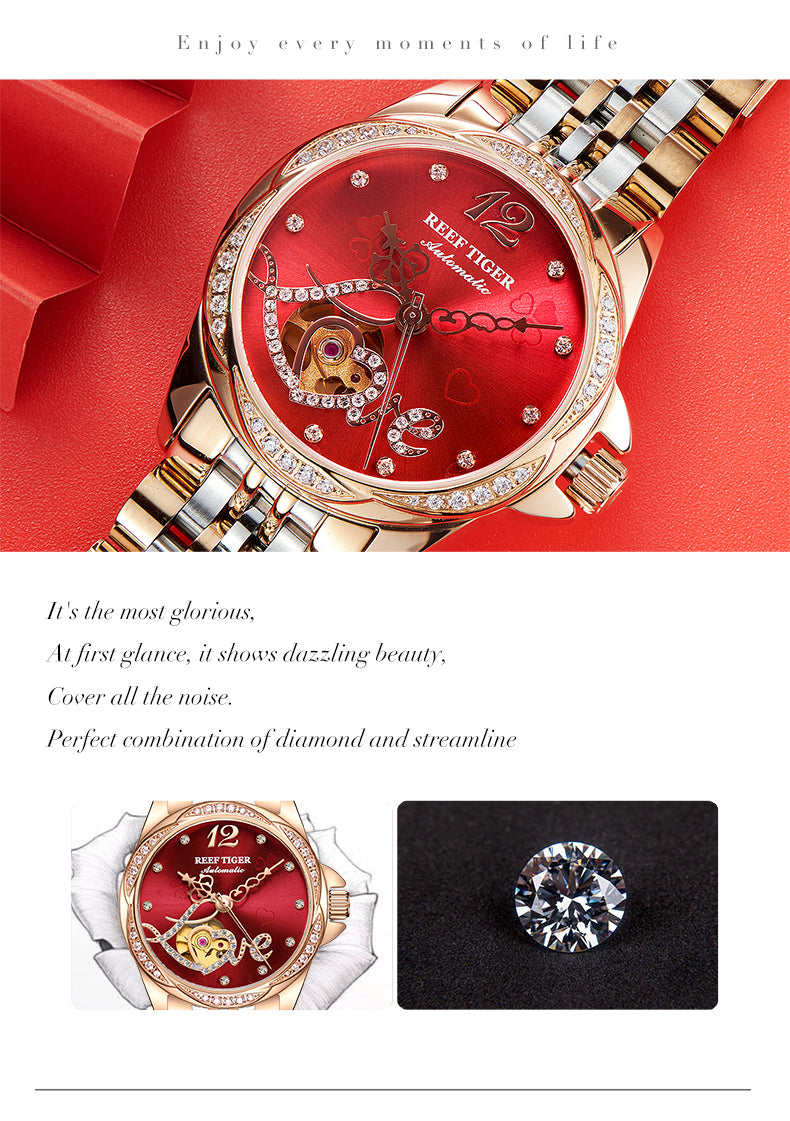Dial Design: White Zirconia inlay Love word Skeleton And White Color Zirconia inlay collocation Burgundy Red Gradient dial and Flower Bezel, Shows the noble charm of women, shine extraordinary brilliance.