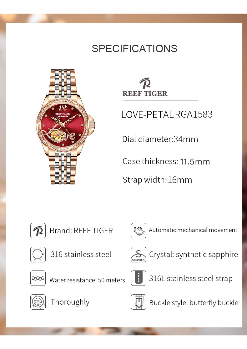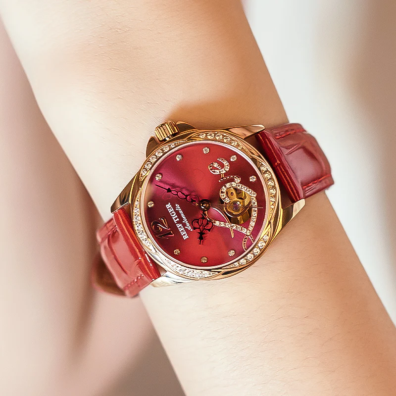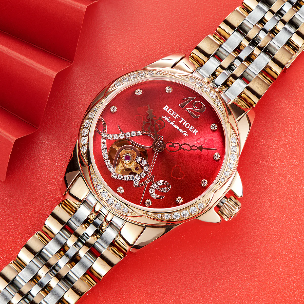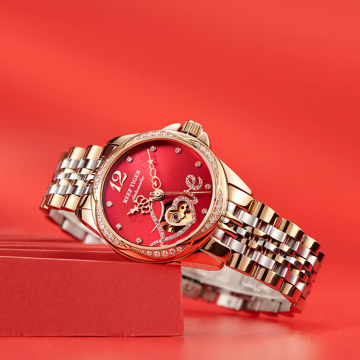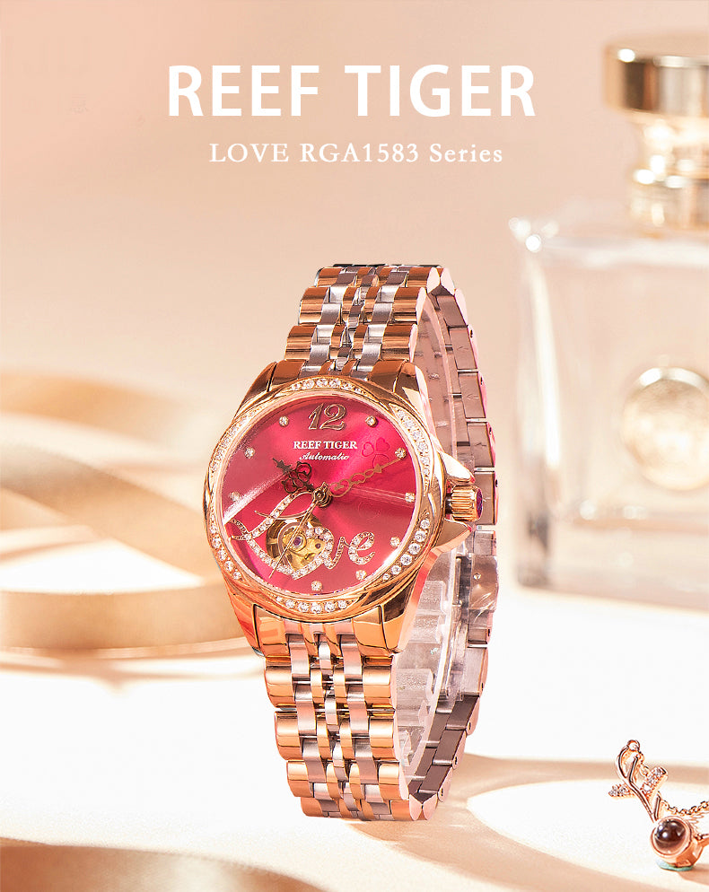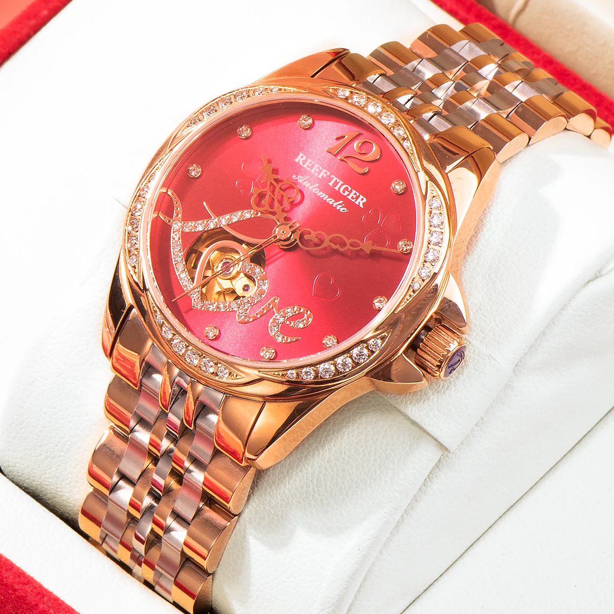 Dial Design: White Zirconia inlay Love word Skeleton And White Color Zirconia inlay collocation Burgundy Red Gradient dial and Flower Bezel, Shows the noble charm of women, shine extraordinary brilliance.