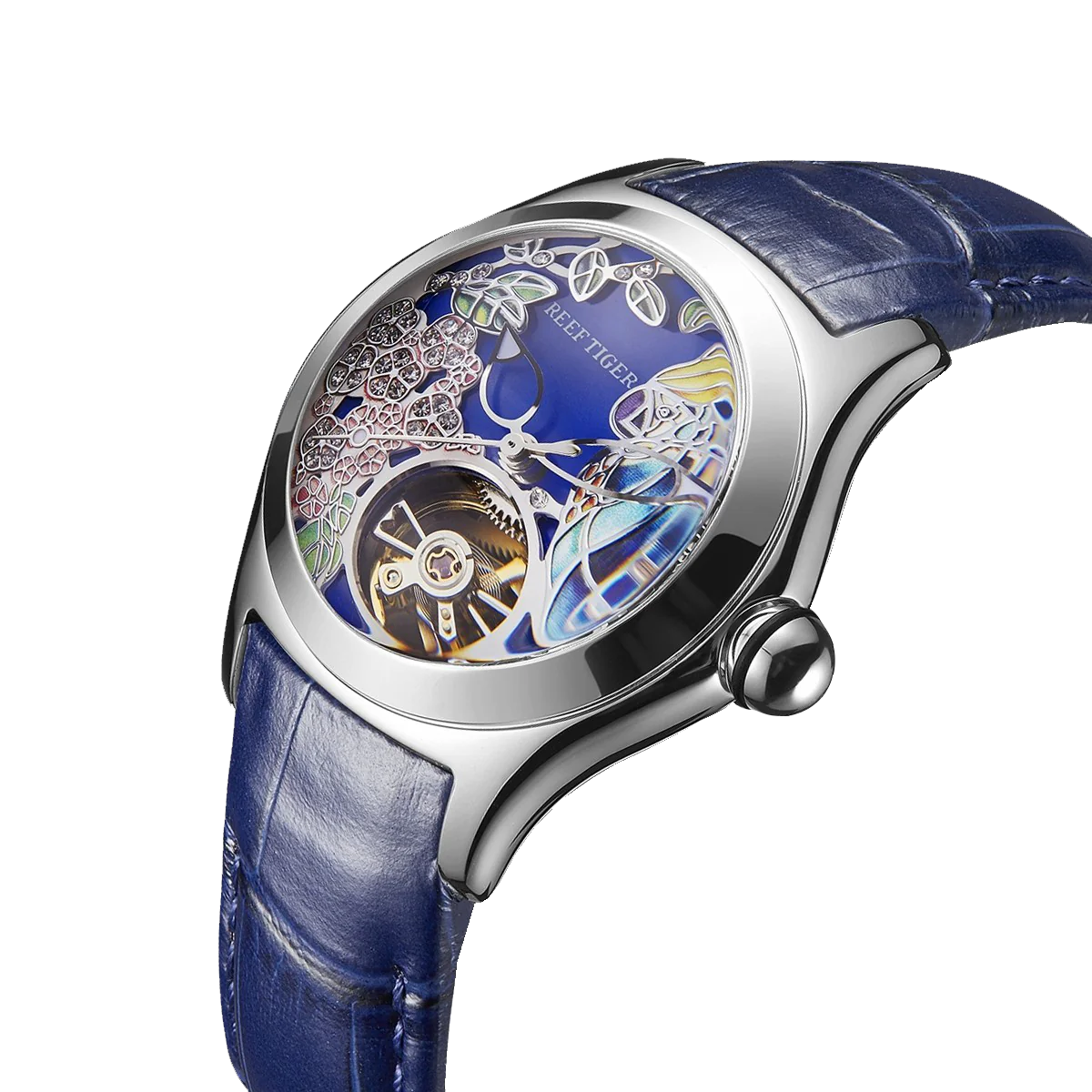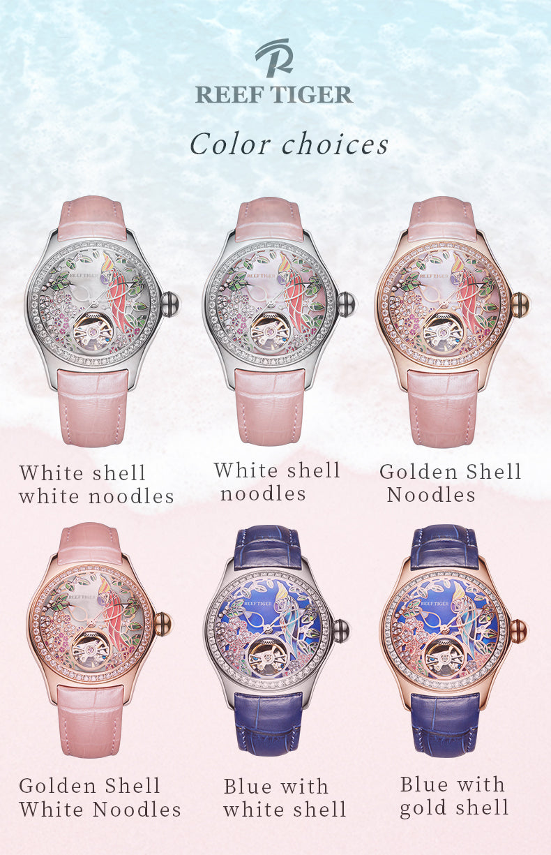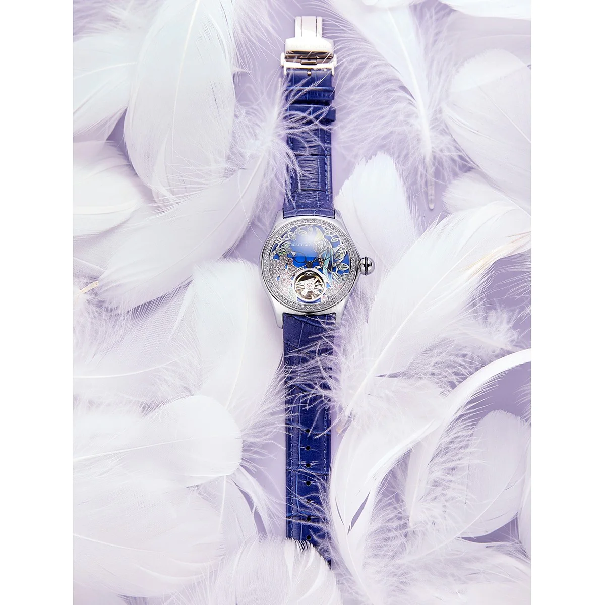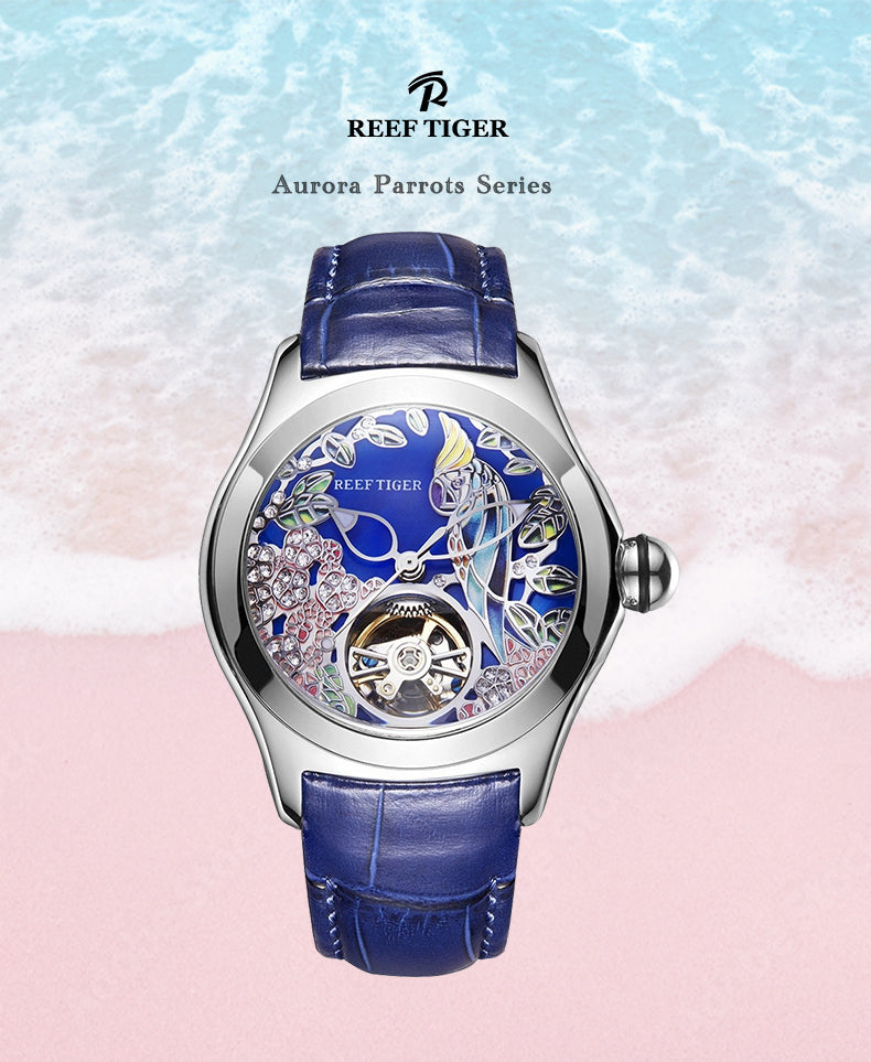 Dial Design: Blue Dial & Watch face is designed with Diamond citron crested cockatoo Dial & tourbillon style dial.